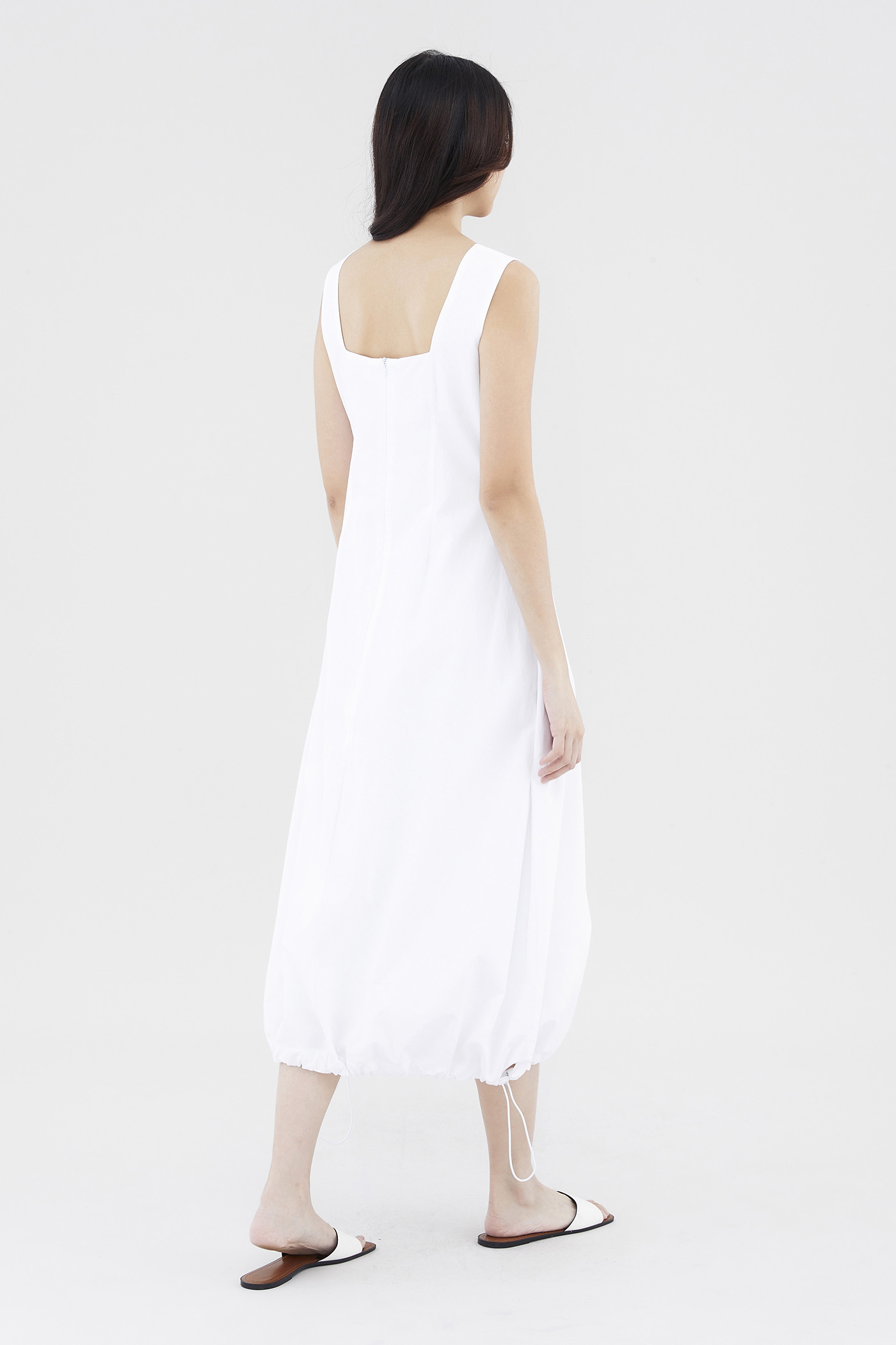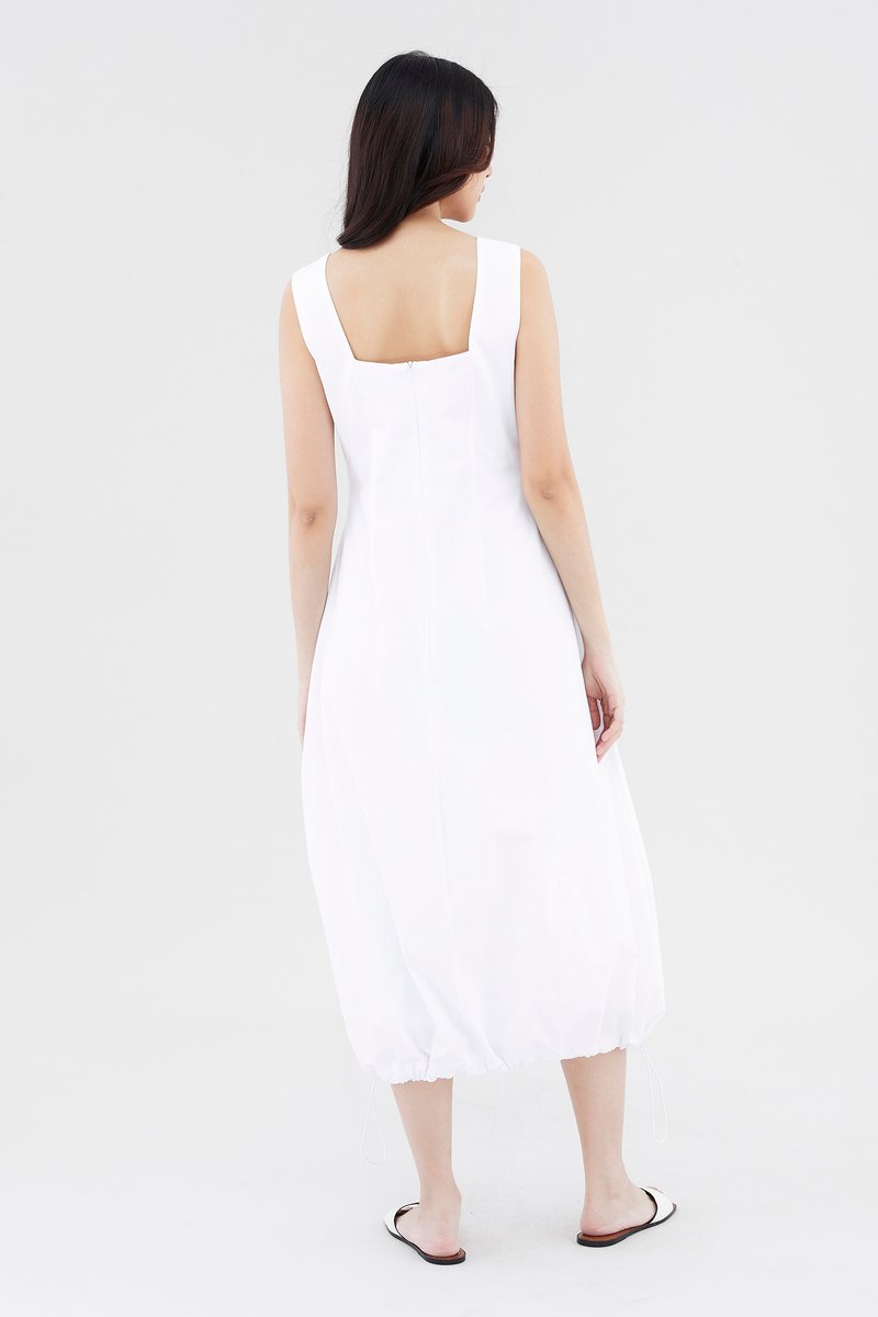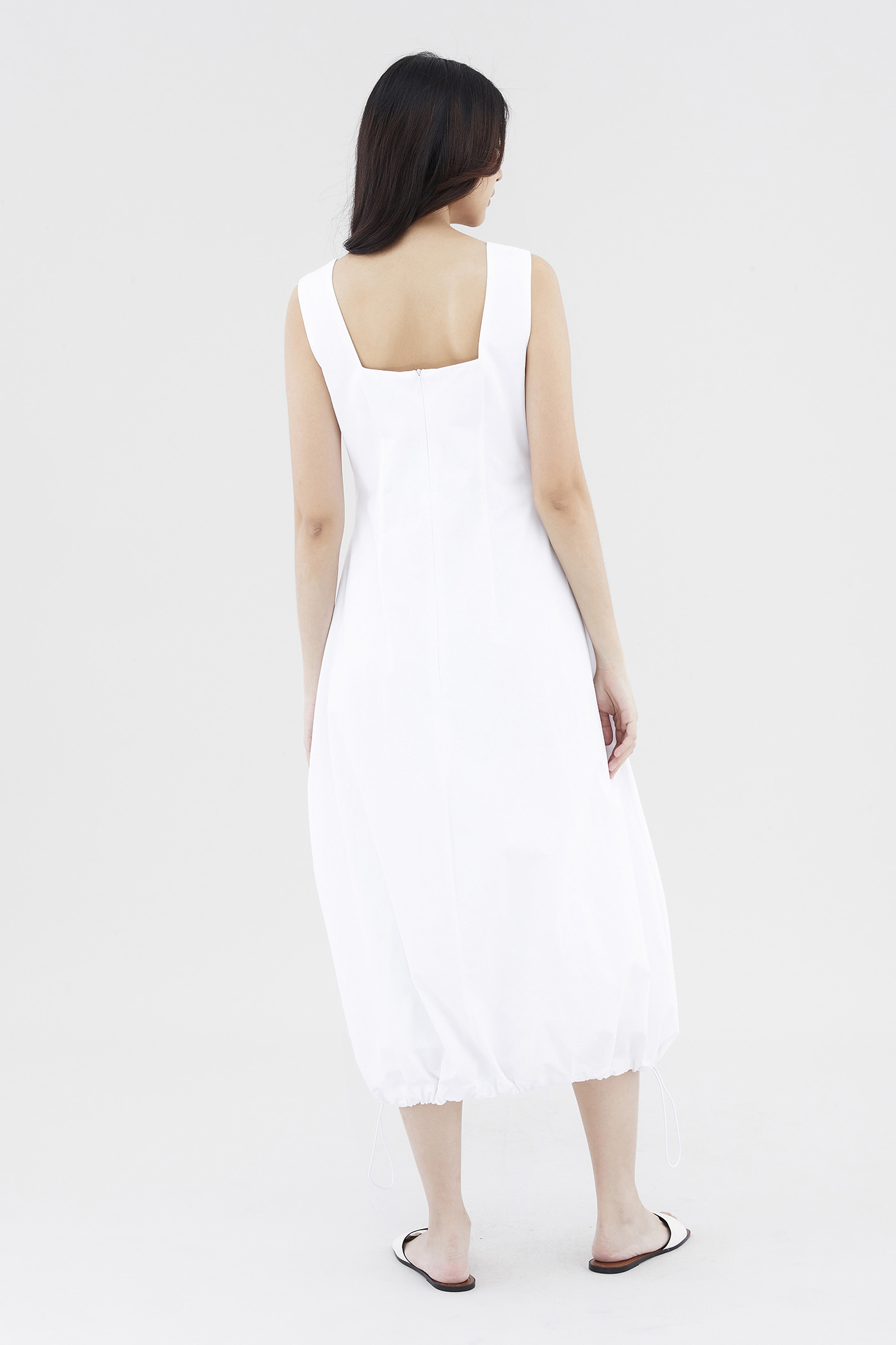 Leave an impression. Cut from crisp and gently structured cotton, this sleeveless midi-to-maxi dress features a square neckline, wide shoulder straps, a back zip closure and a bubble hemline with an adjustable toggle tie. Fits slim in a subtle A-line silhouette.