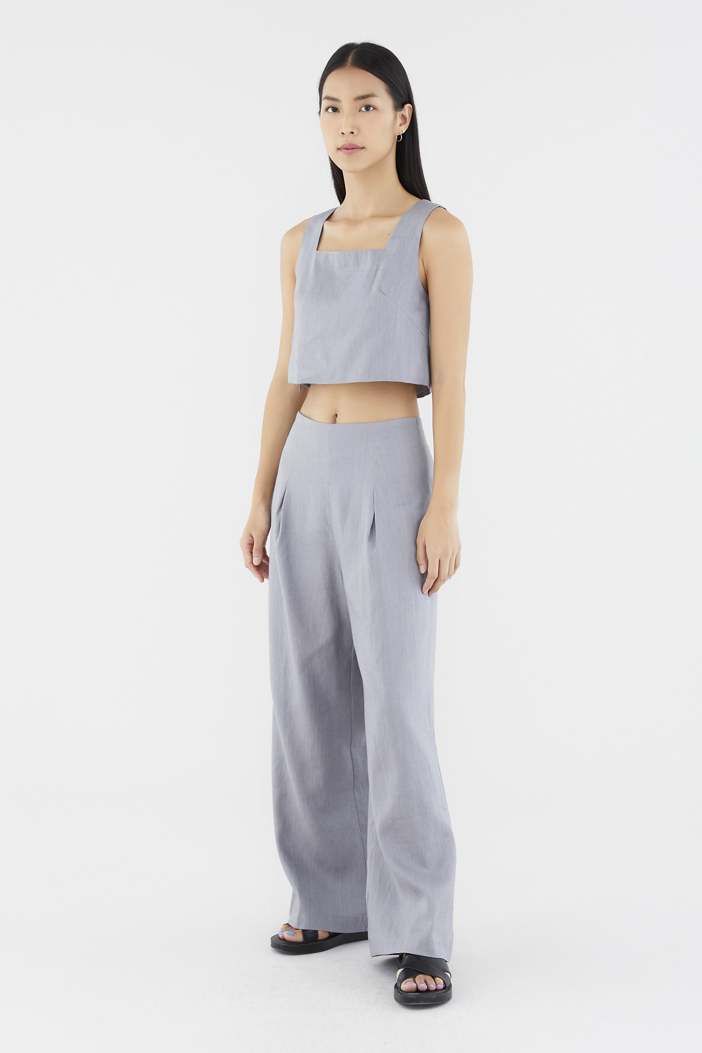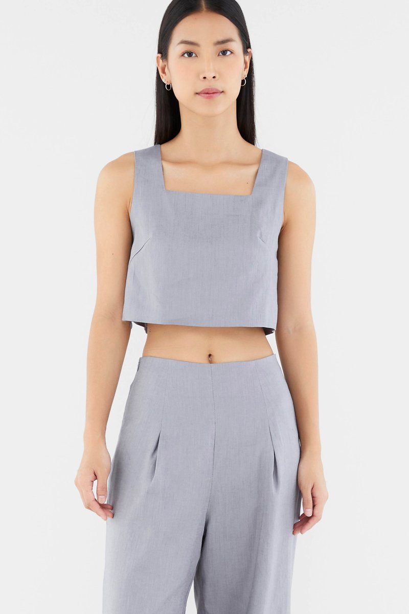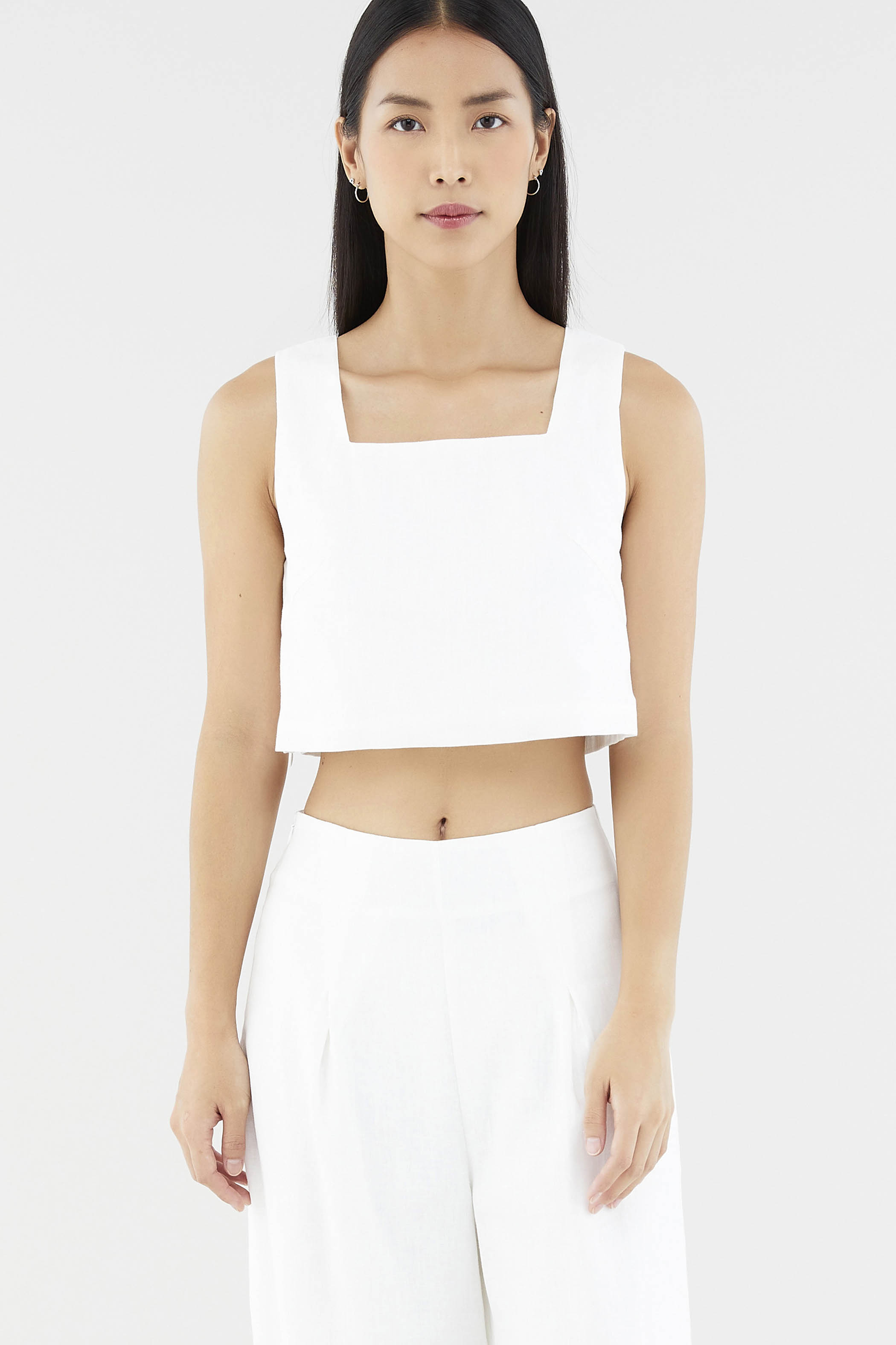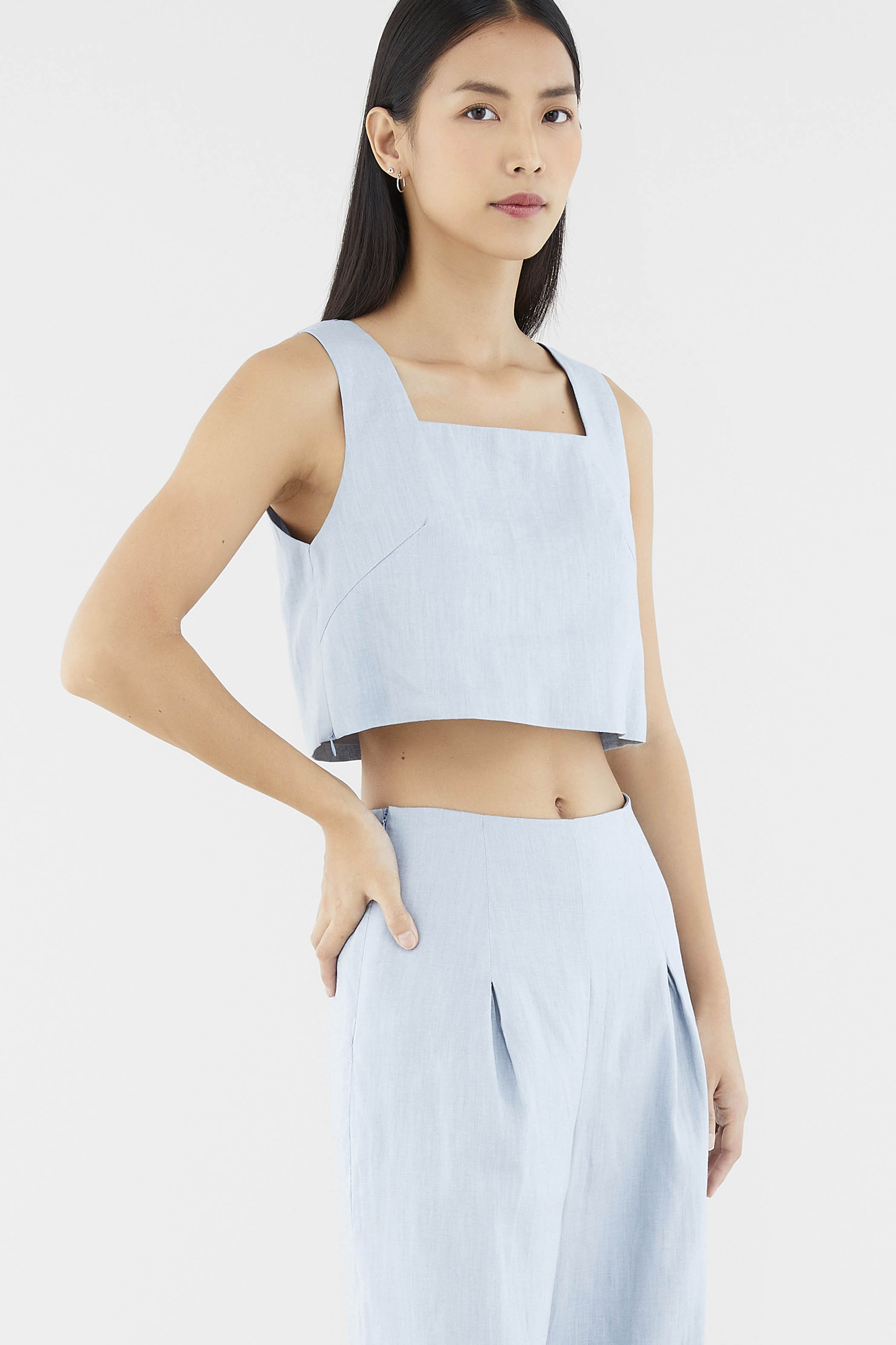 Beat the heat. Cut from airy and gently tailored 100% linen, this sleeveless top features a flattering boxy silhouette, a square neckline, wide shoulder straps and a side zip. Fits relaxed in a cropped length.