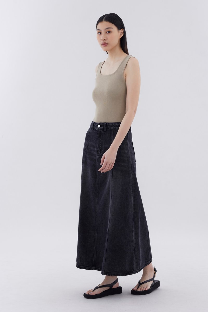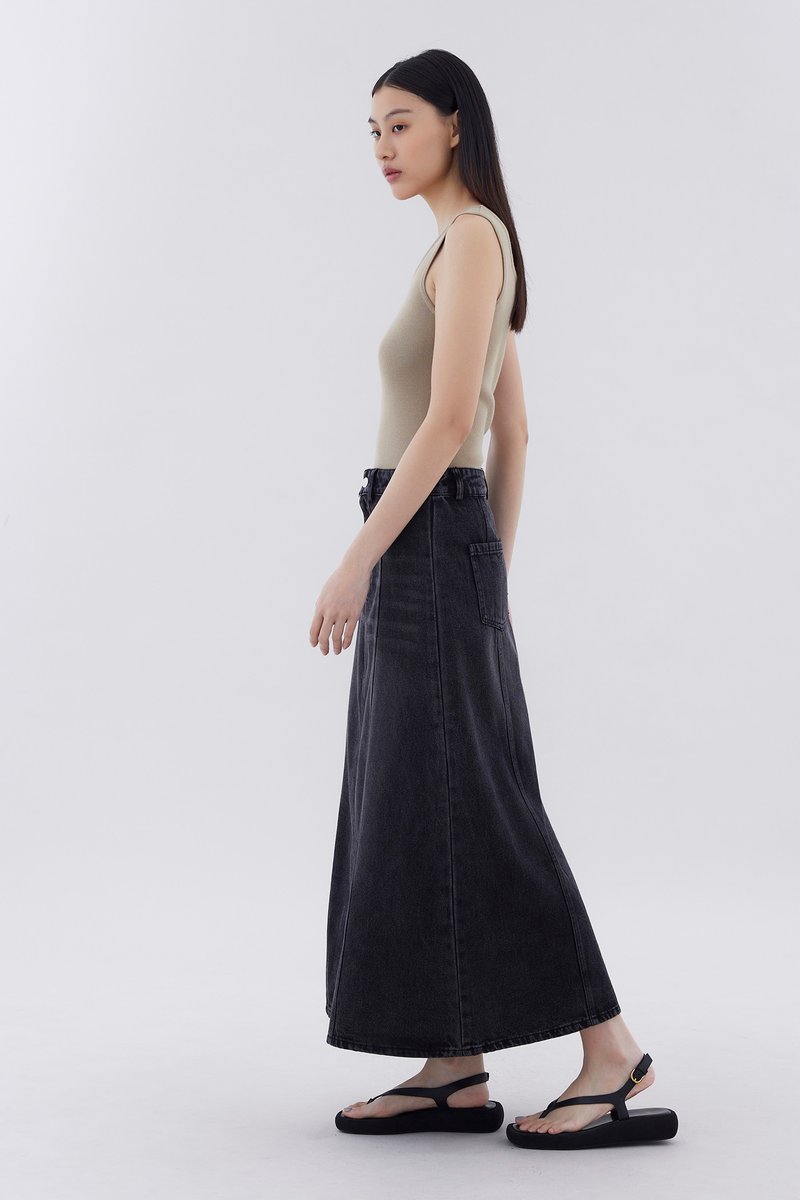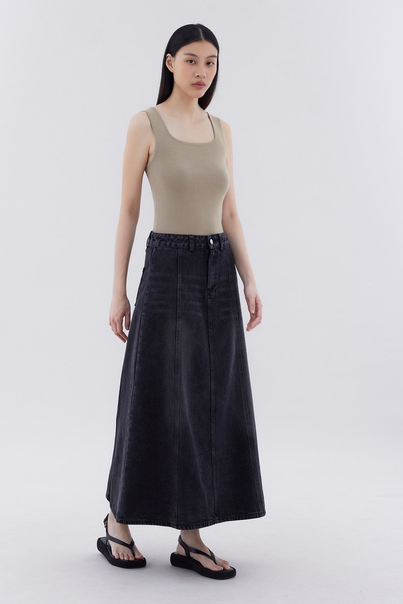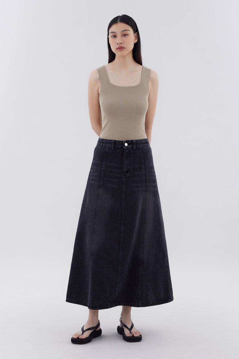 Flair meets flare. Made from softly structured cotton denim, this mid-waisted denim skirt features panelling, belt loops, and a front zip and button closure. Worn in a relaxed, A-line silhouette and maxi length.