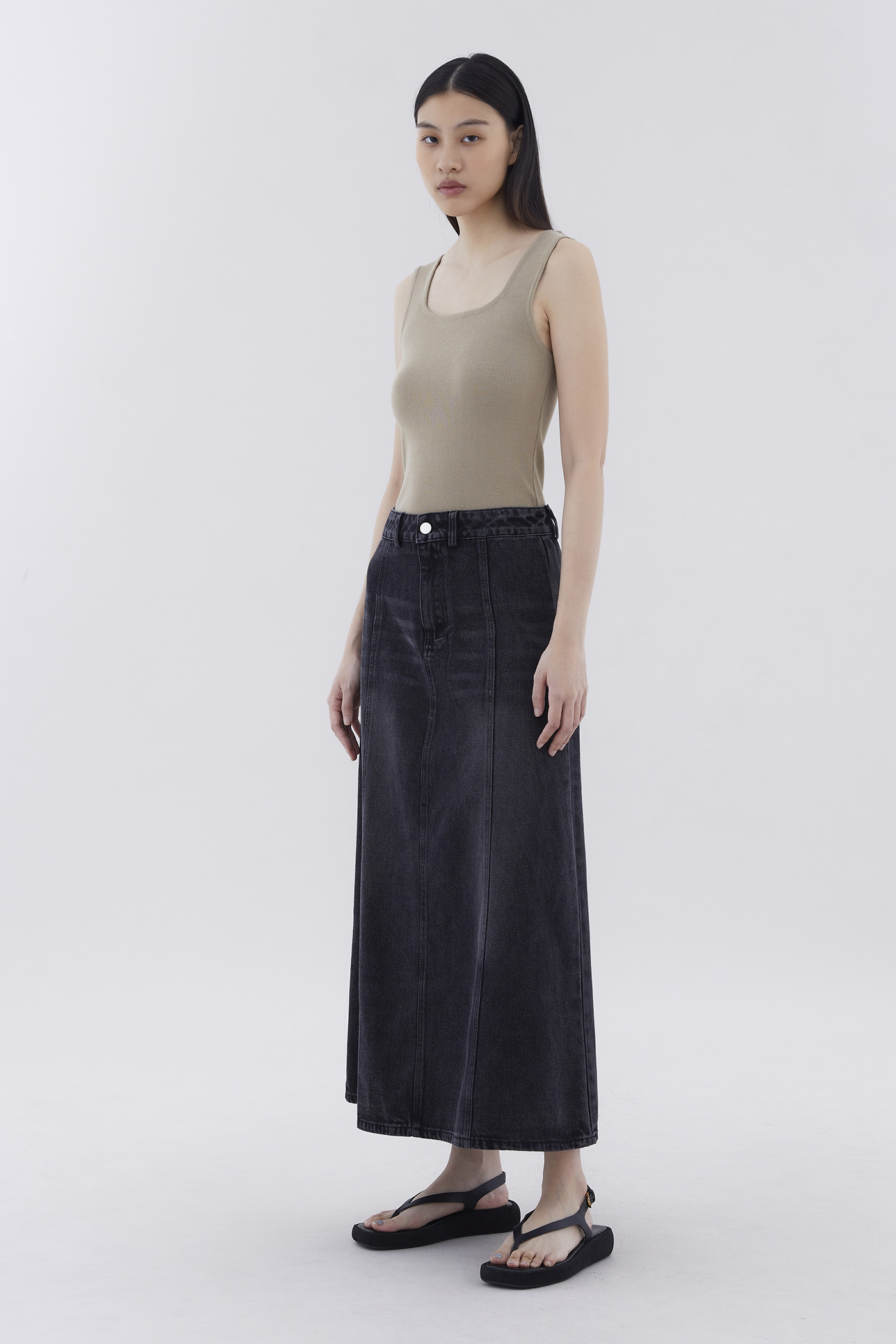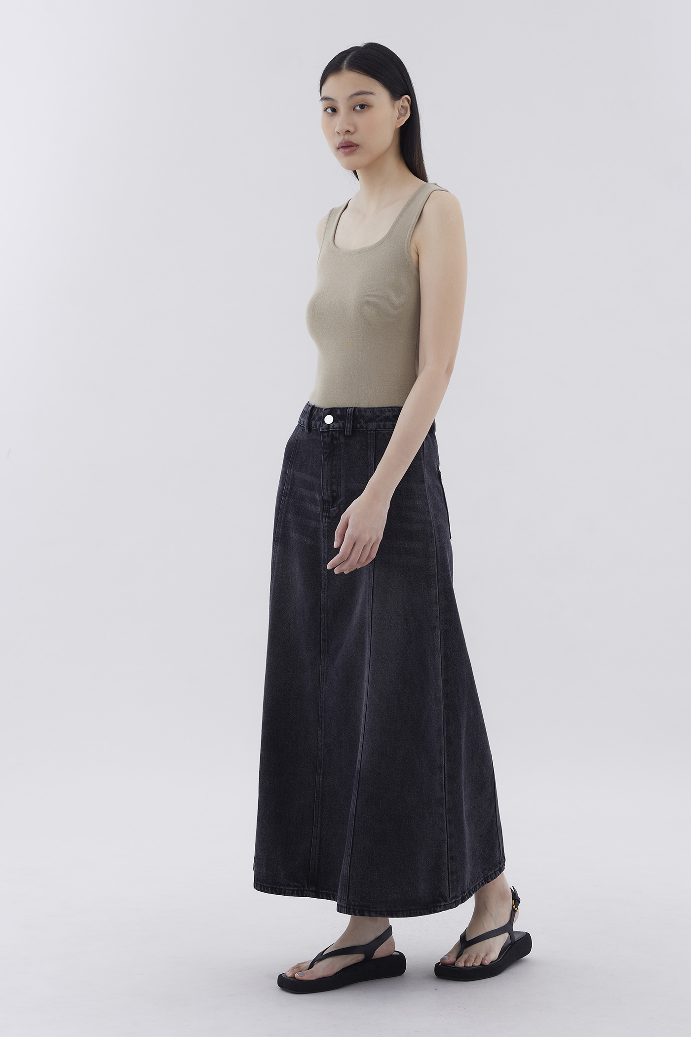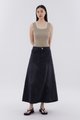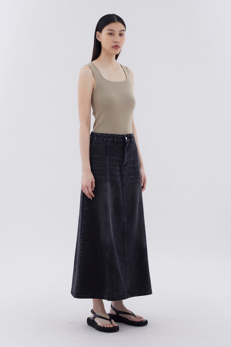Flair meets flare. Made from softly structured cotton denim, this mid-waisted denim skirt features panelling, belt loops, and a front zip and button closure. Worn in a relaxed, A-line silhouette and maxi length.
