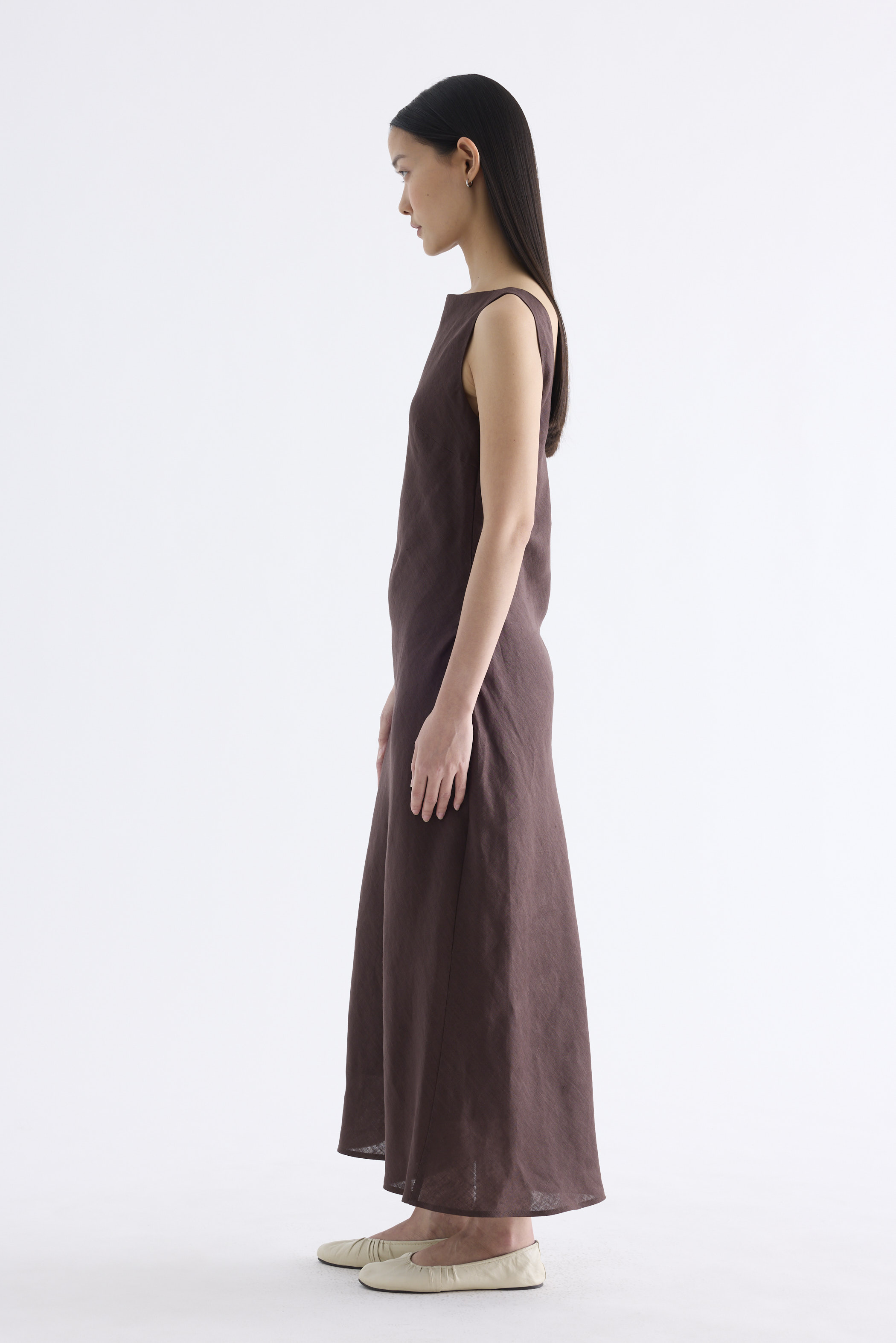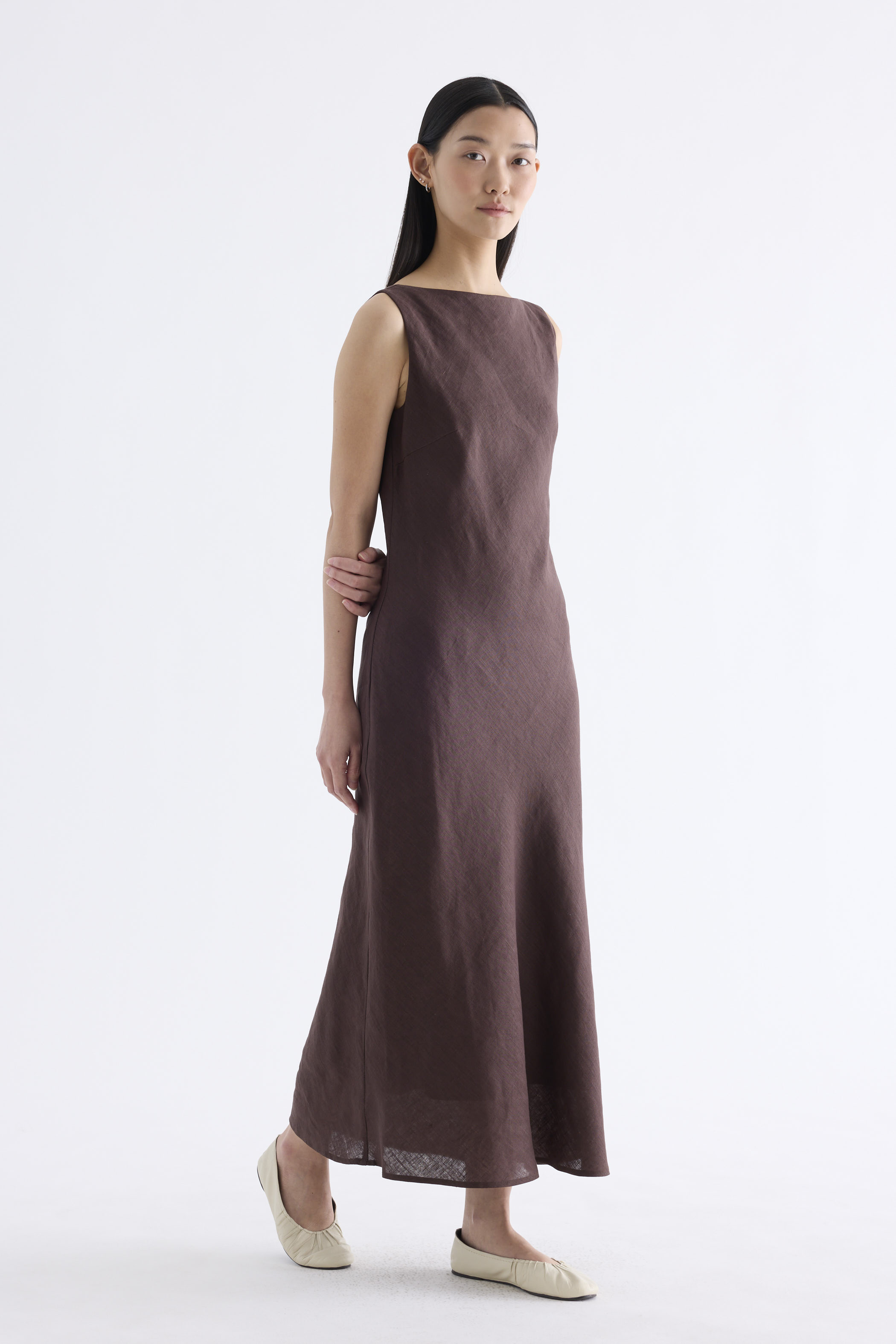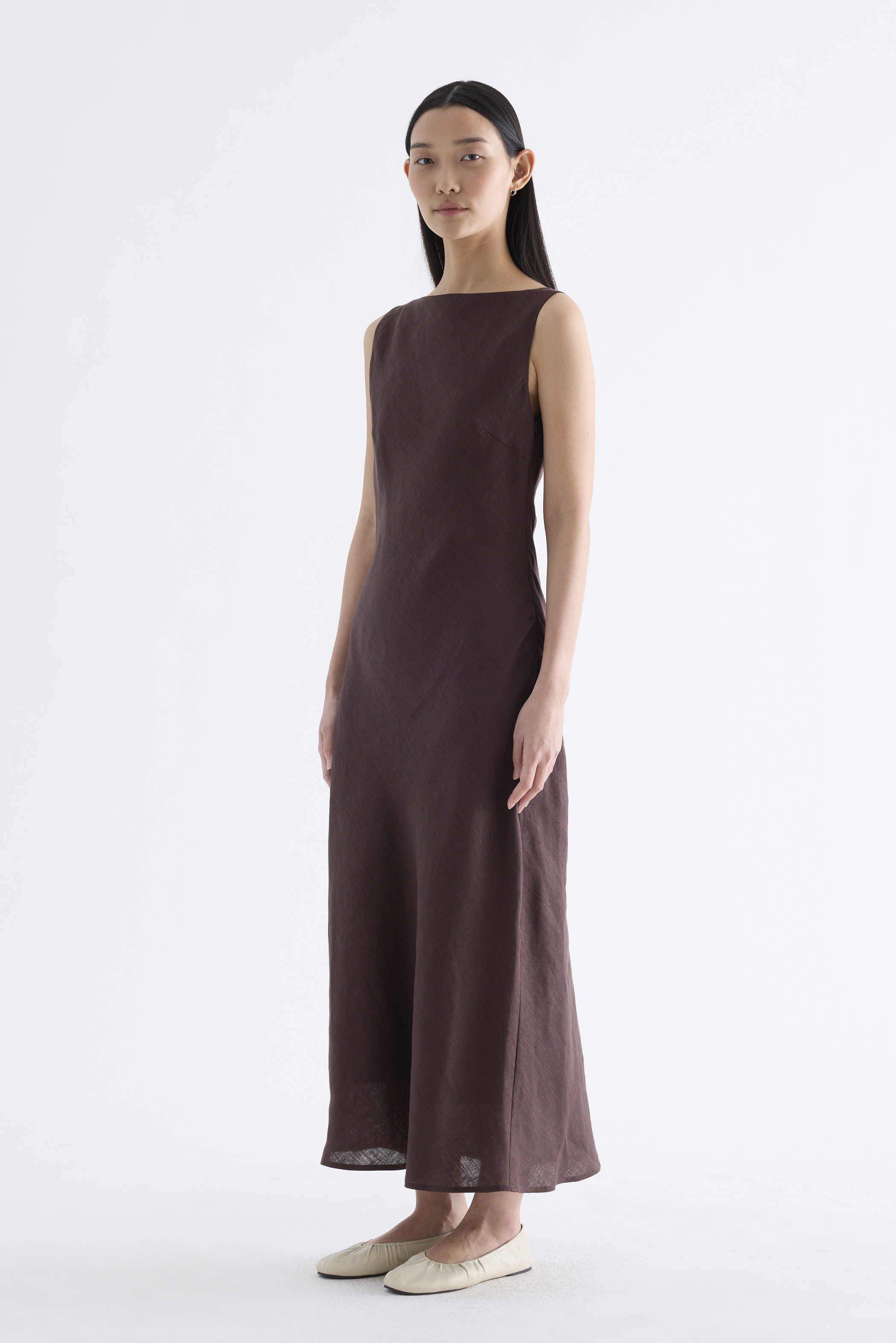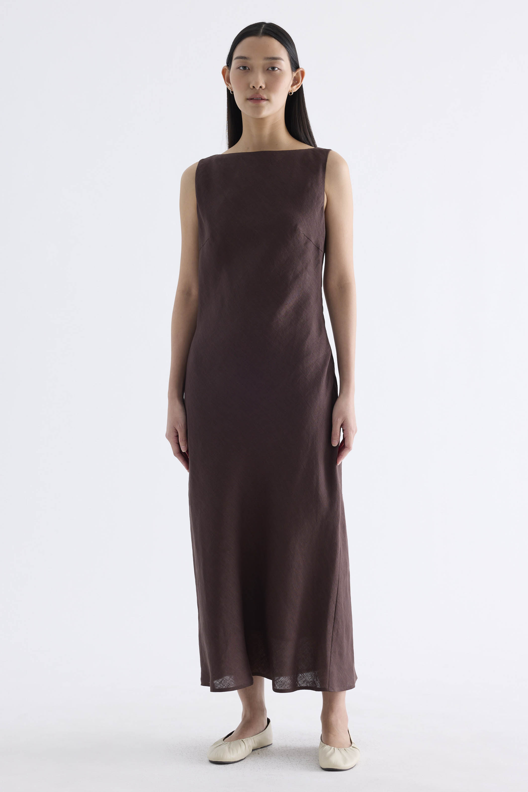 Fluid. Cut from light and airy 100% linen, this sleeveless maxi dress features a flowy bias silhouette, boat neckline and scooped back. Fits slim with a side zip closure.