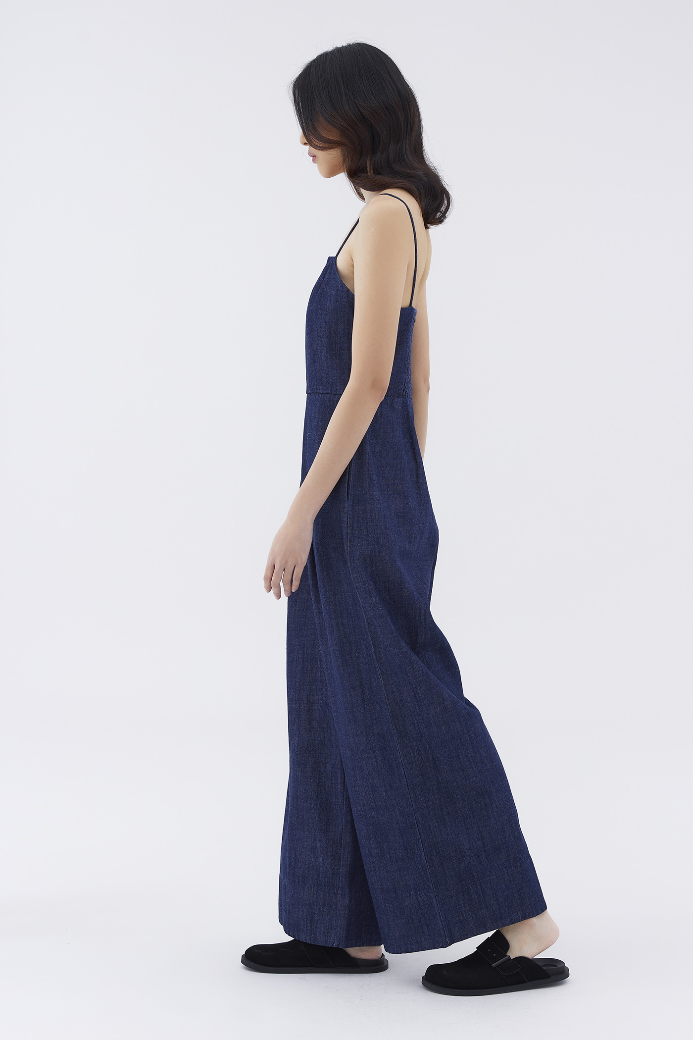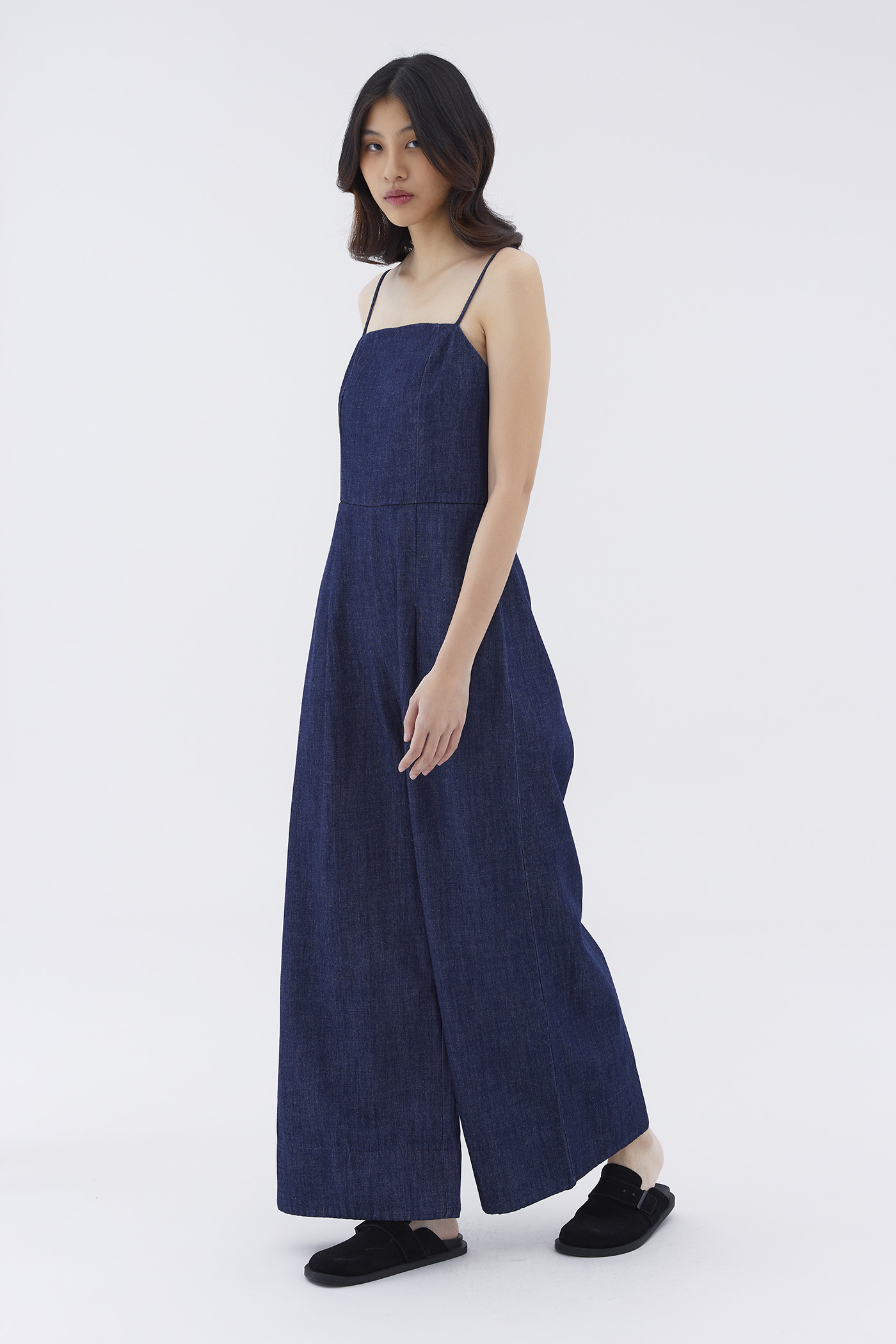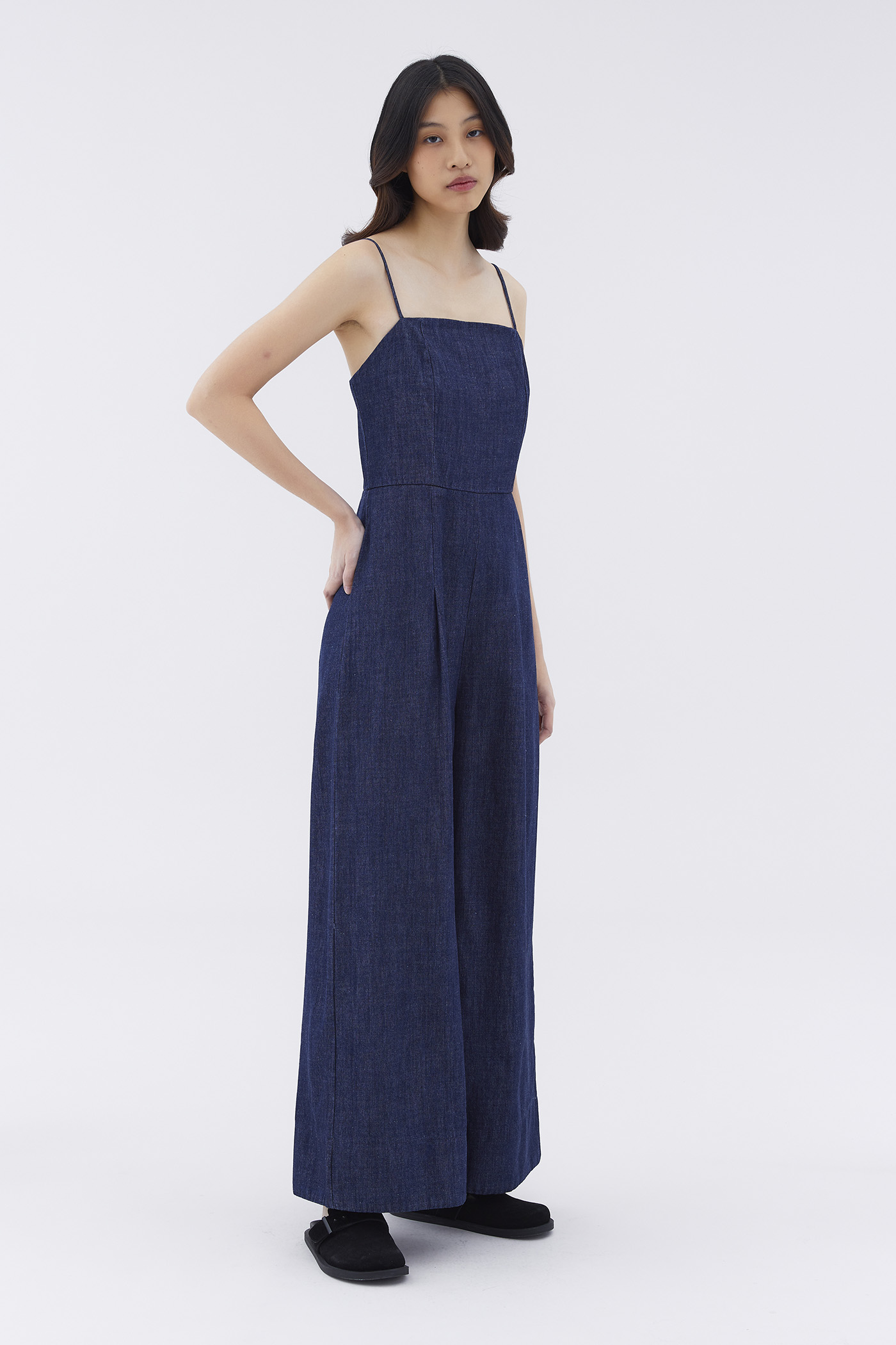One-piece wonder. Cut from softly structured cotton, this sleeveless jumpsuit features a straight neckline, slim non-adjustable shoulder straps, wide legs and a smocked back with a zip closure. Worn in a relaxed fit.