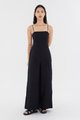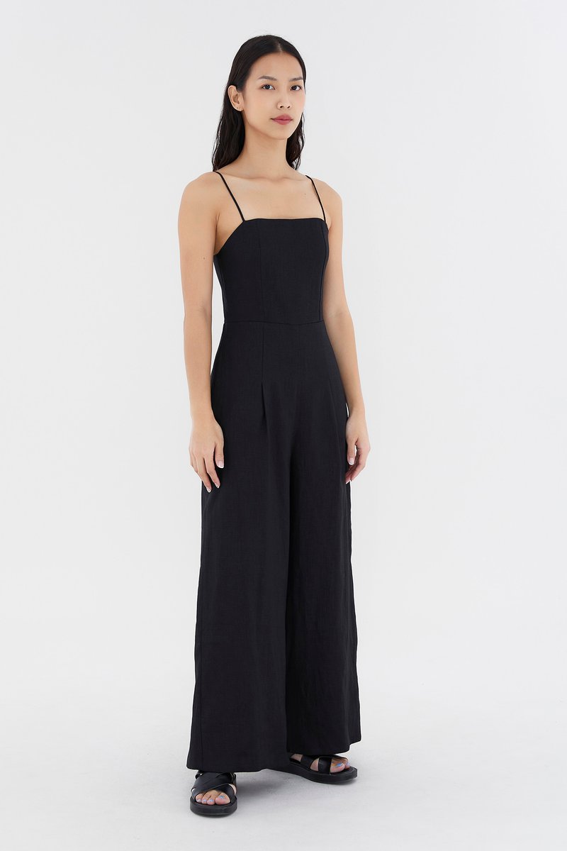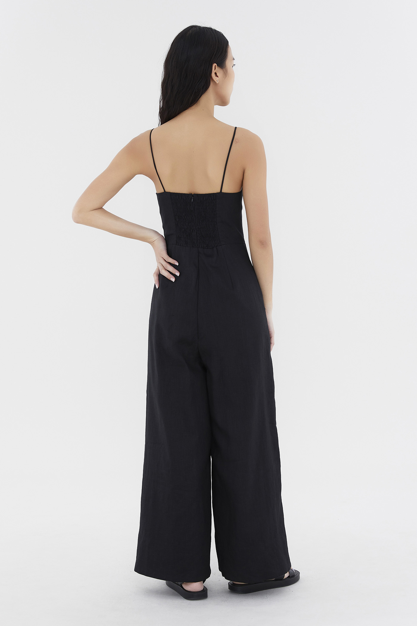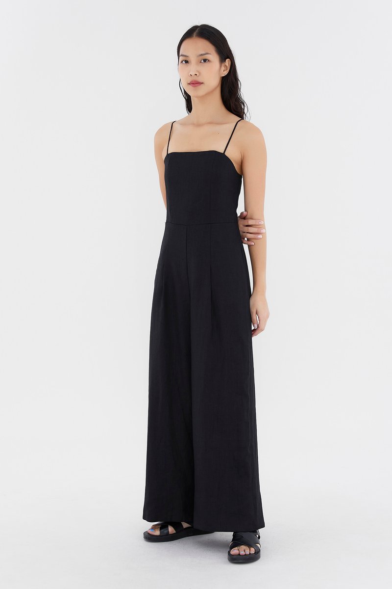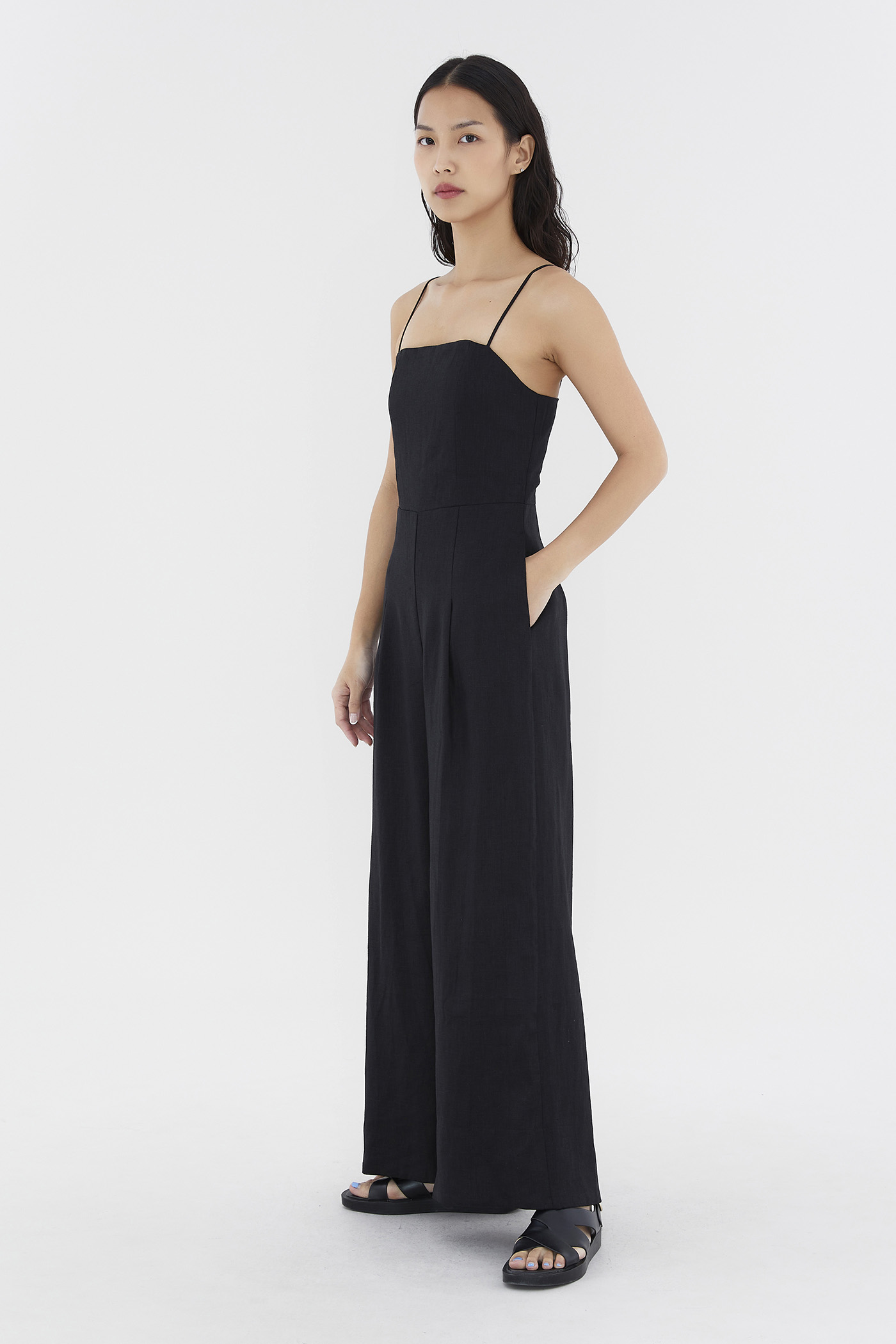 One-piece wonder. Cut from airy and gently tailored 100% linen, this sleeveless jumpsuit features a straight neckline, slim non-adjustable shoulder straps, wide legs and a smocked back with a zip closure. Worn in a relaxed fit.