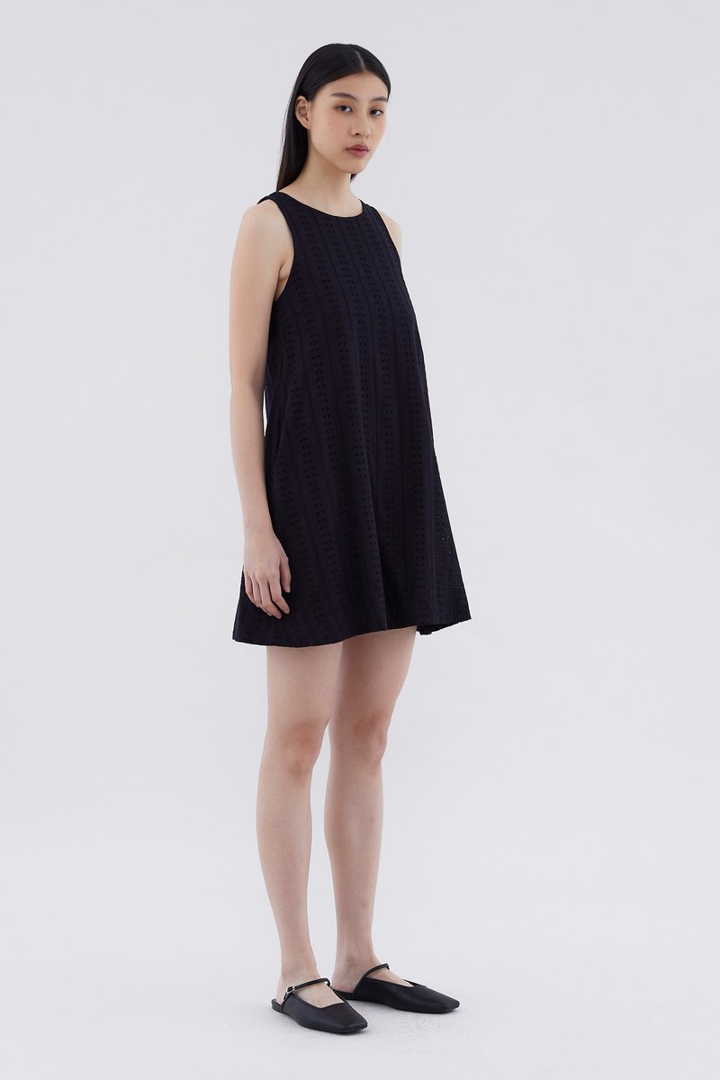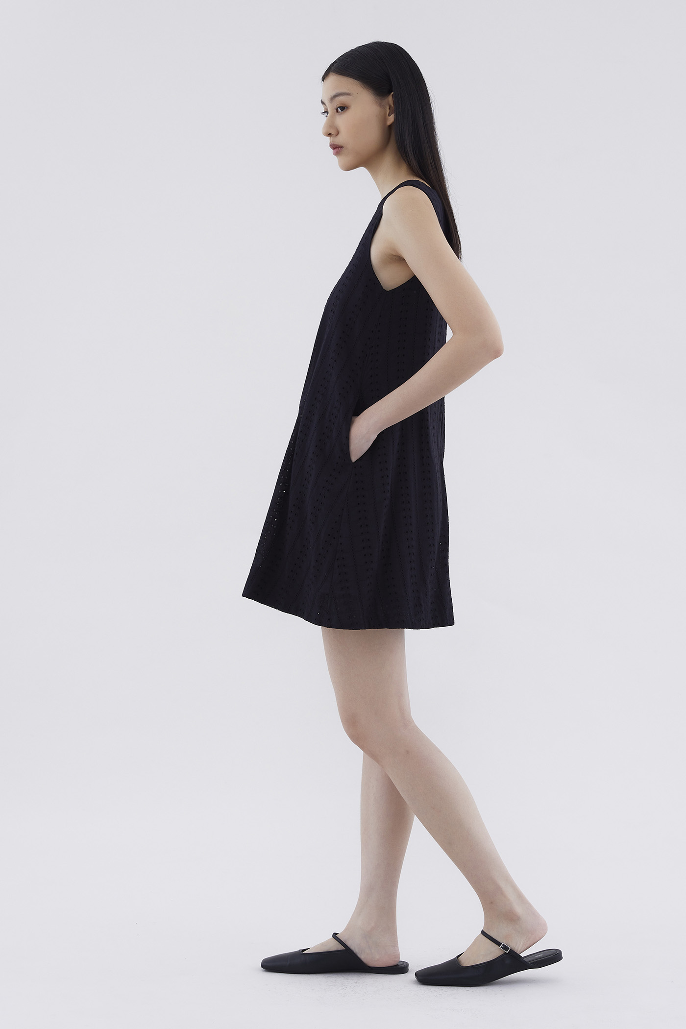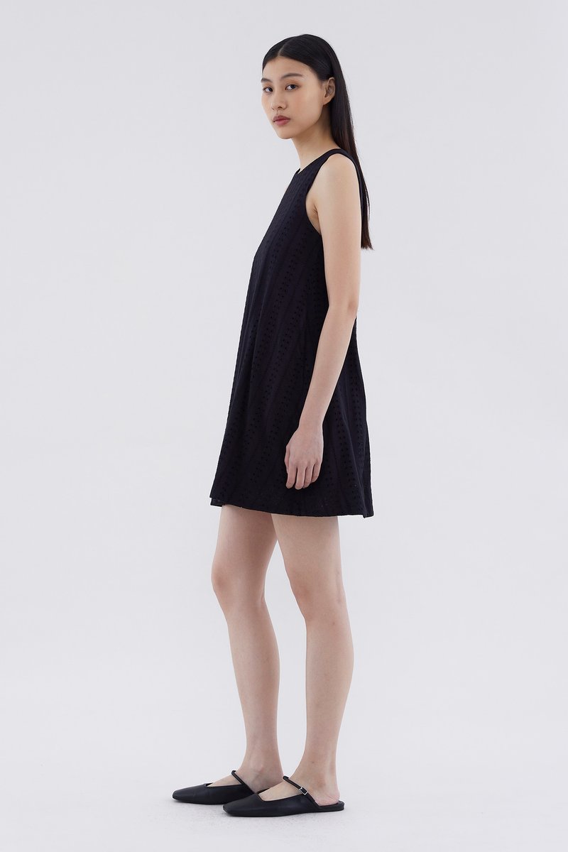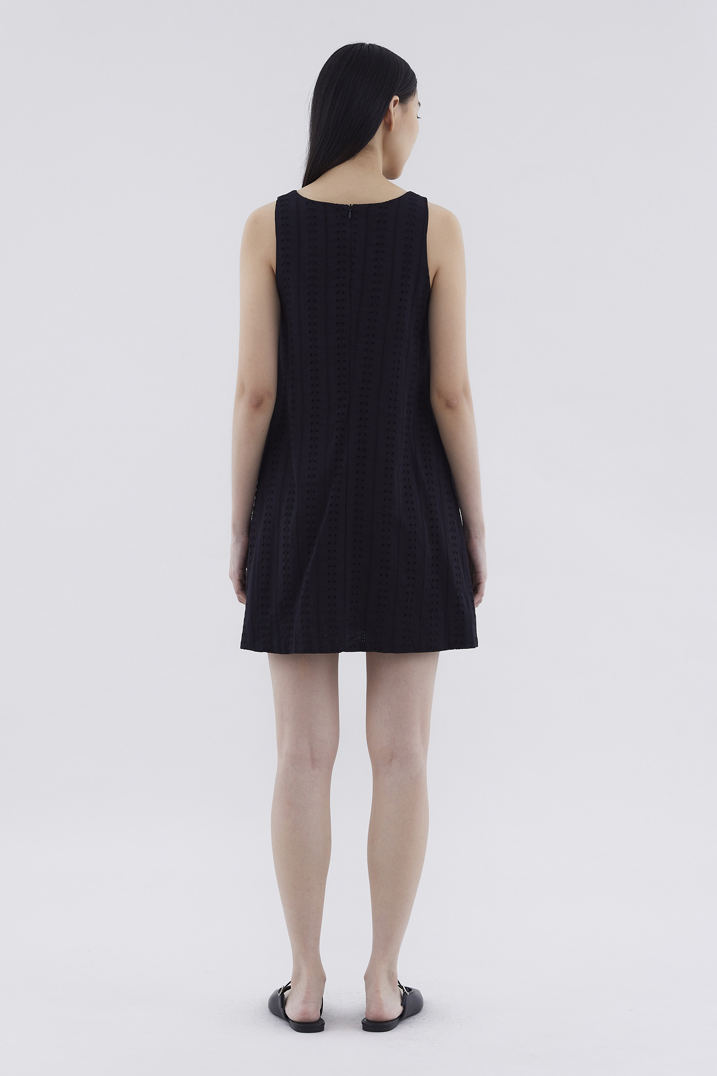 Can’t go wrong with the classics. Cut from softly structured broderie cotton, this sleeveless dress features a shift silhouette, round neckline and back zip closure. Fits relaxed and above the knee.