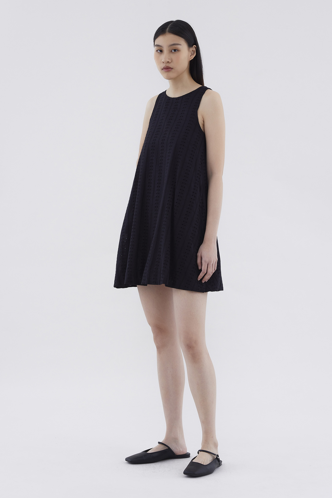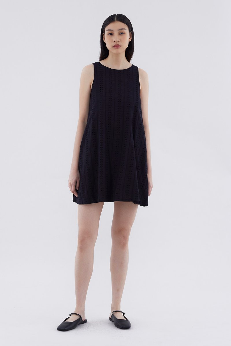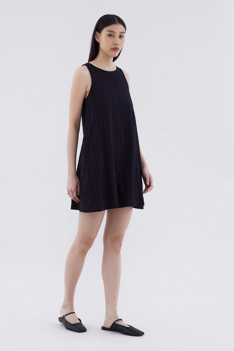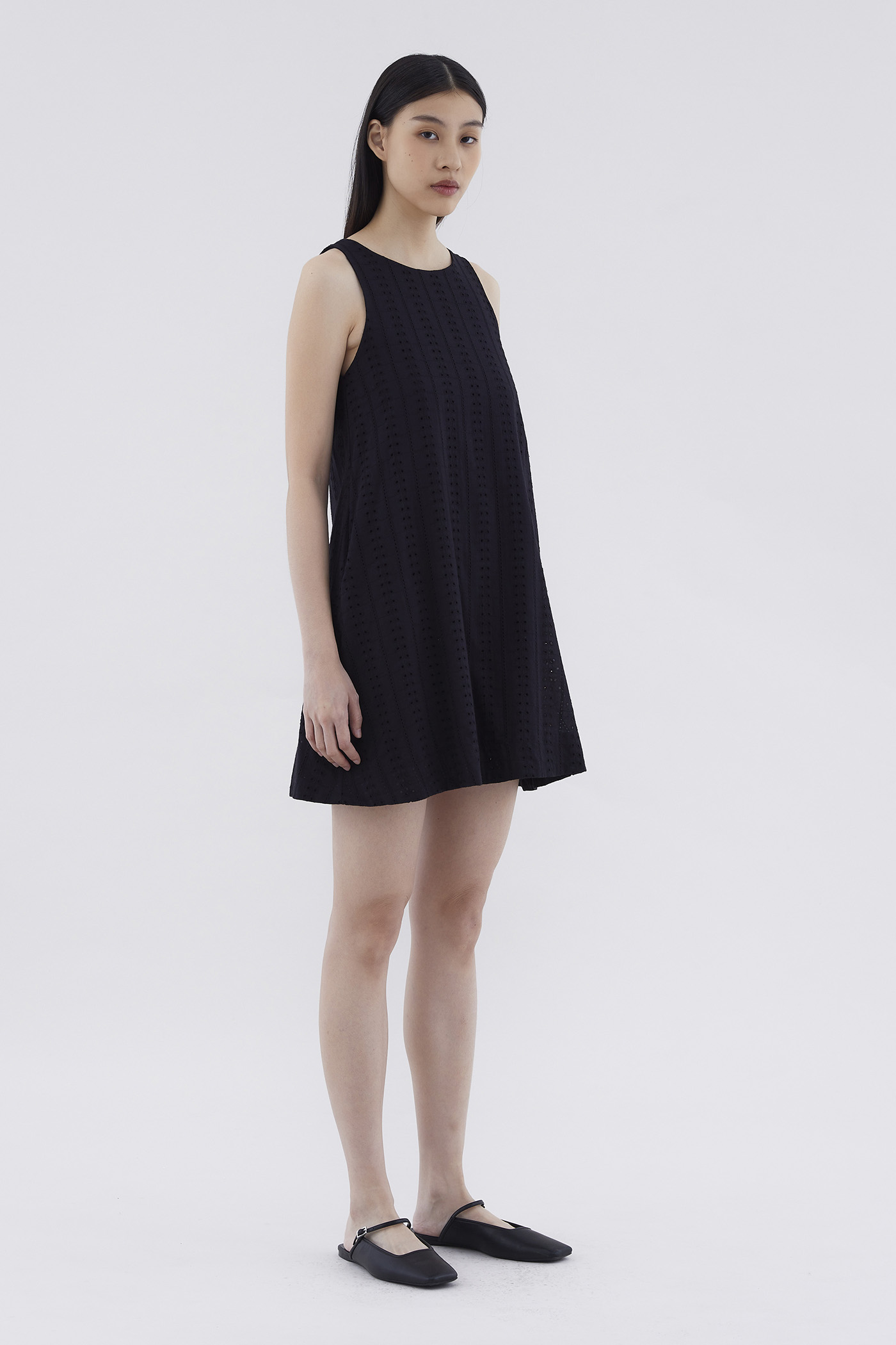 Can’t go wrong with the classics. Cut from softly structured broderie cotton, this sleeveless dress features a shift silhouette, round neckline and back zip closure. Fits relaxed and above the knee.