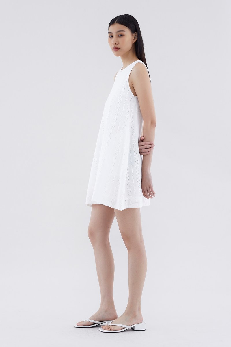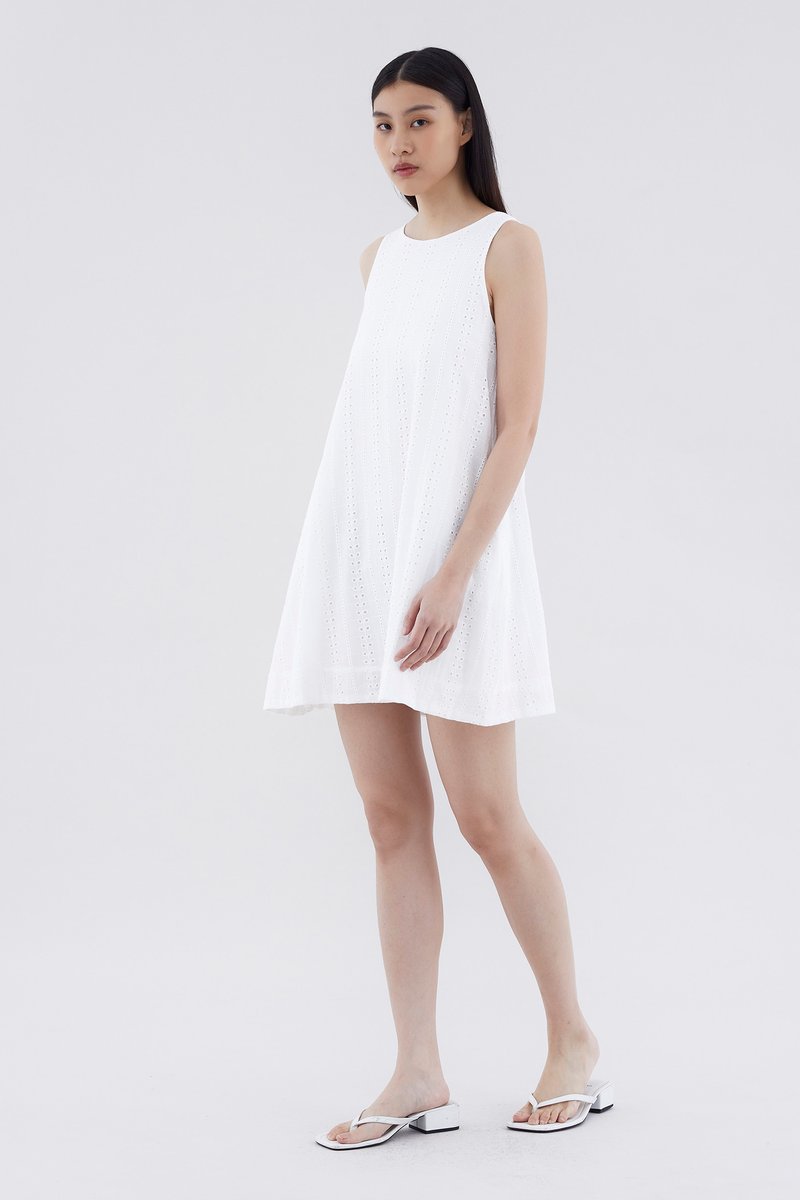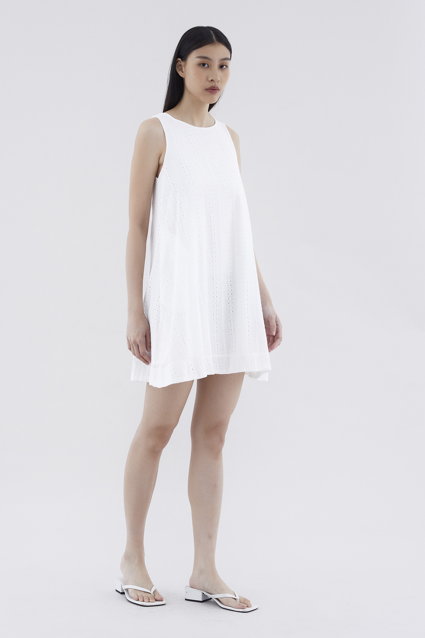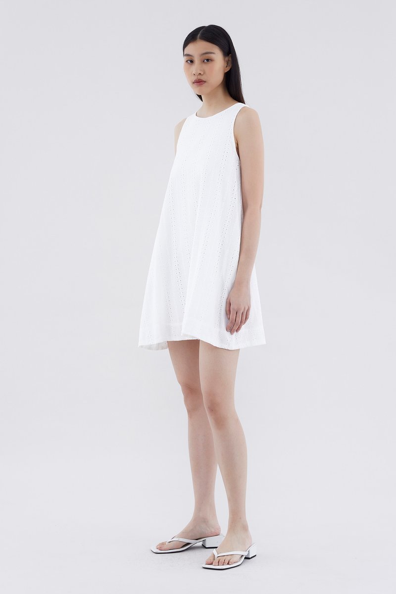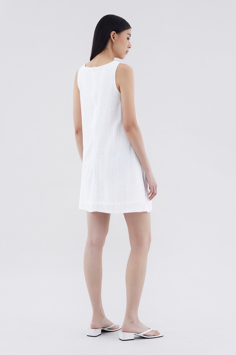 Can’t go wrong with the classics. Cut from softly structured broderie cotton, this sleeveless dress features a shift silhouette, round neckline and back zip closure. Fits relaxed and above the knee.