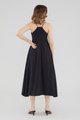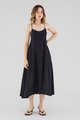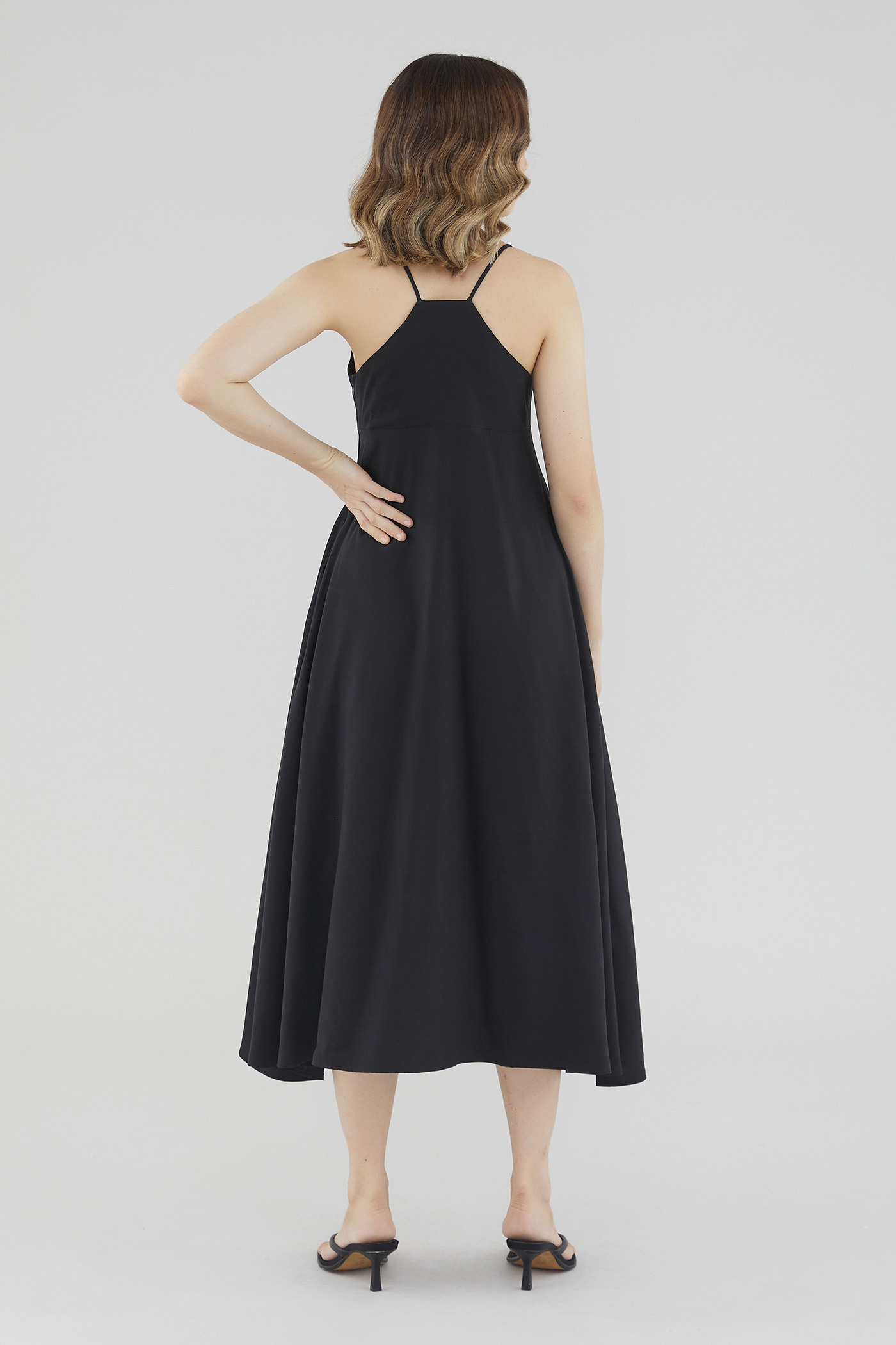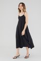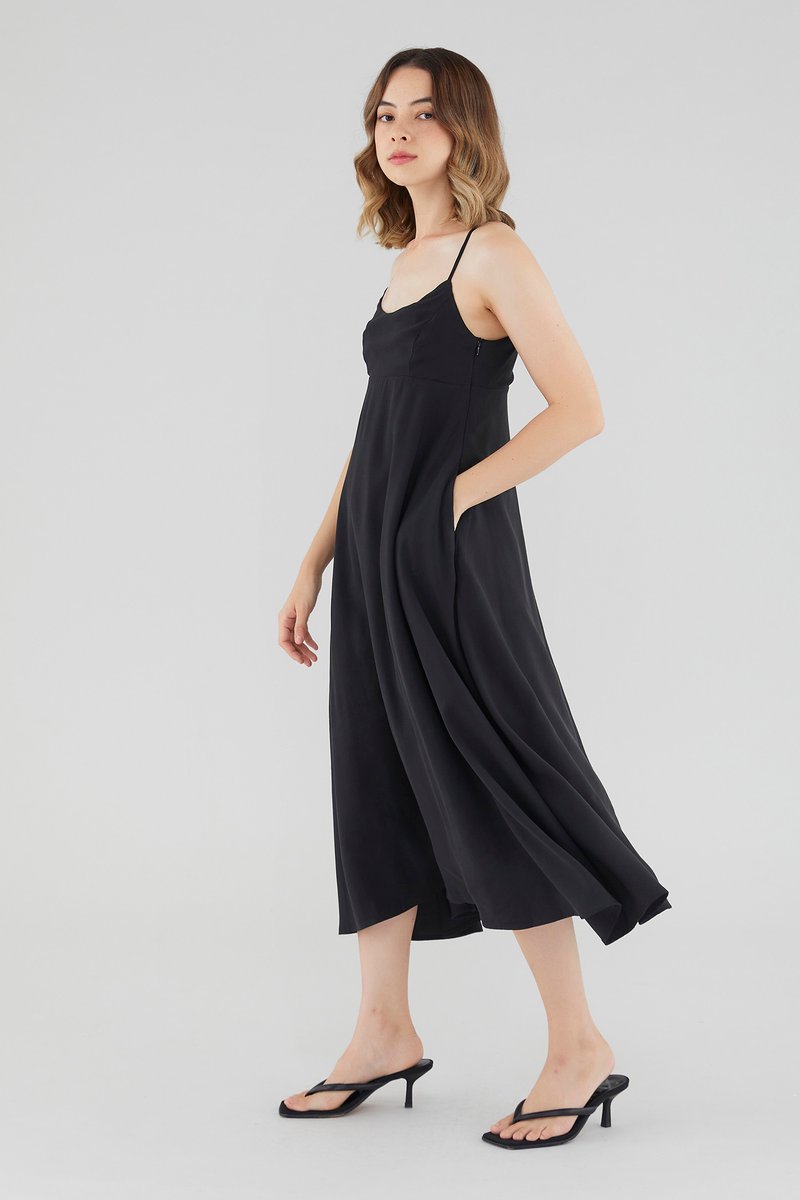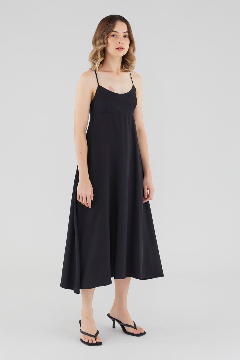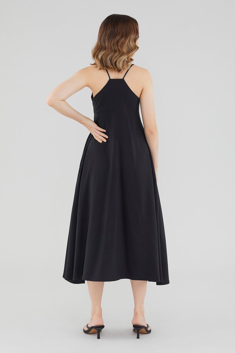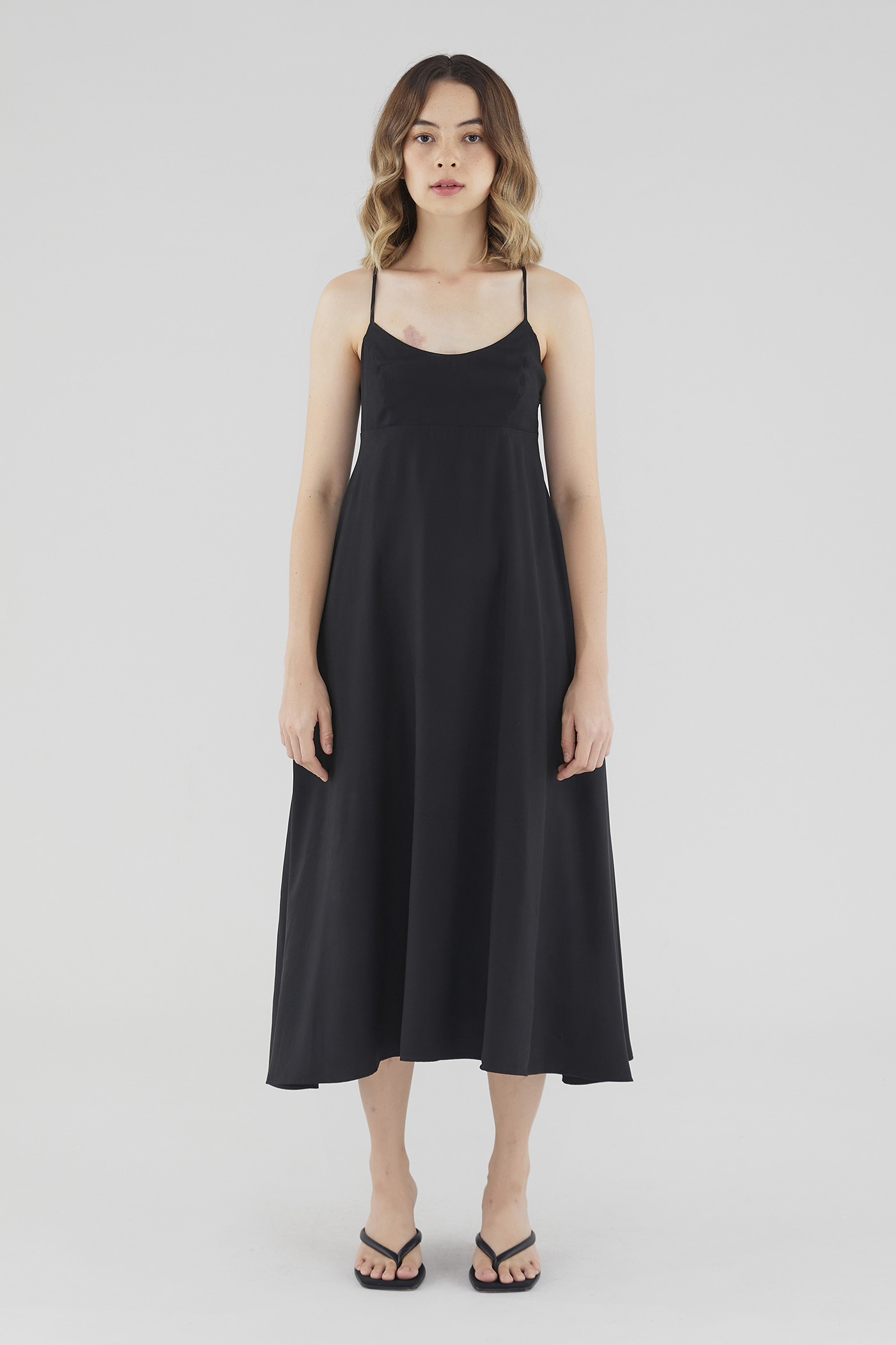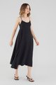 Go with the flow. Made from smooth and drapey fabric, this sleeveless midi dress features a round neckline, slim non-adjustable straps, a racerback and a side zip closure. Fits slimmer around the bust before flaring out in a relaxed skirt.