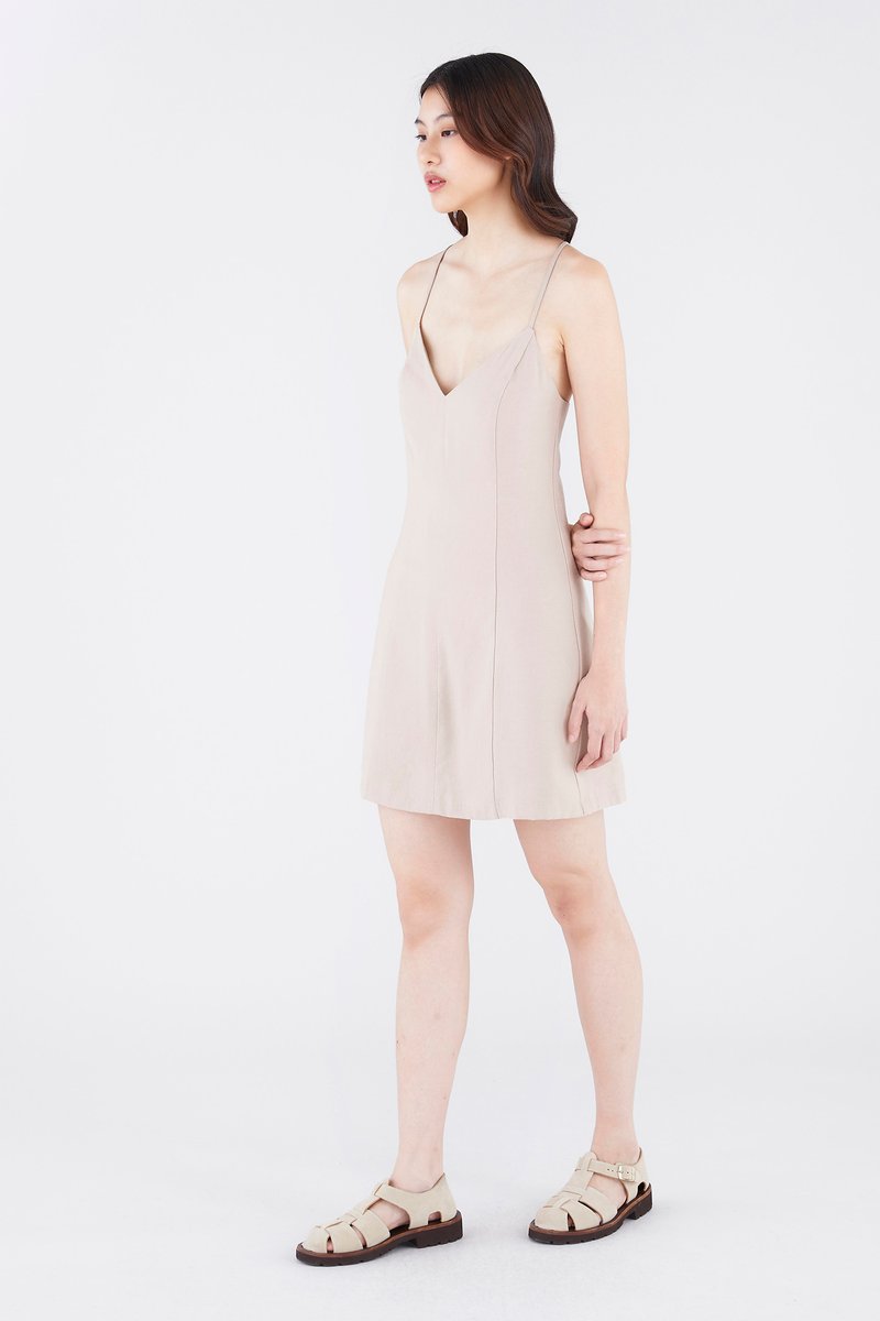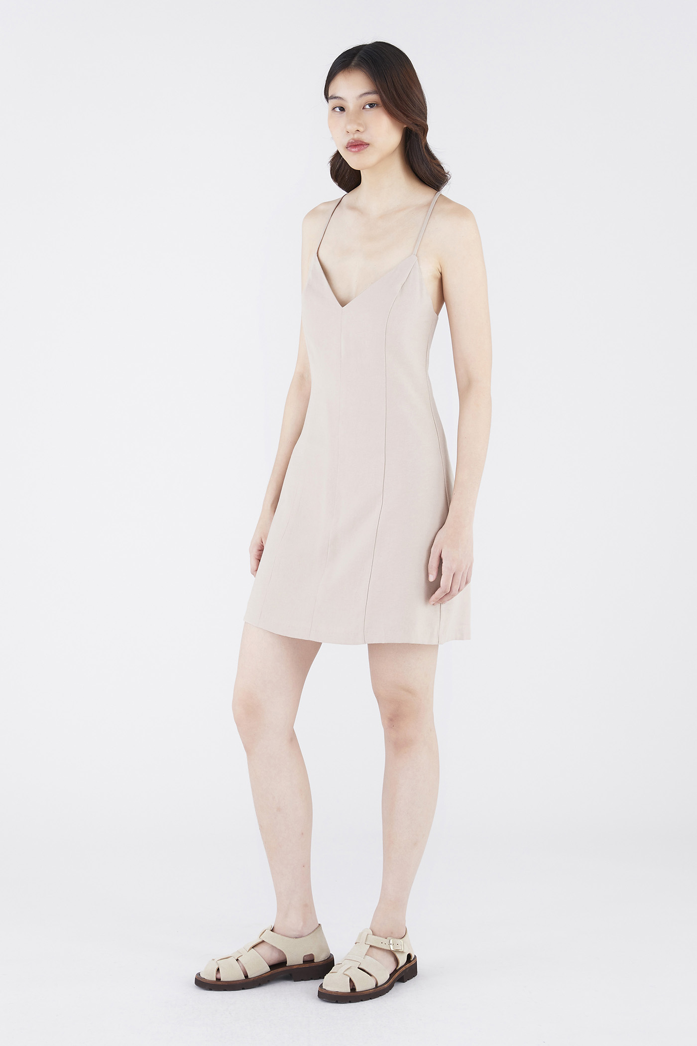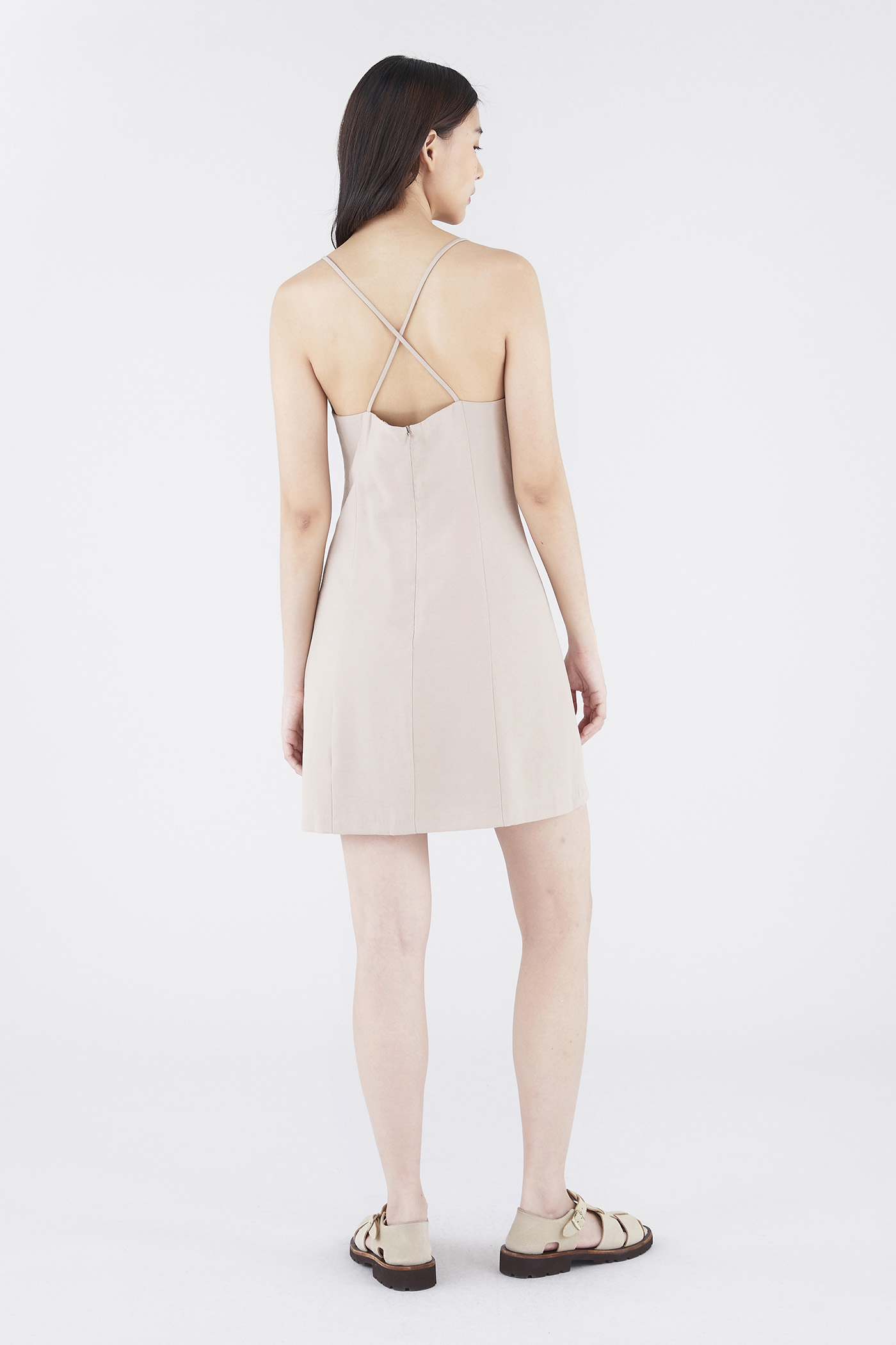 Stay cool. Cut from smooth and softly structured fabric, this sleeveless mini dress features a V-neckline, non-adjustable shoulder straps that cross over at the back and panelling for extra polish. Fits relaxed with a zip closure at the back.