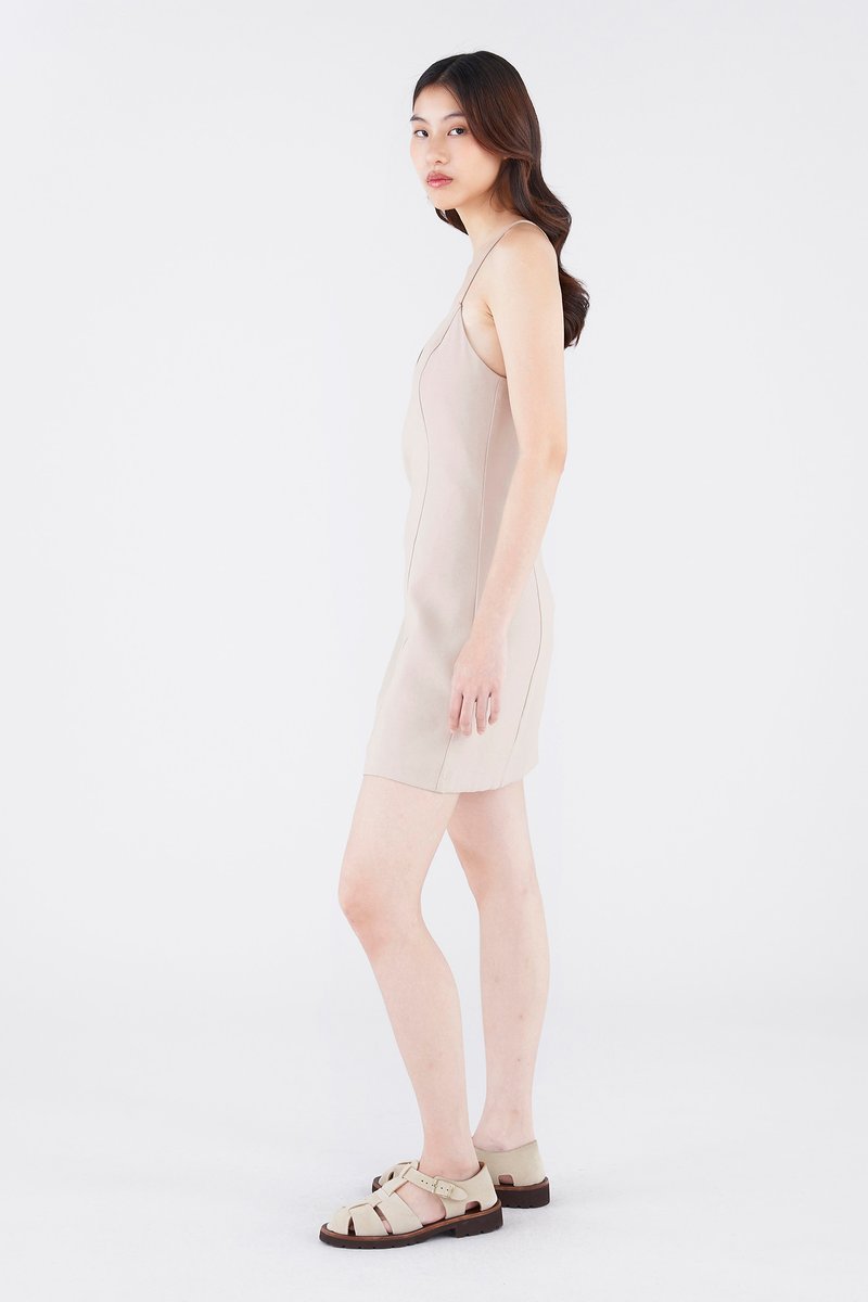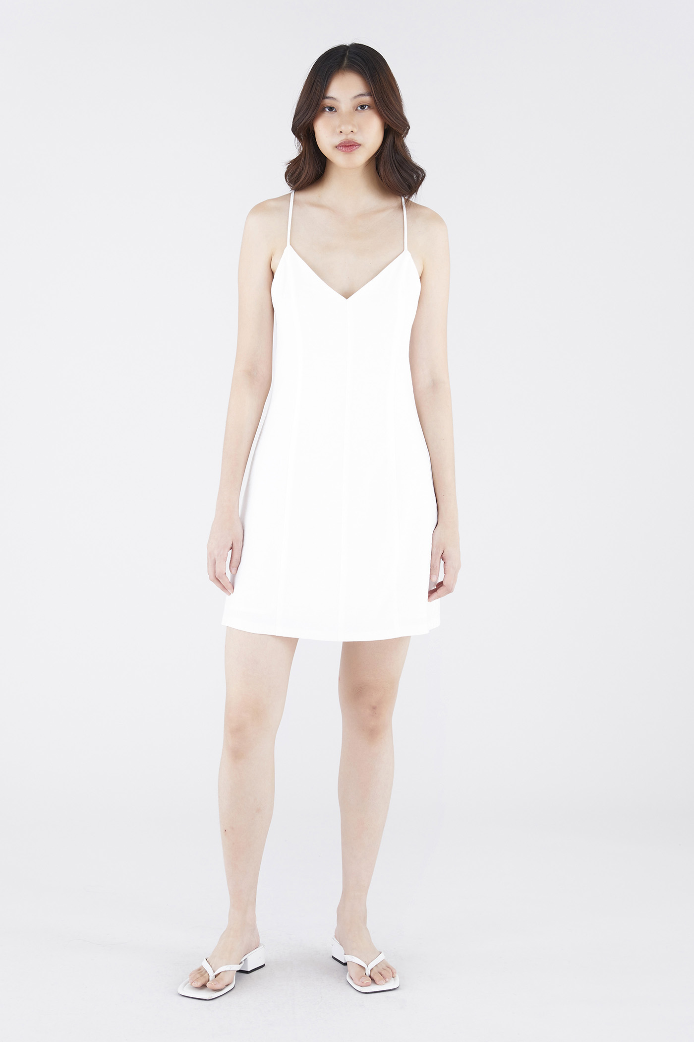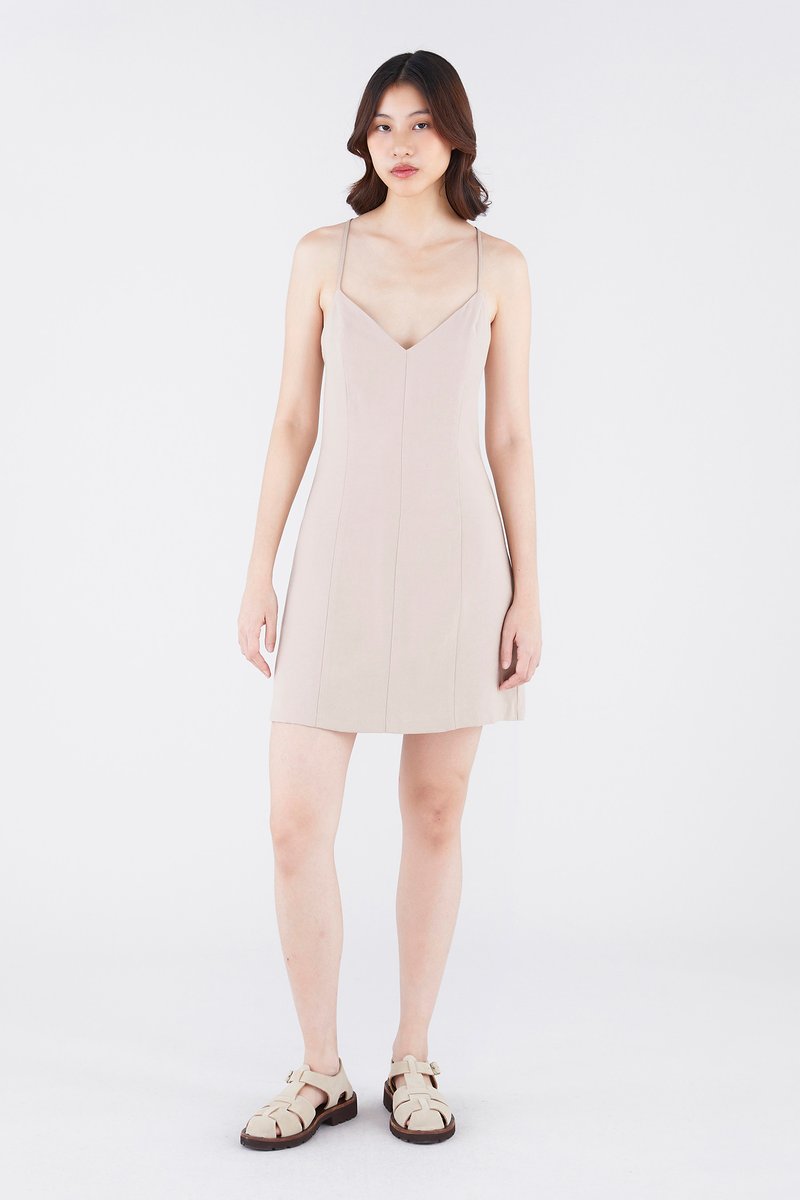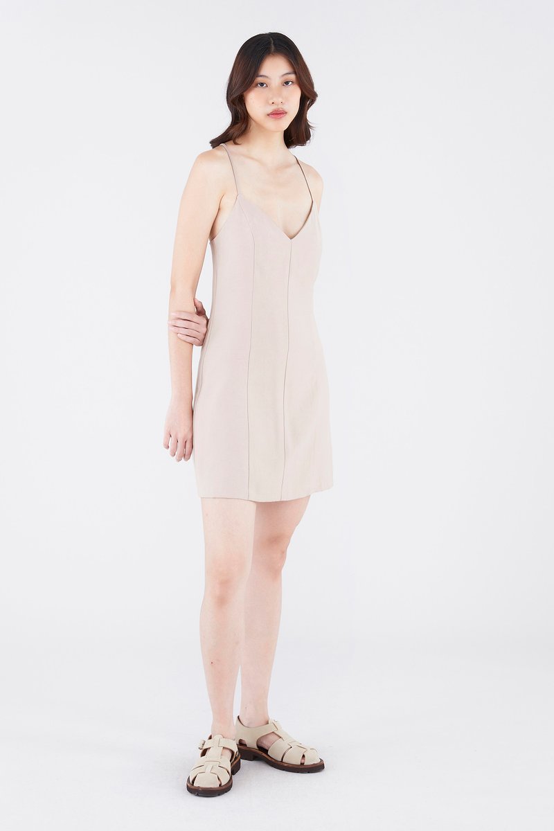Stay cool. Cut from smooth and softly structured fabric, this sleeveless mini dress features a V-neckline, non-adjustable shoulder straps that cross over at the back and panelling for extra polish. Fits relaxed with a zip closure at the back.