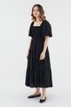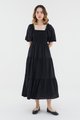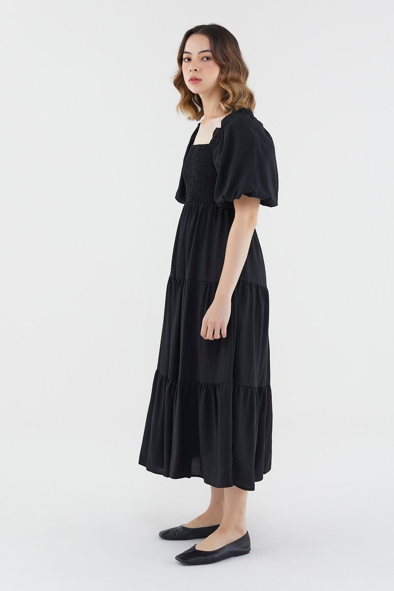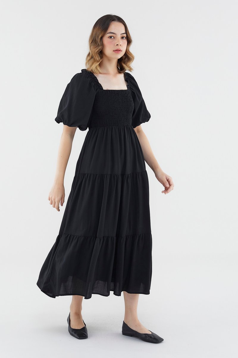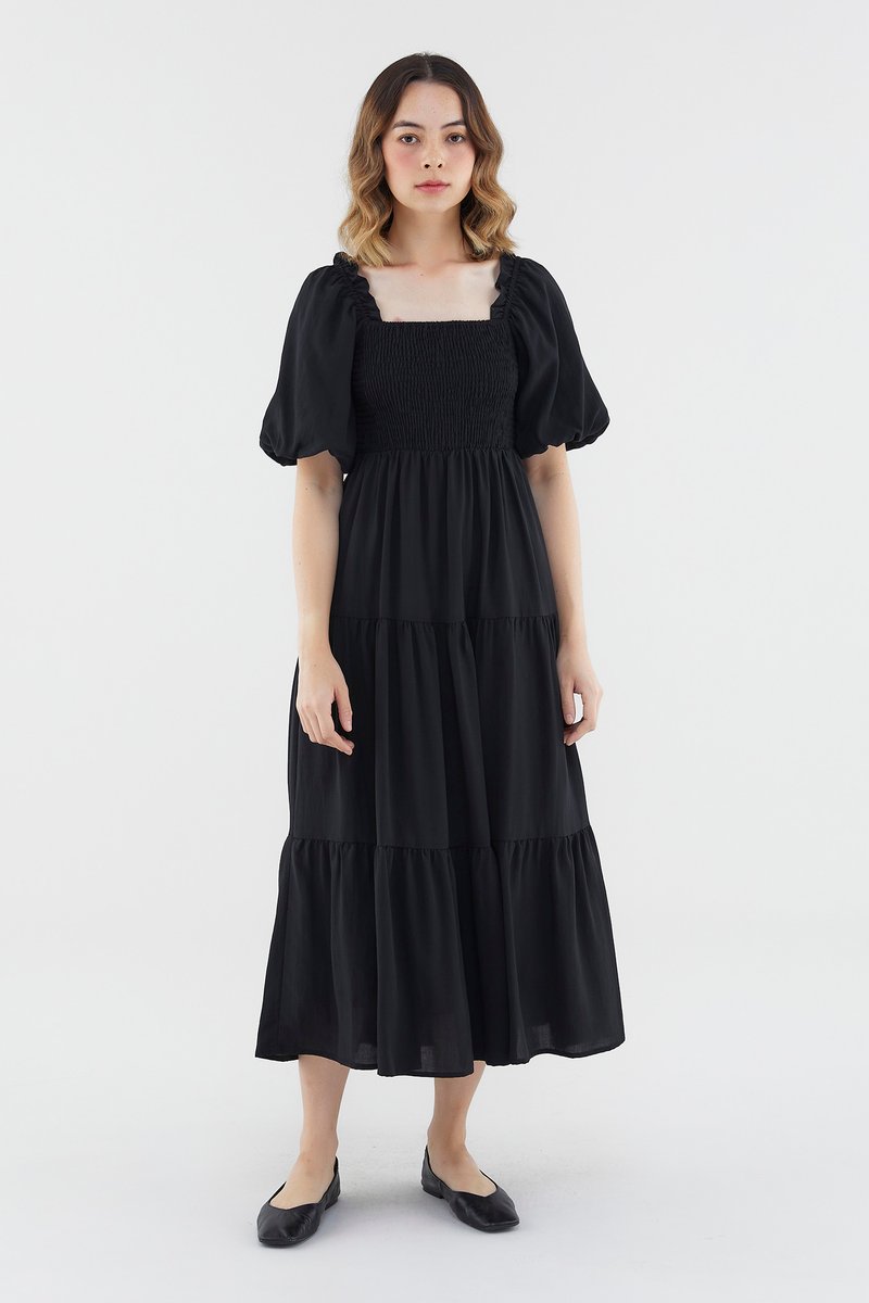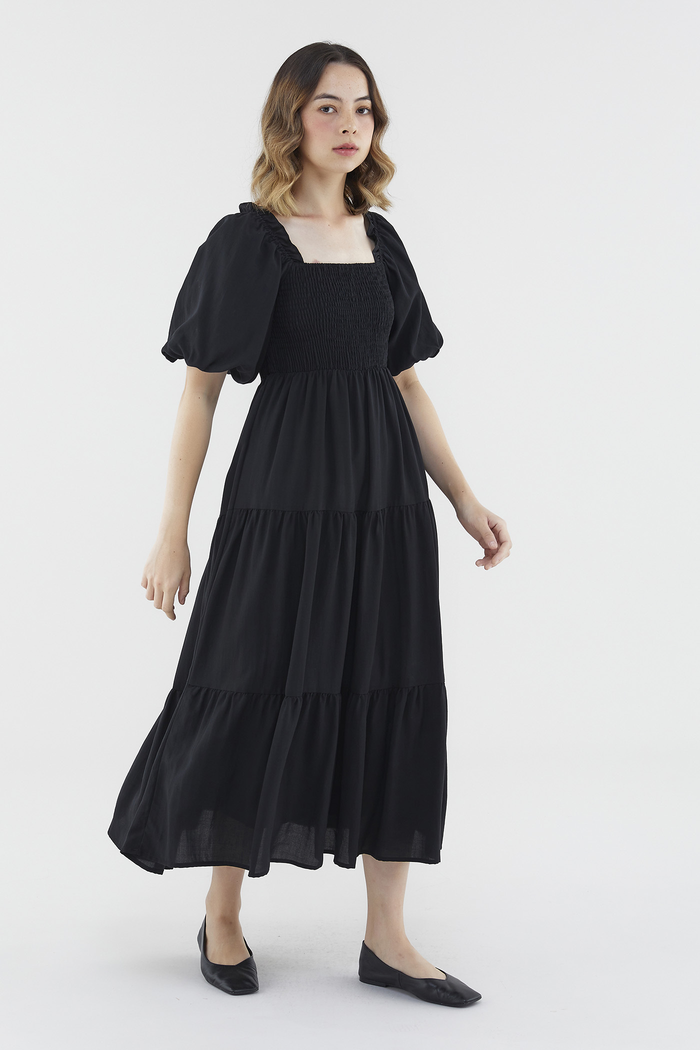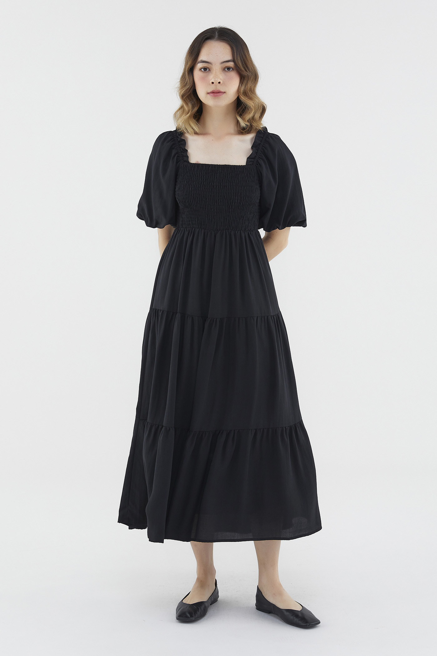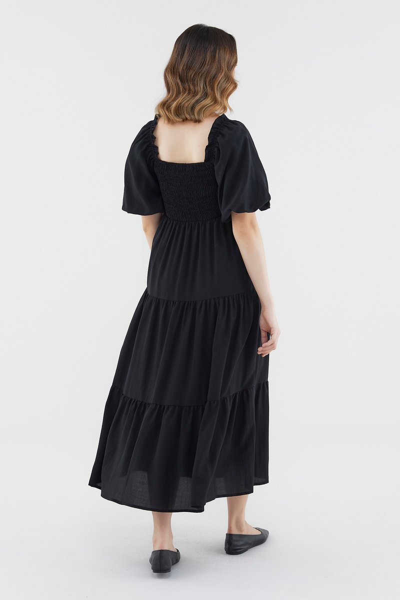 Easy textures meet everyday volume. Made from smooth and flowy fabric, this maxi dress features short puffed sleeves, a smocked bodice and a frilled, elasticated square neckline that may be worn on or off the shoulder. Fits slimmer around the bodice before flaring out in a relaxed tiered skirt.