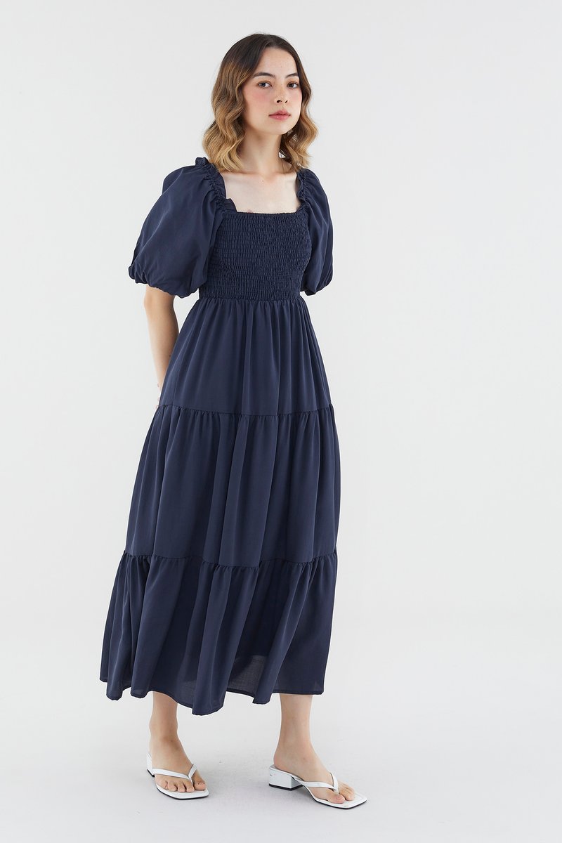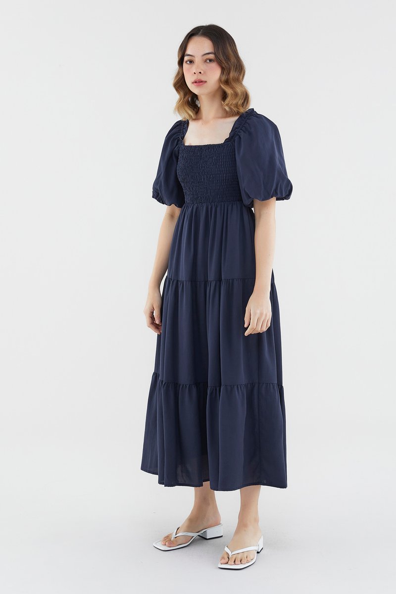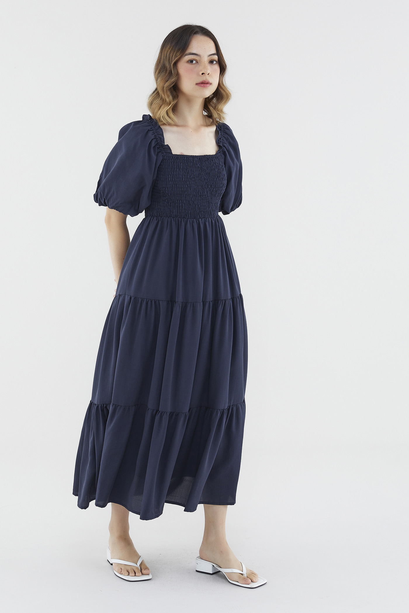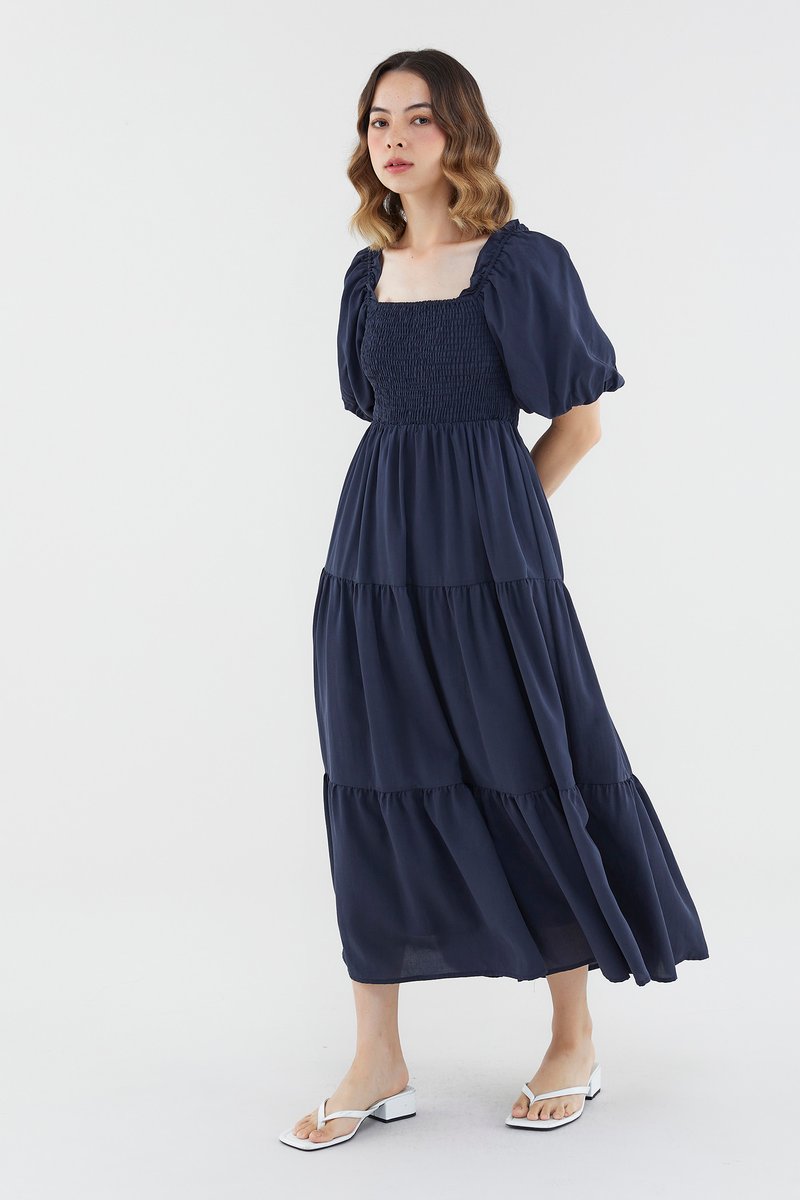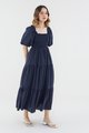 Easy textures meet everyday volume. Made from smooth and flowy fabric, this maxi dress features short puffed sleeves, a smocked bodice and a frilled, elasticated square neckline that may be worn on or off the shoulder. Fits slimmer around the bodice before flaring out in a relaxed tiered skirt.