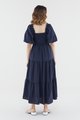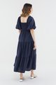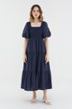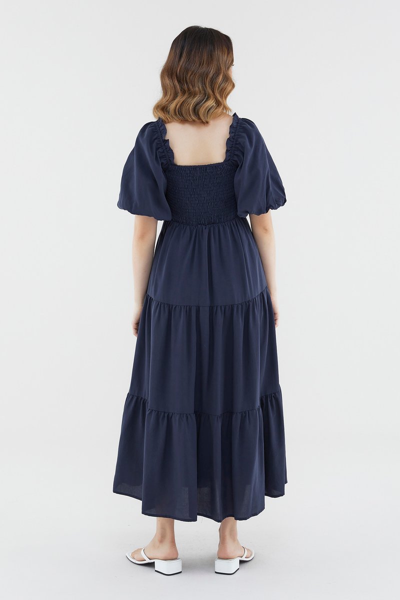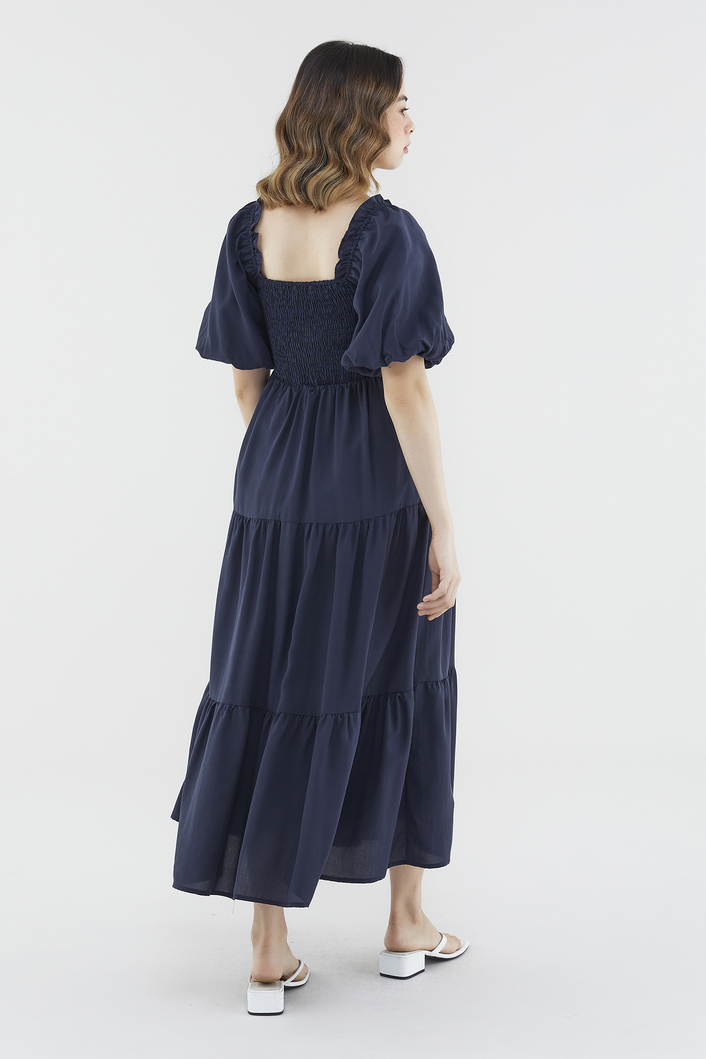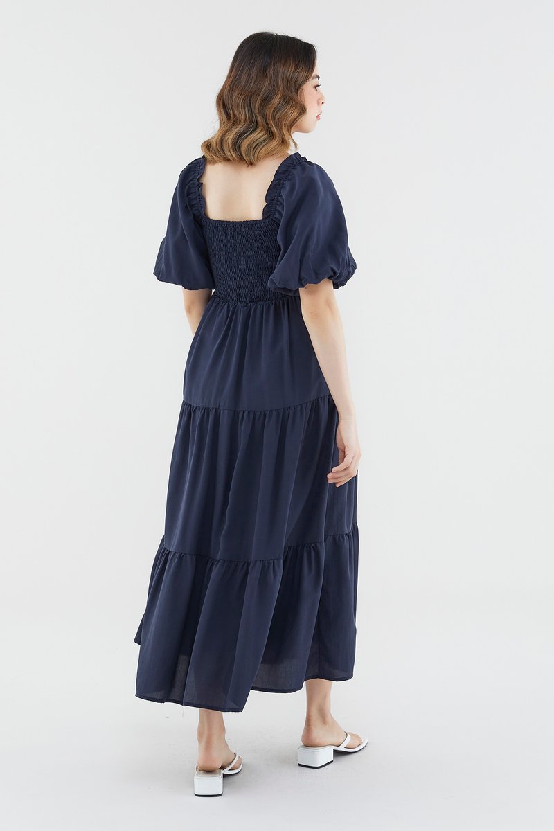 Easy textures meet everyday volume. Made from smooth and flowy fabric, this maxi dress features short puffed sleeves, a smocked bodice and a frilled, elasticated square neckline that may be worn on or off the shoulder. Fits slimmer around the bodice before flaring out in a relaxed tiered skirt.