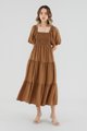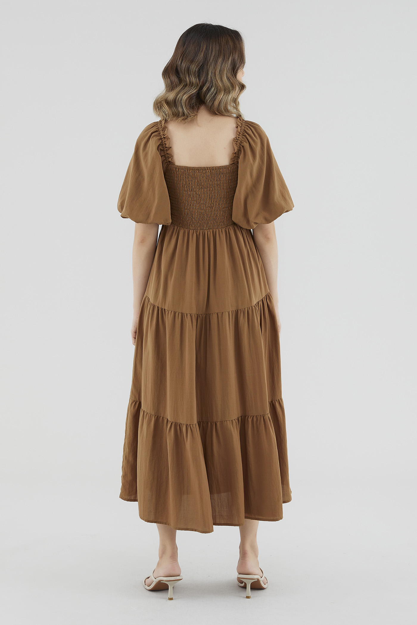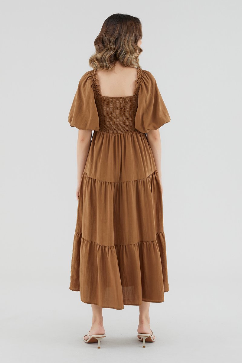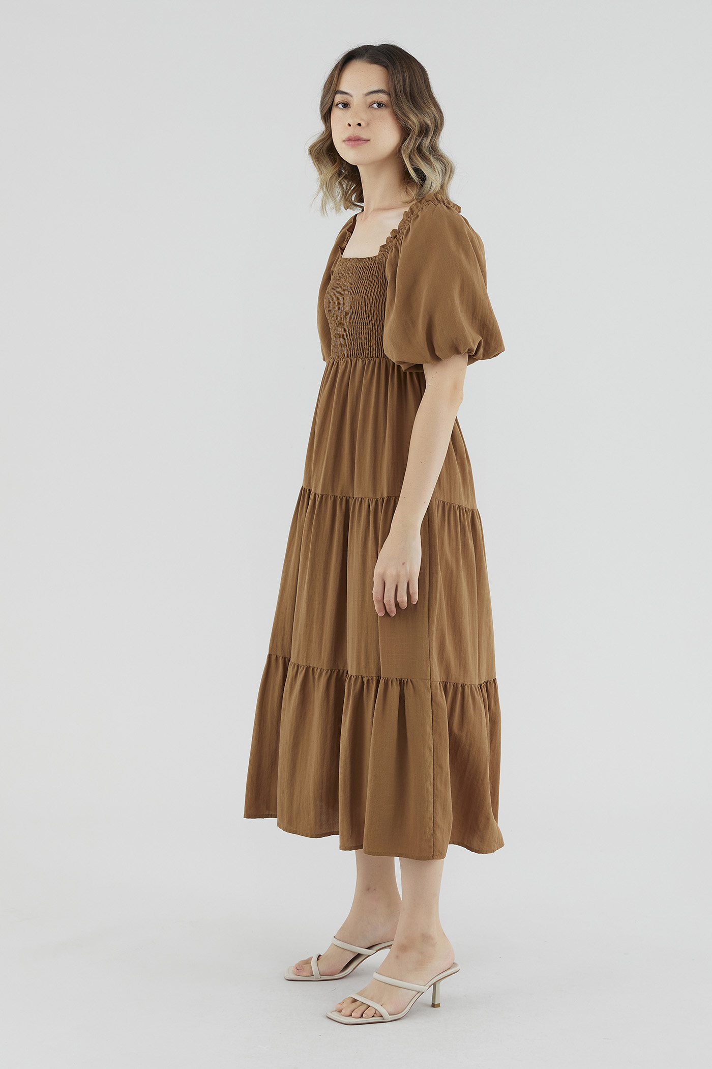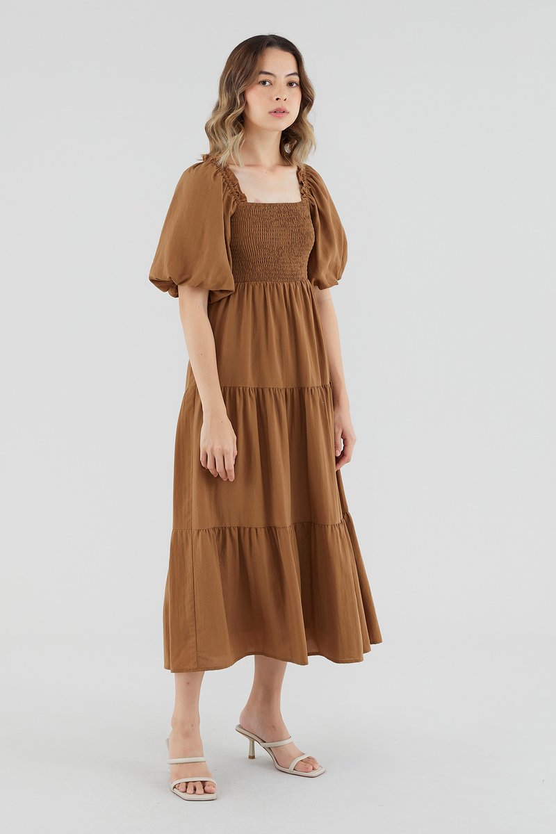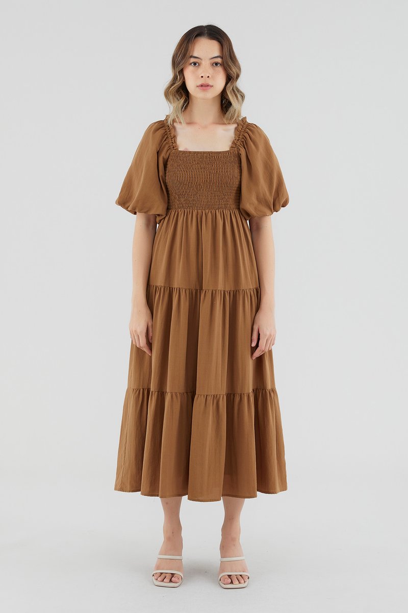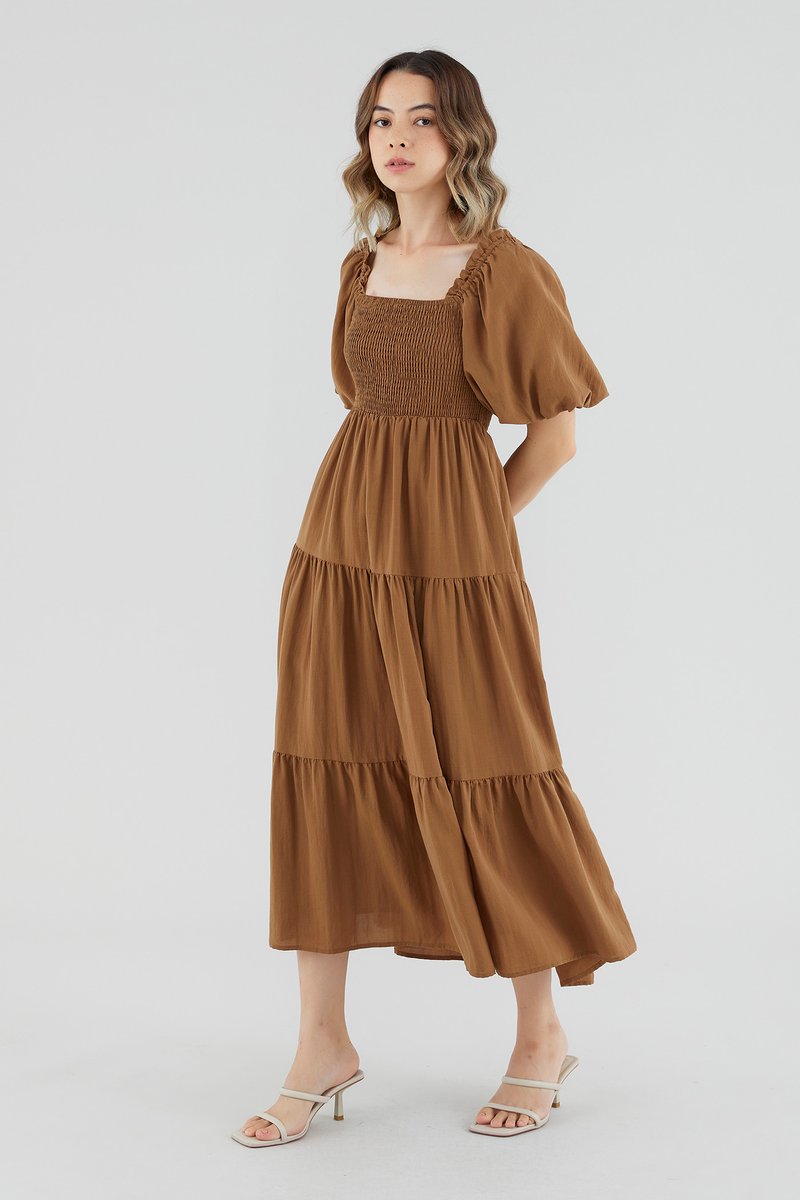 Easy textures meet everyday volume. Made from smooth and flowy fabric, this maxi dress features short puffed sleeves, a smocked bodice and a frilled, elasticated square neckline that may be worn on or off the shoulder. Fits slimmer around the bodice before flaring out in a relaxed tiered skirt.
