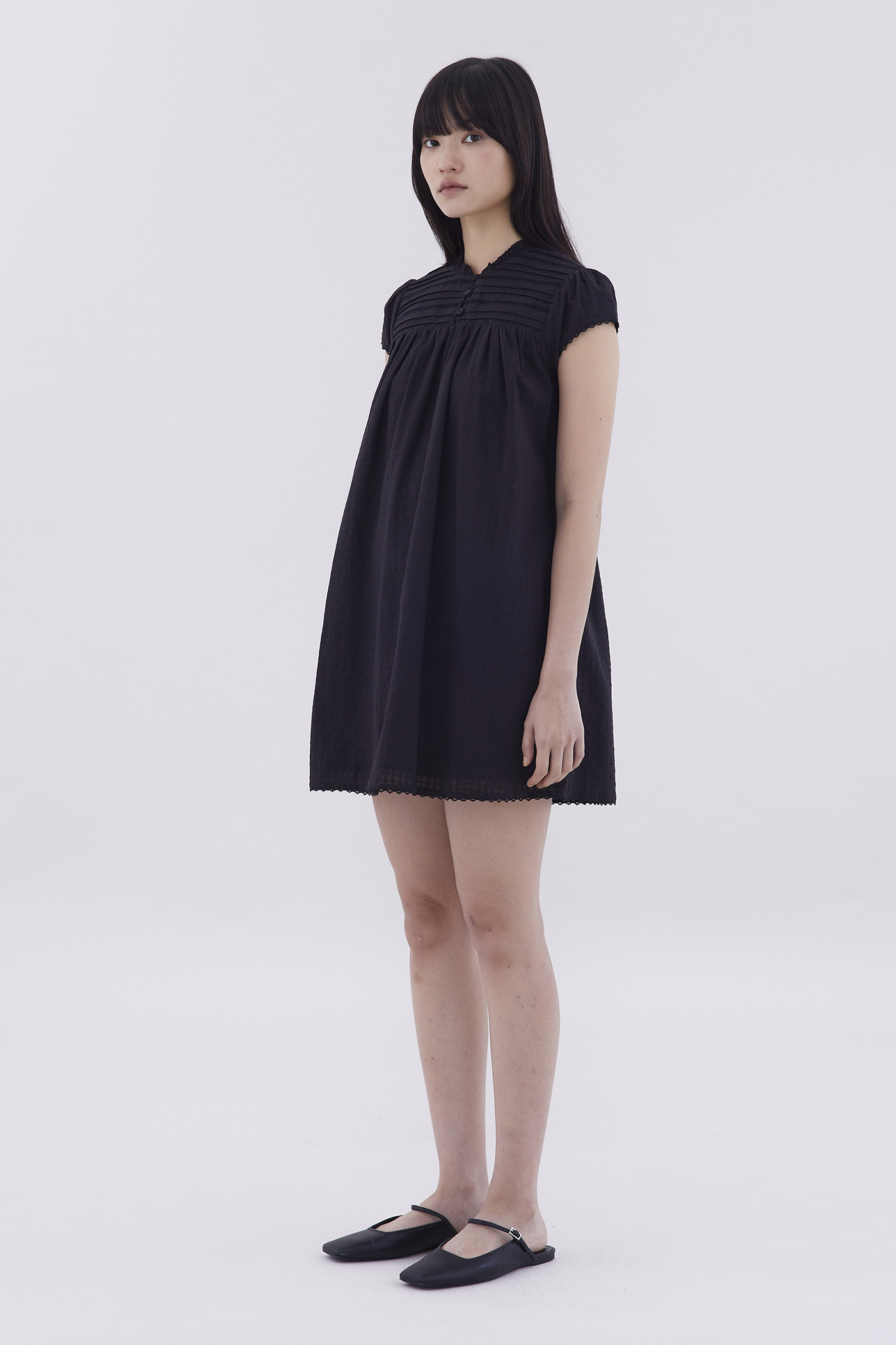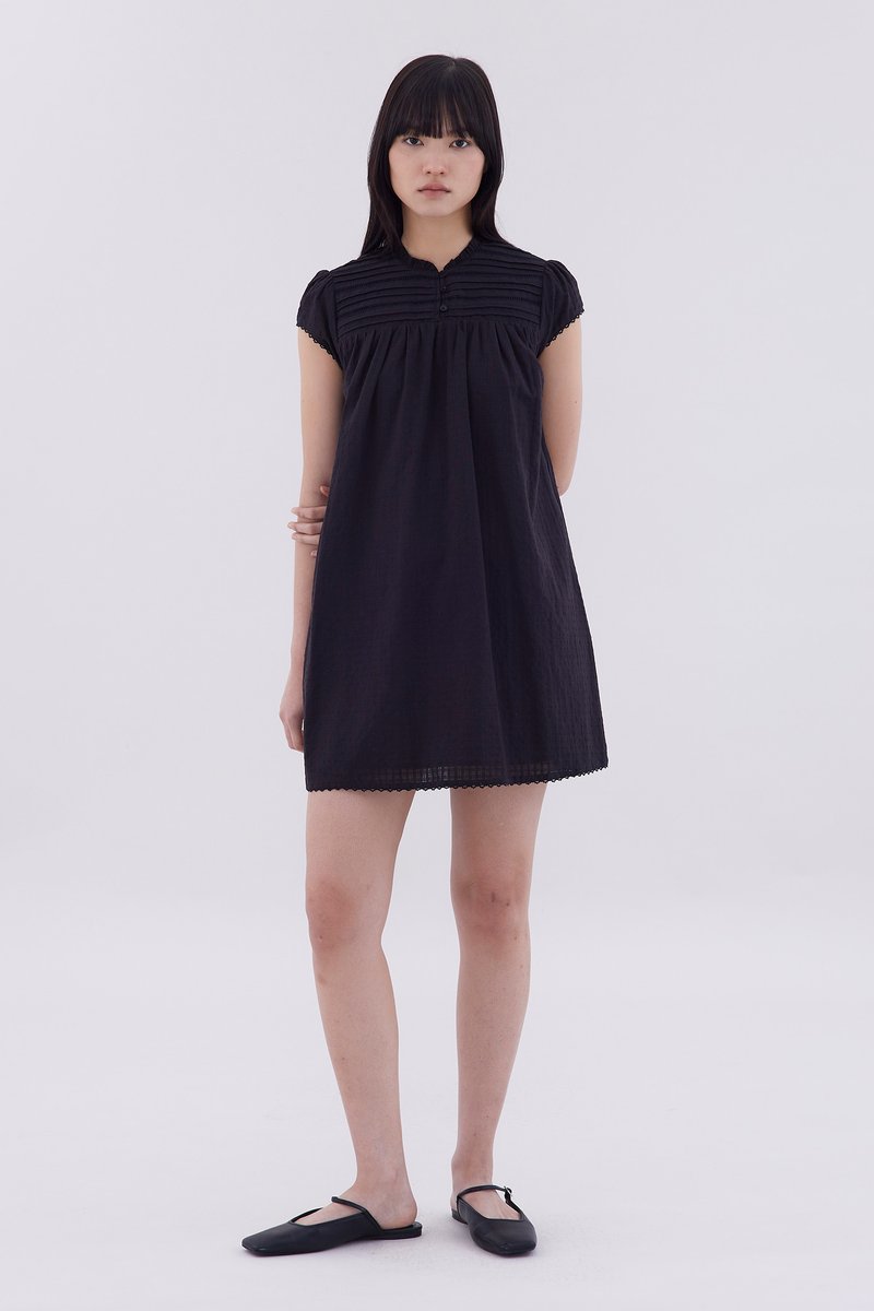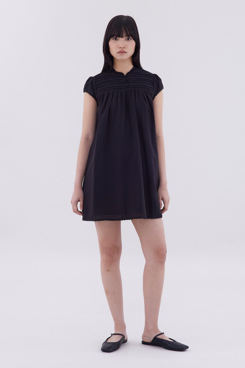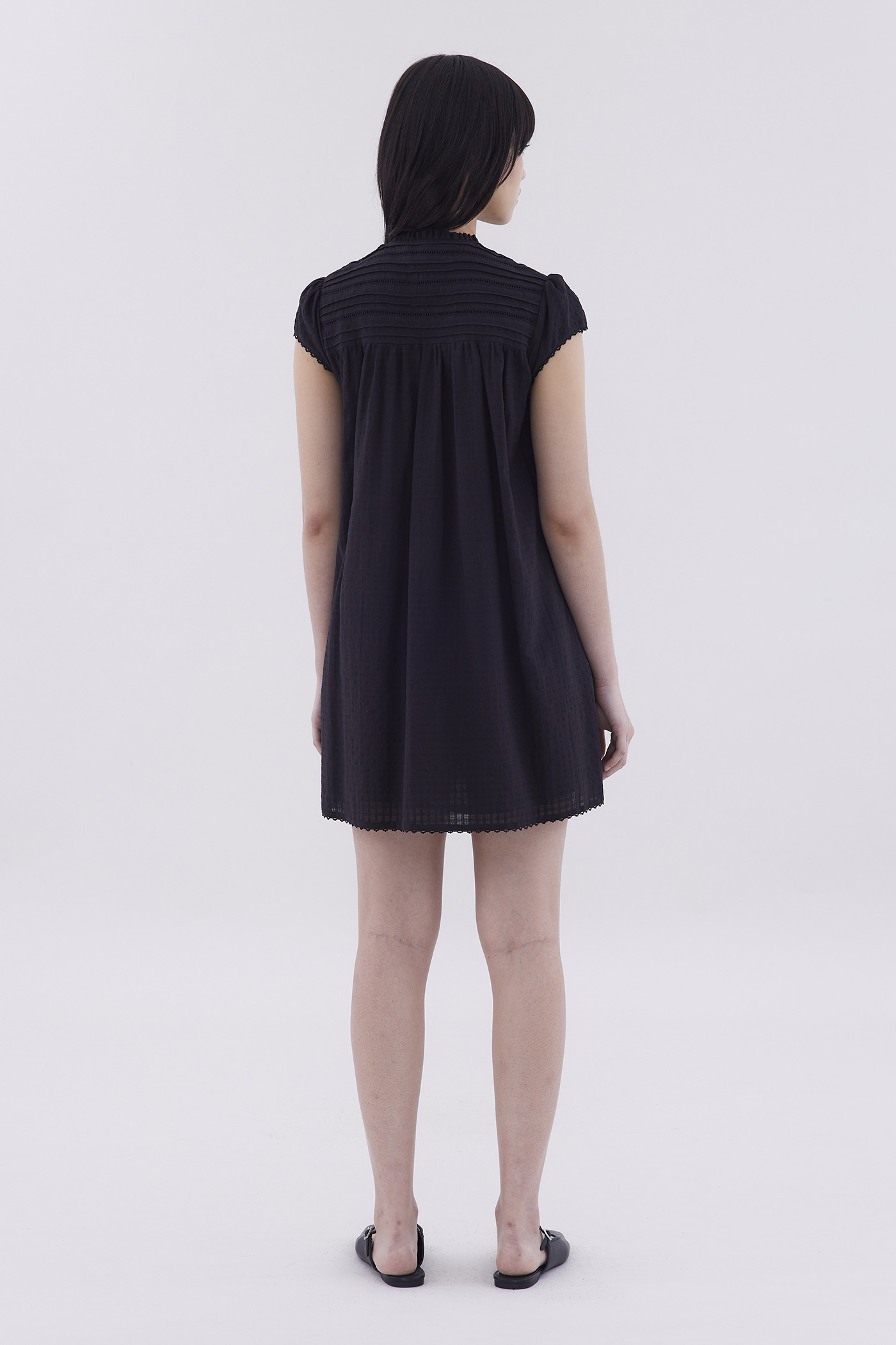 Summer’s best. Cut from airy and softly structured seersucker cotton, this above-the-knee dress features a round ruffle-trimmed neckline, lace-trimmed cap sleeves, top pleats with lace accents, front loop buttons and a lace-trimmed hemline. Worn in a relaxed fit.