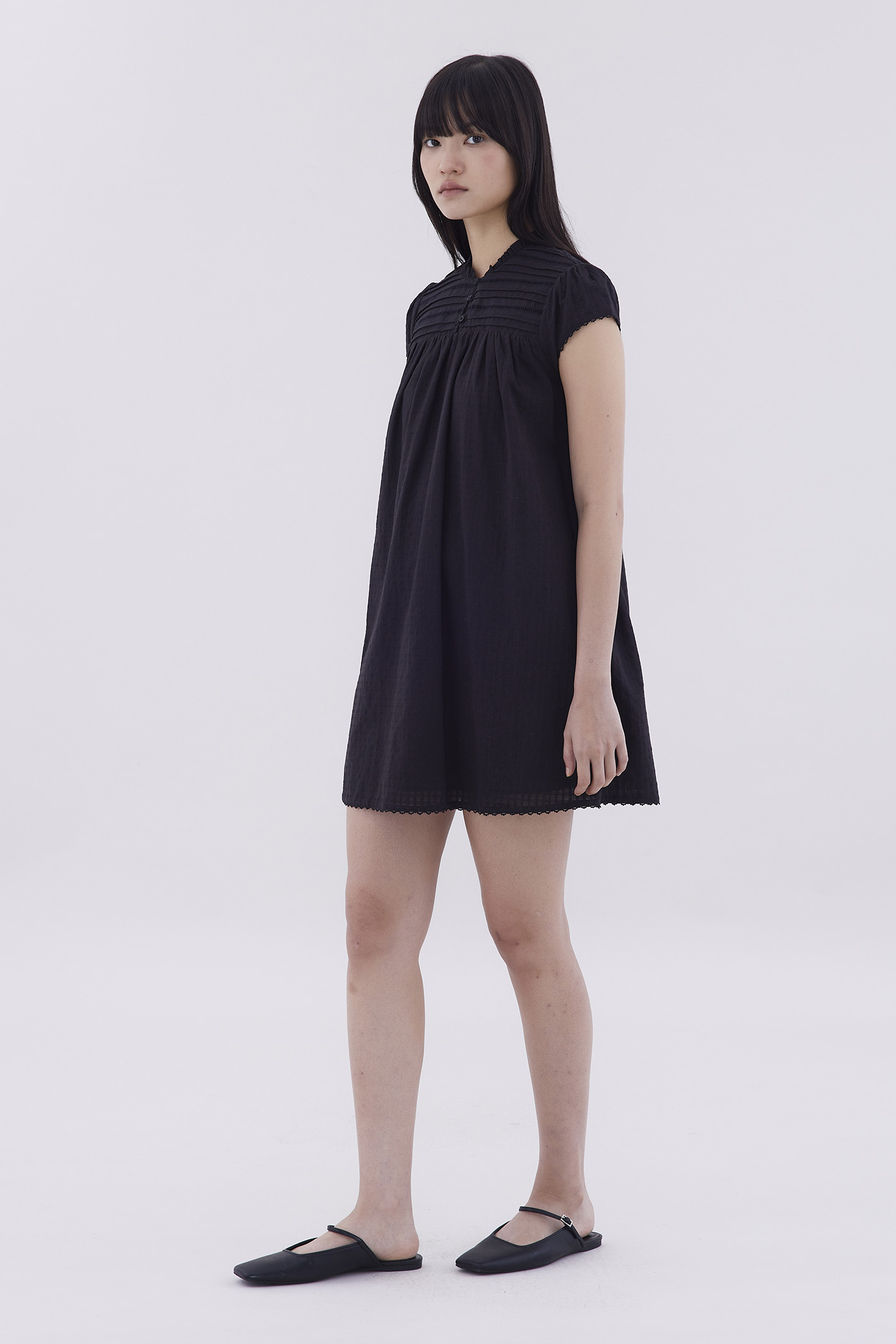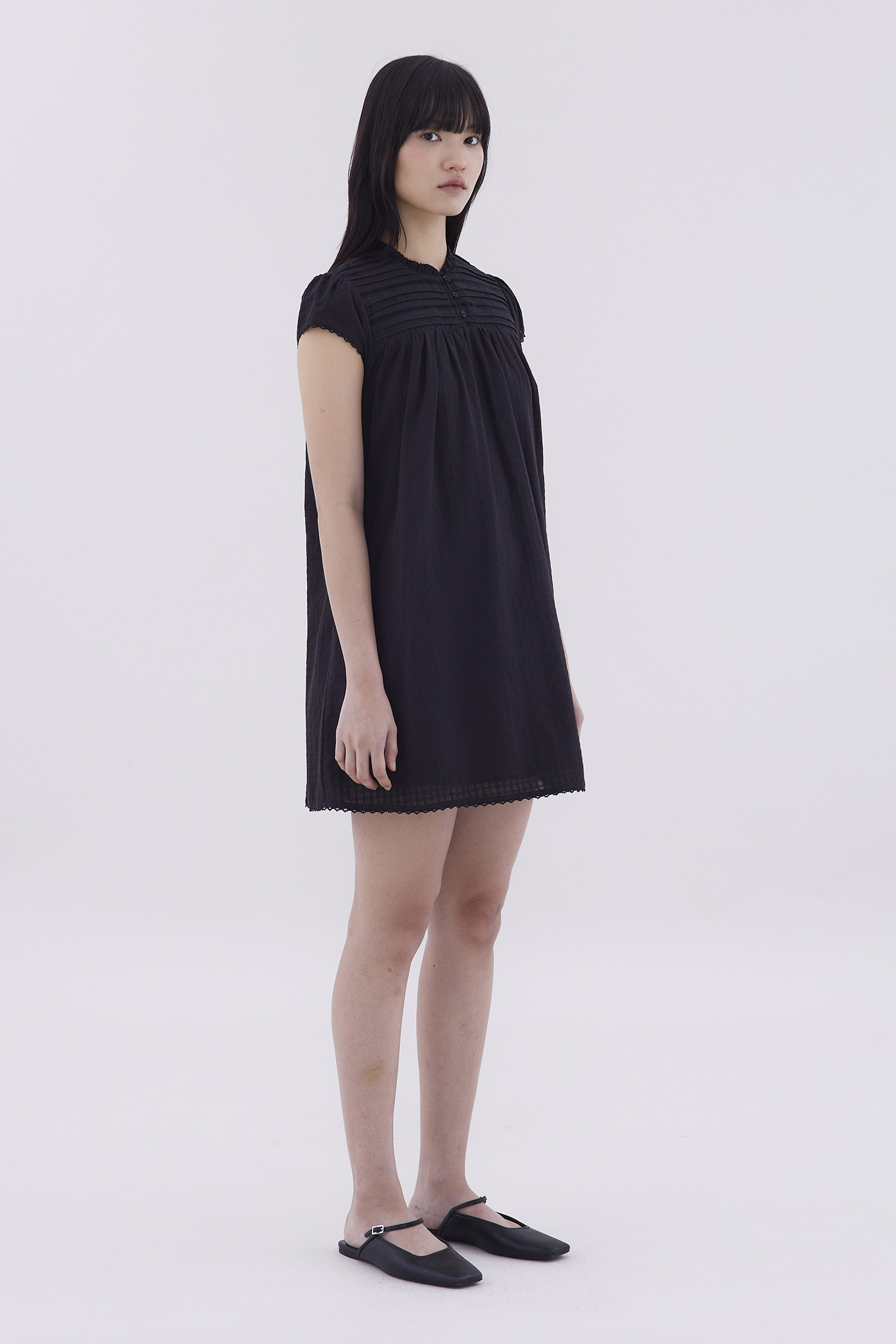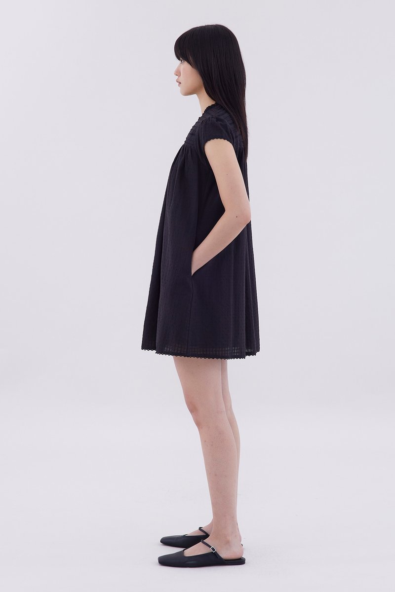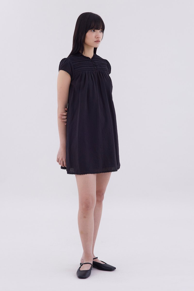 Summer’s best. Cut from airy and softly structured seersucker cotton, this above-the-knee dress features a round ruffle-trimmed neckline, lace-trimmed cap sleeves, top pleats with lace accents, front loop buttons and a lace-trimmed hemline. Worn in a relaxed fit.