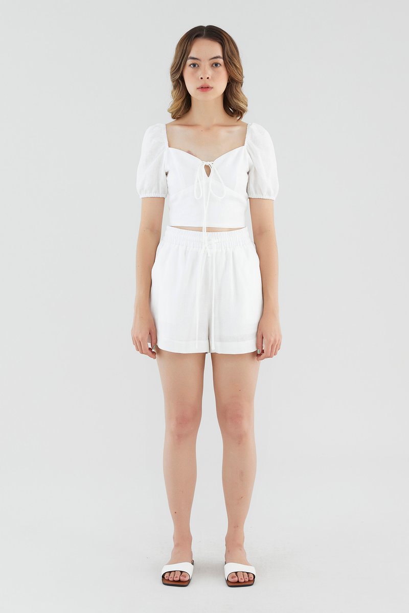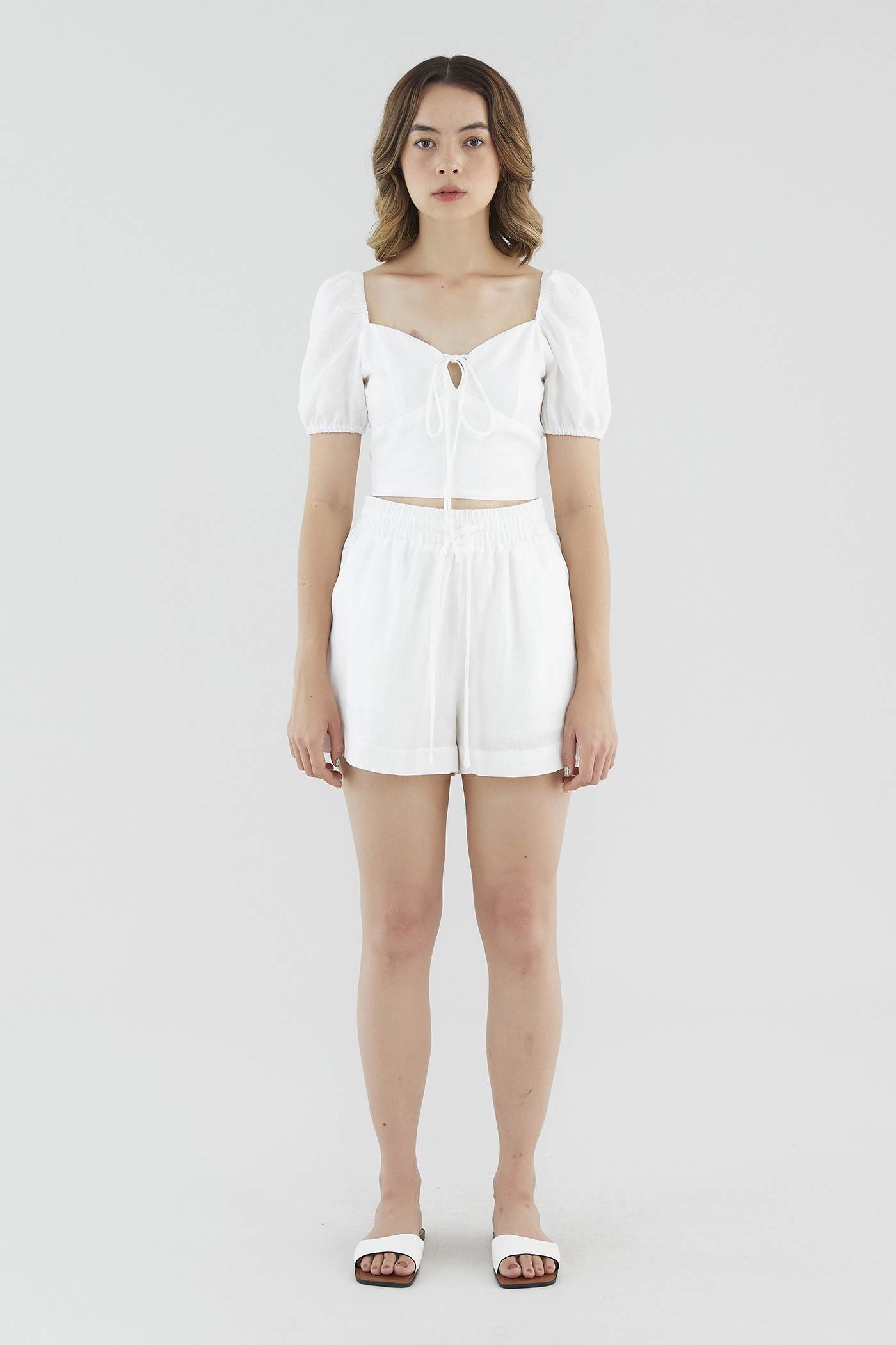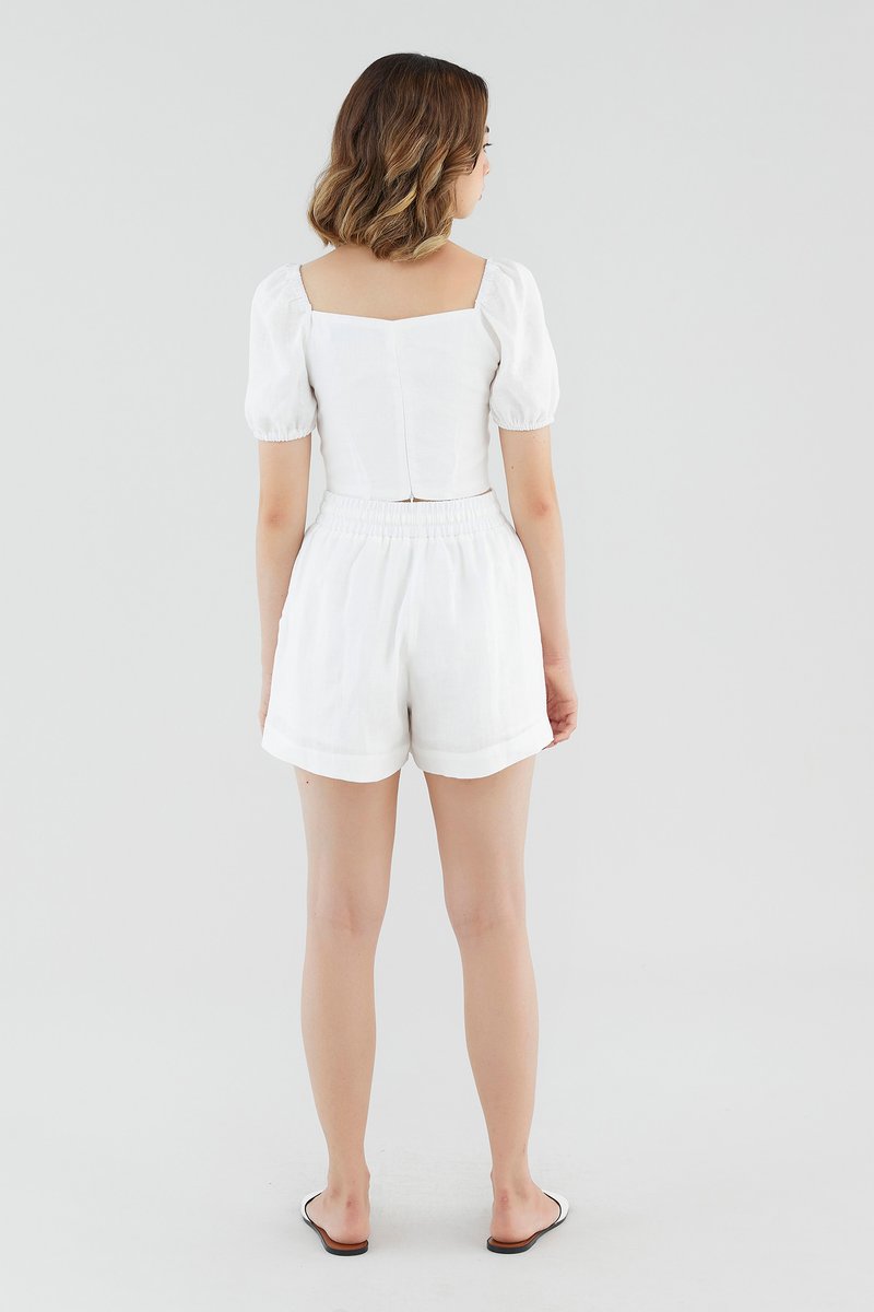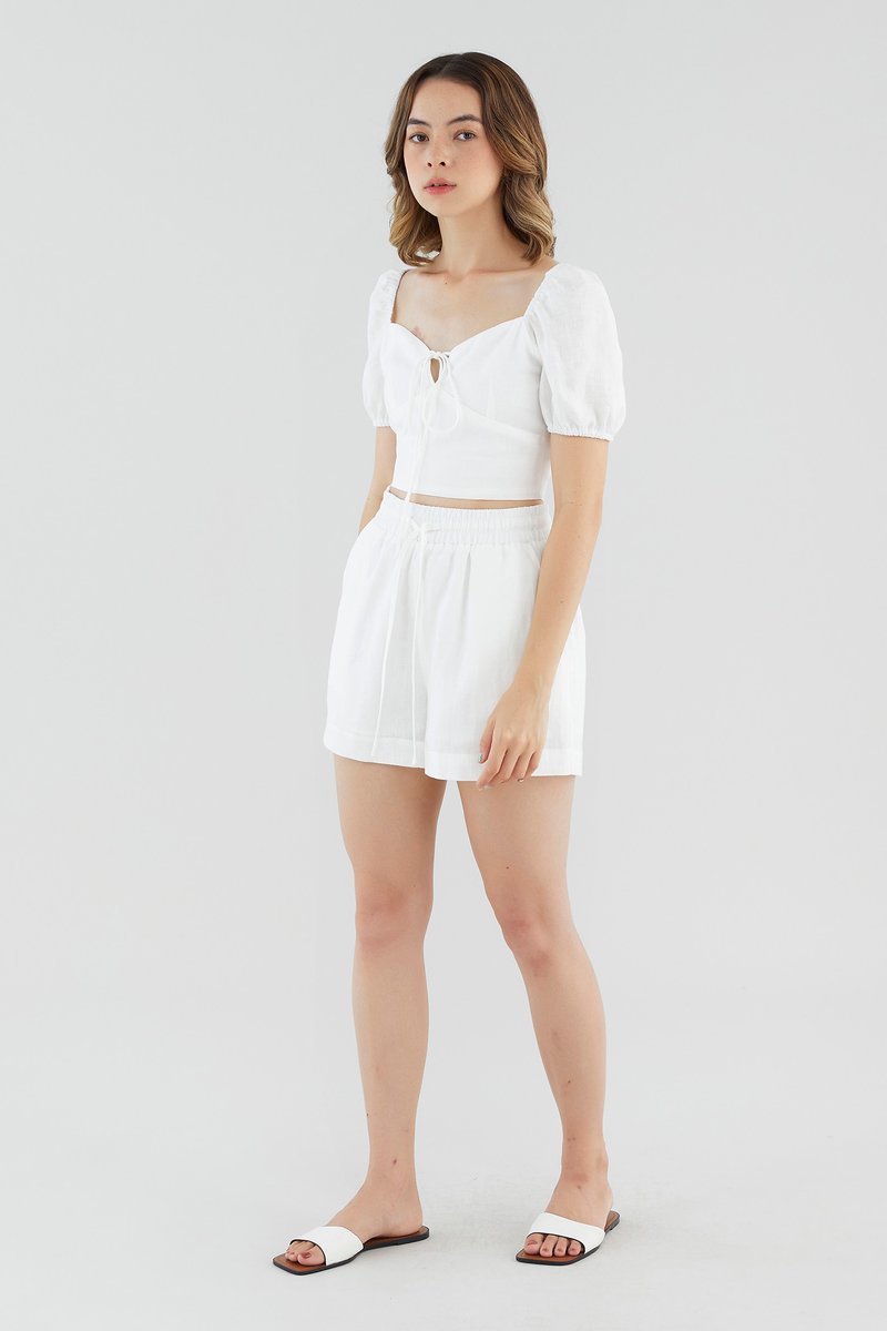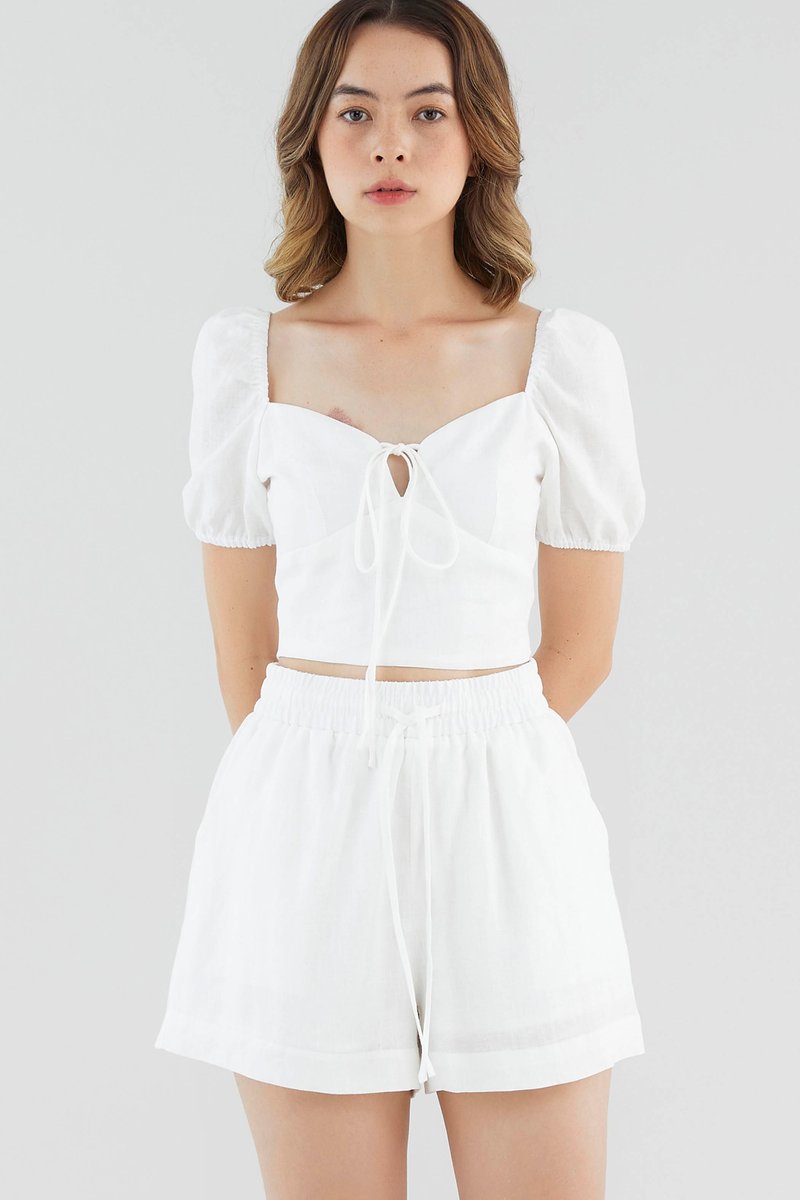 <p><span style="font-weight: 400;">Fabric composition: 100% Linen</span></p> <p><span style="font-weight: 400;">Lining: Full</span></p> <p><span style="font-weight: 400;">Sheerness: Not sheer</span></p> <p><span style="font-weight: 400;">Pockets: None</span></p> <p><span style="font-weight: 400;">Look casually put-together. Made from lightweight and non-stretch 100% linen, this blouse features short puff sleeves with an elasticated hem, a self-tie closure on the front and a subtle sweetheart neckline. Worn in a slim fit and cropped length. </span></p> <p><span style="font-weight: 400;">Care Instructions: Do not soak / Do not bleach / Handwash or Machine wash on gentle mode / Do not machine dry / Iron using low heat</span></p> <p><i><span style="font-weight: 400;">This piece is made from 100% linen, the unsung hero of hot days and one of the least environmentally damaging fabrics. Derived from the unfussy flax plant, not only does its cultivation consume significantly less water, pesticides and arable land — but linen’s excellent durability and biodegradable nature also means your clothes have a longer, more waste-free life cycle.</span></i></p>