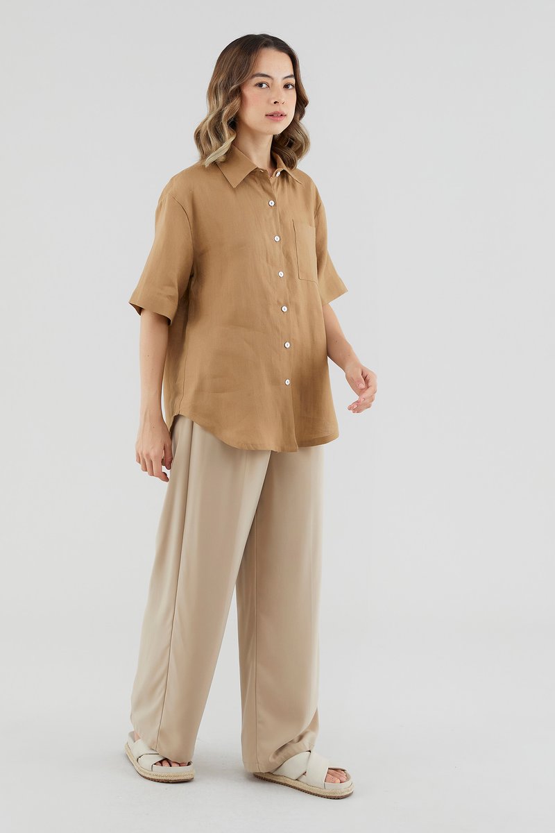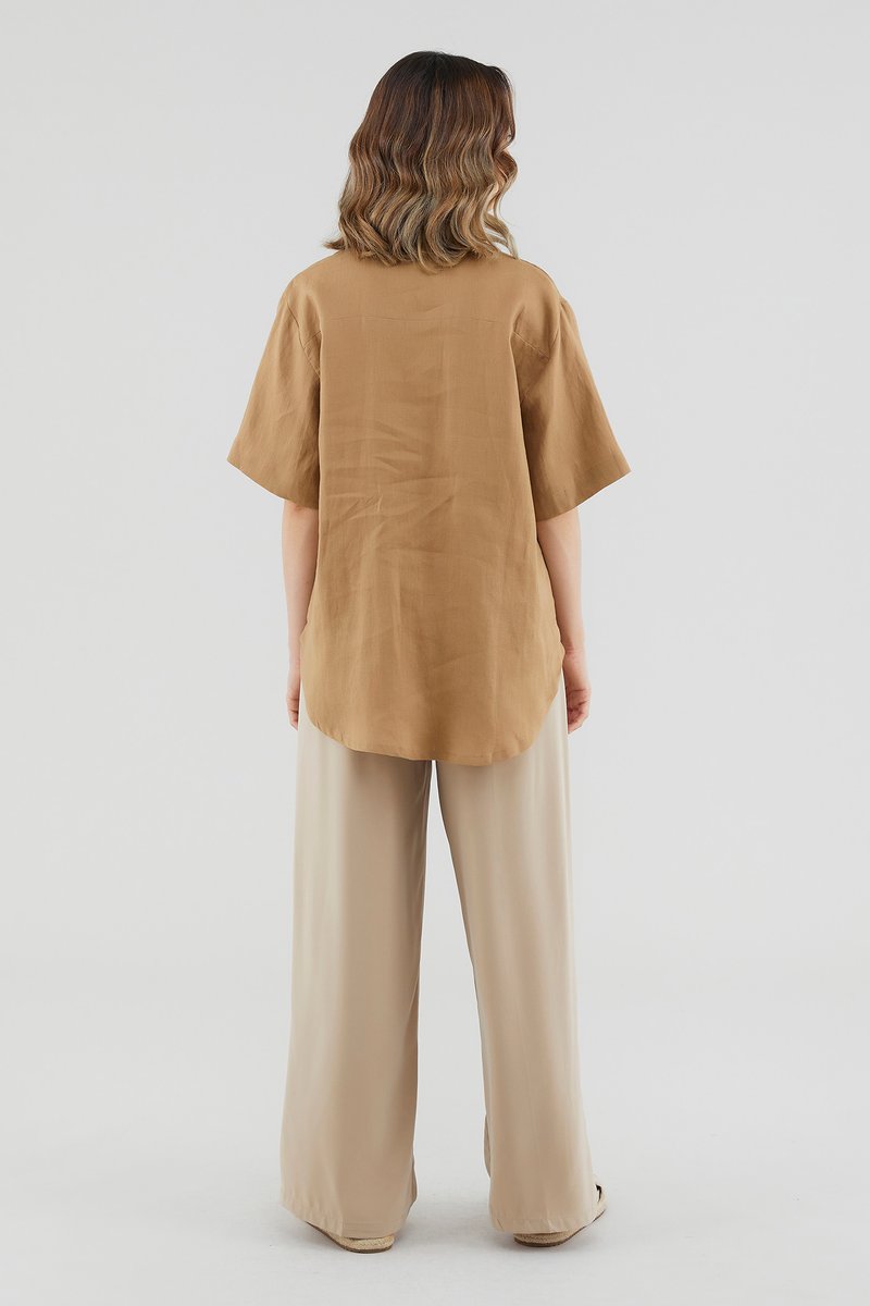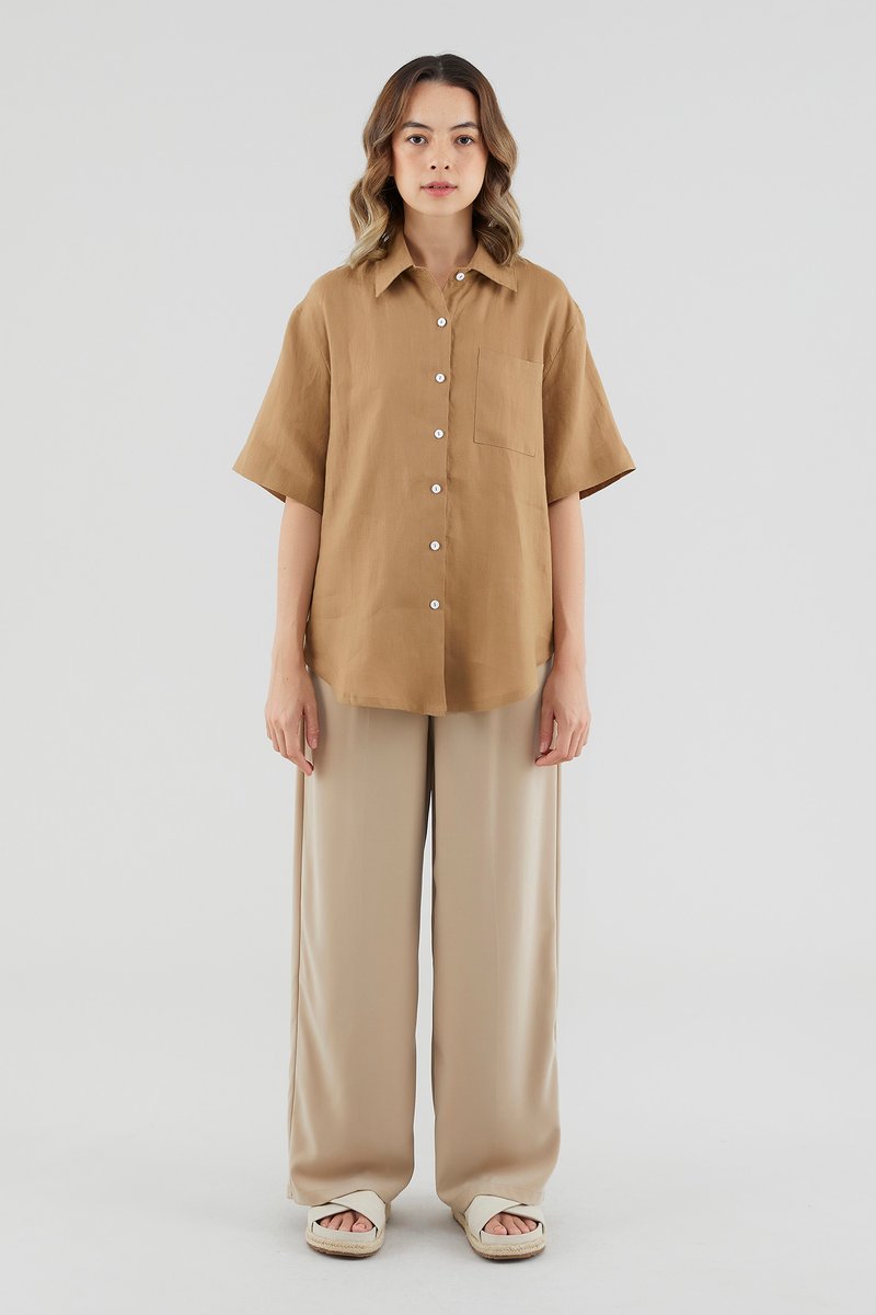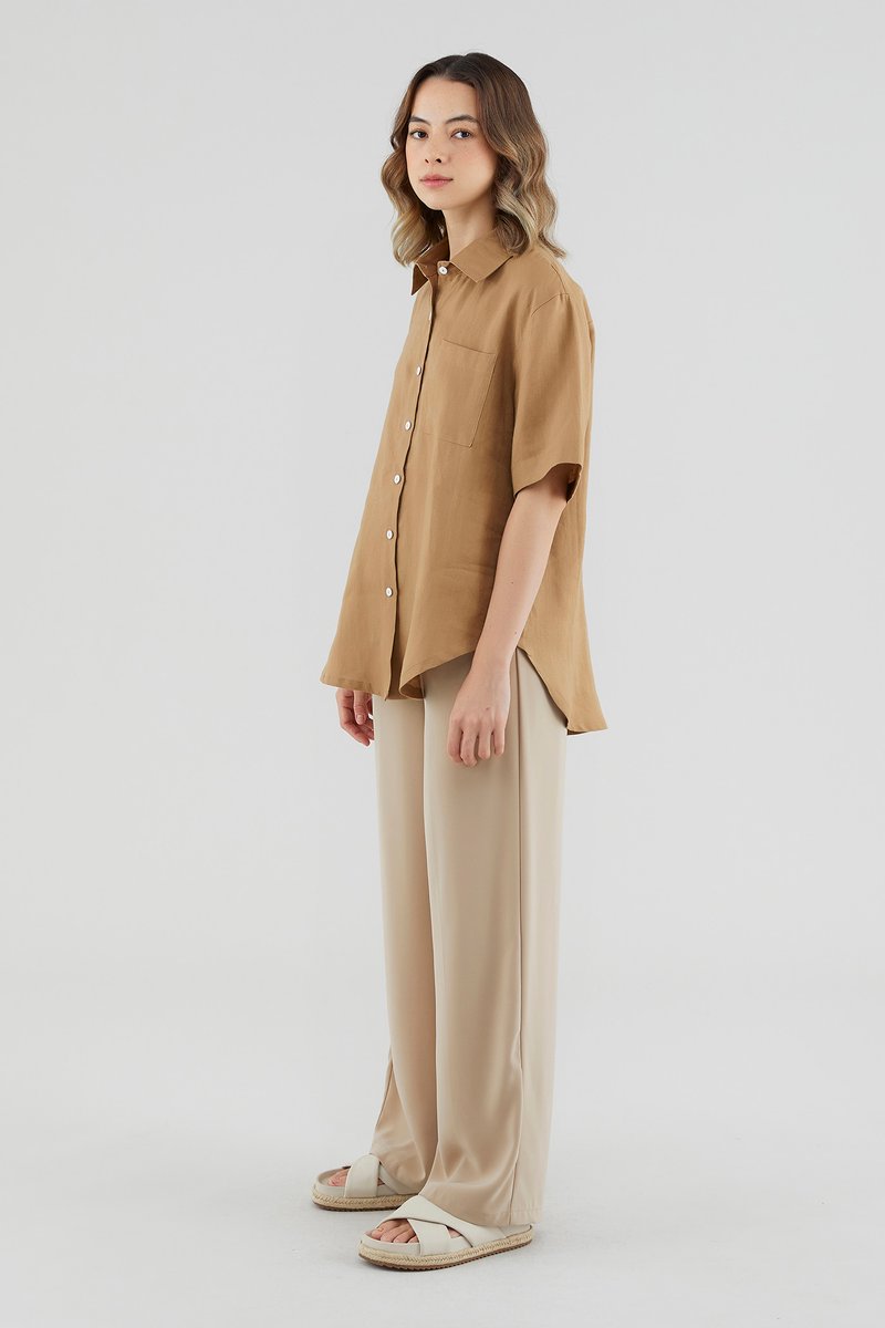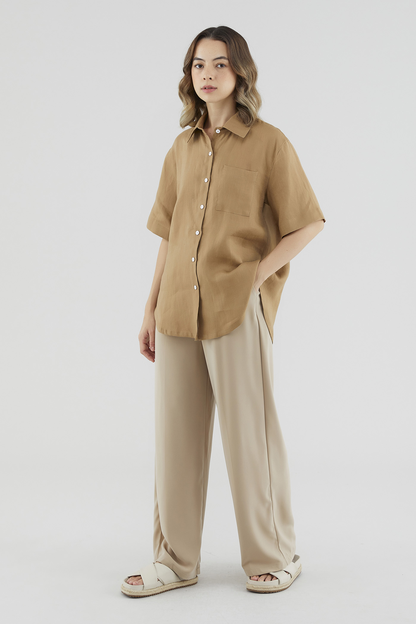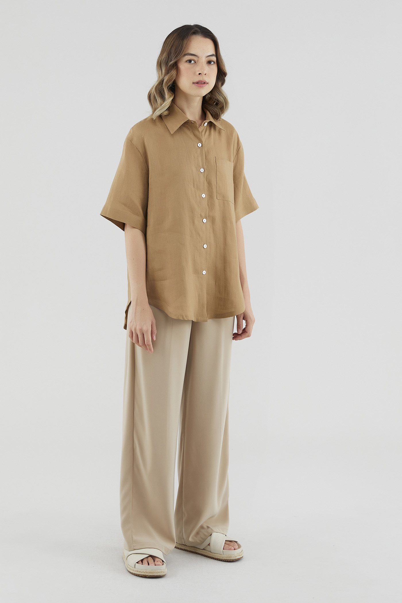 A sun-day staple. Cut from airy and softly tailored 100% linen, this shirt features short sleeves, a front button-down closure and a high-low hemline. Worn in a relaxed, oversized fit.