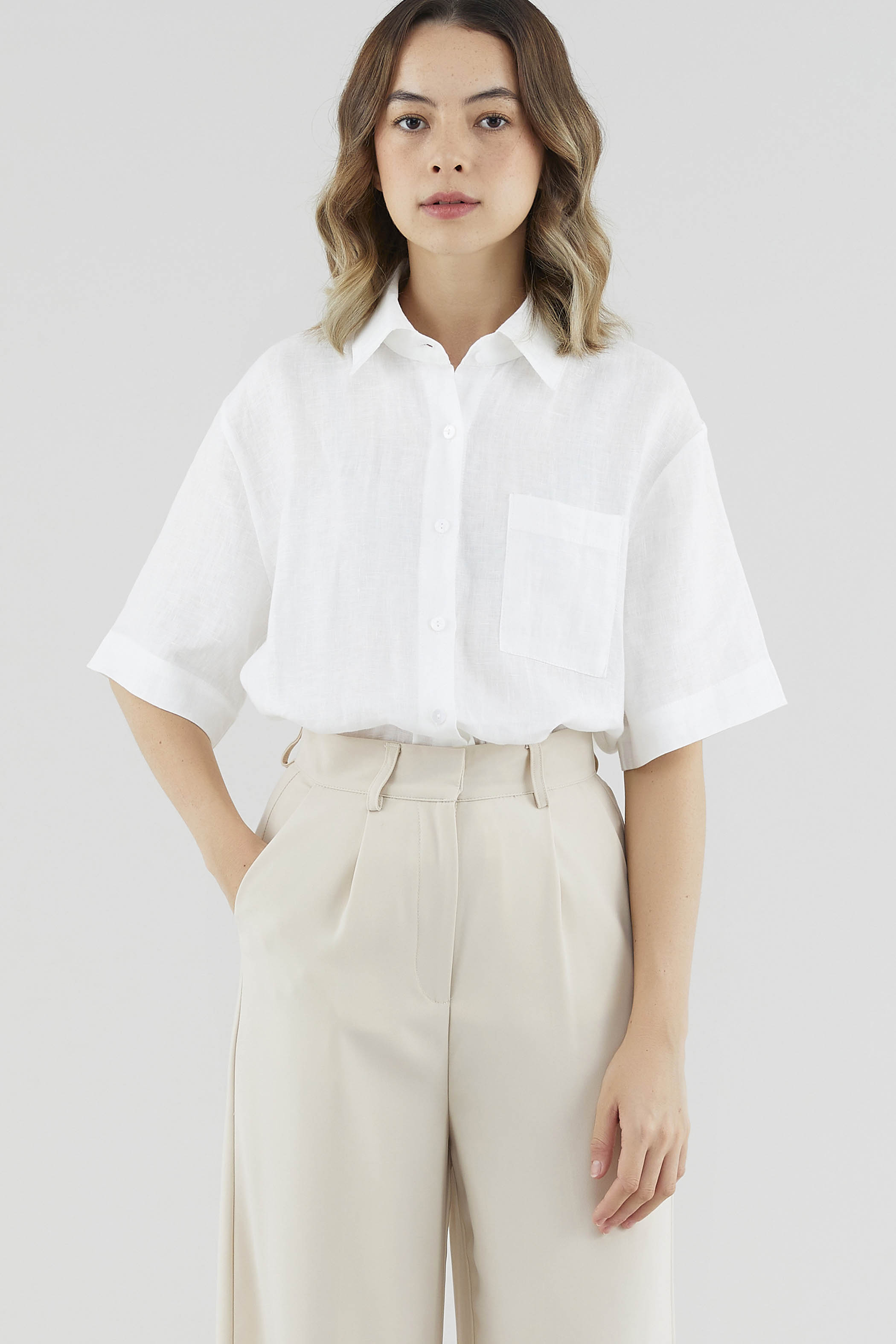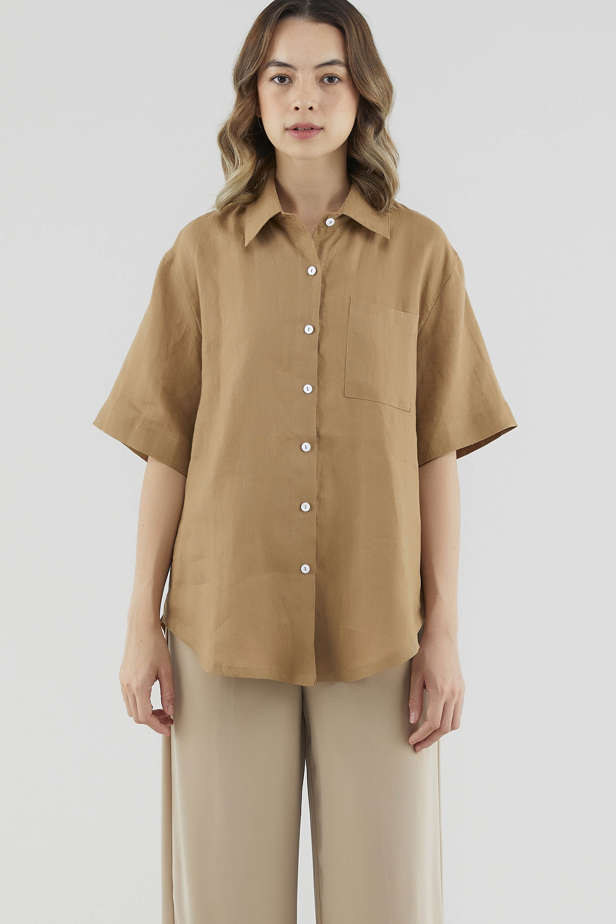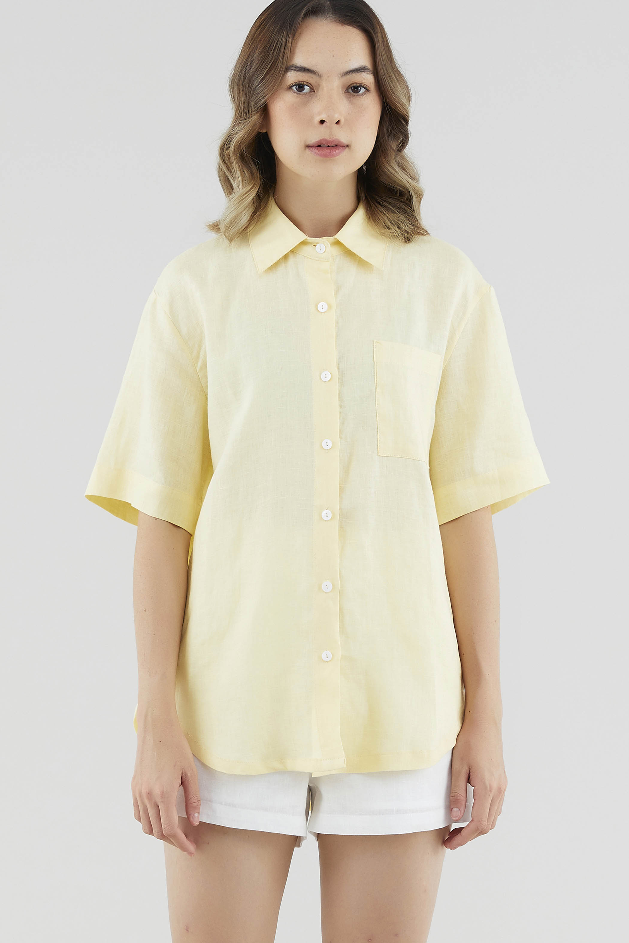 A sun-day staple. Cut from airy and softly tailored 100% linen, this shirt features short sleeves, a front button-down closure and a high-low hemline. Worn in a relaxed, oversized fit.