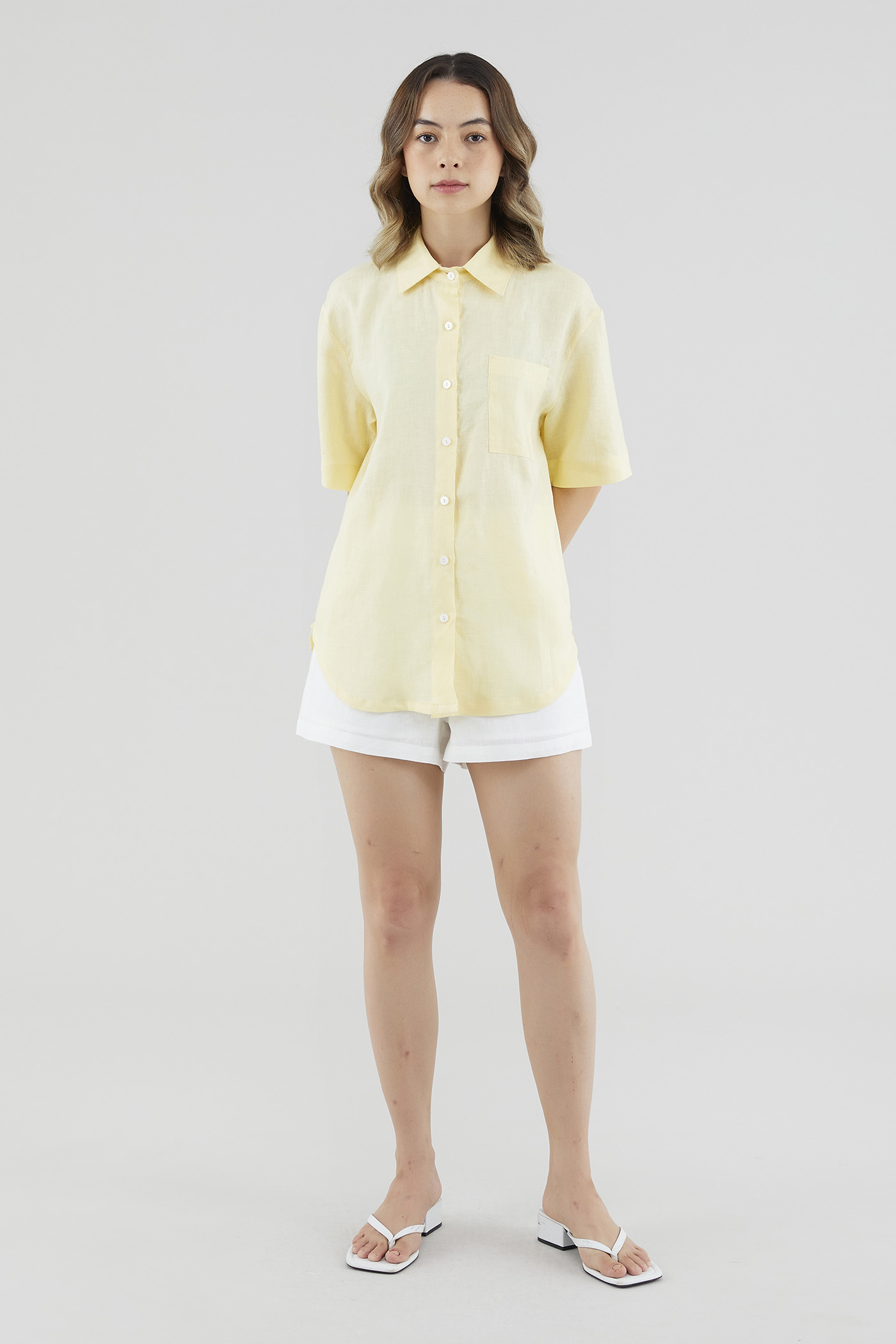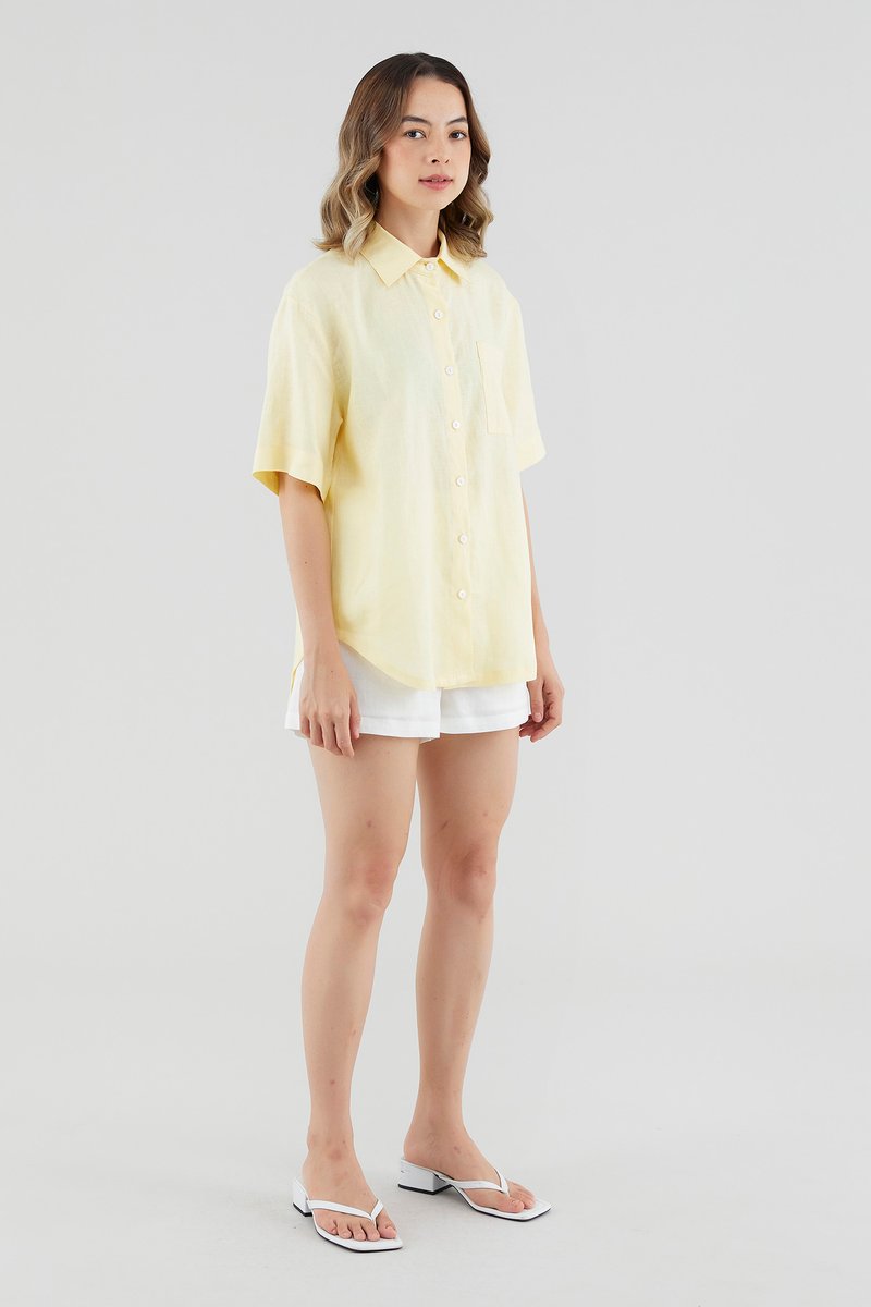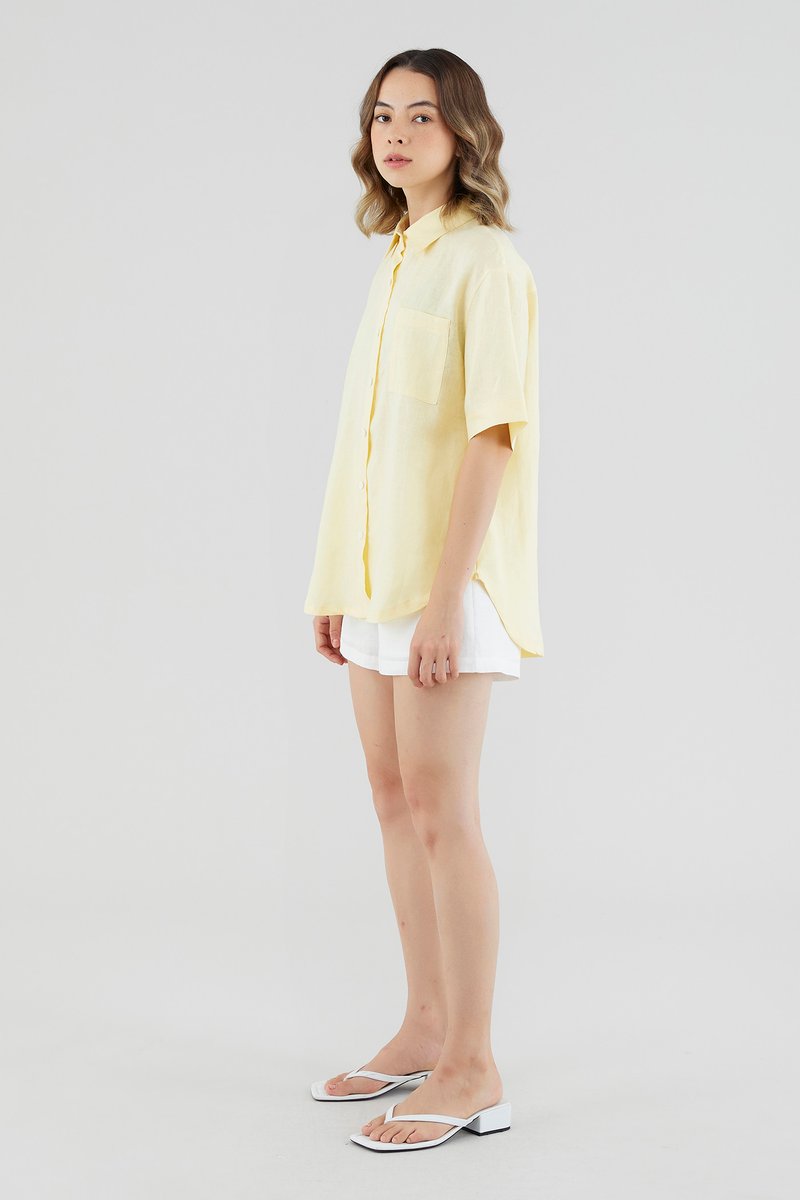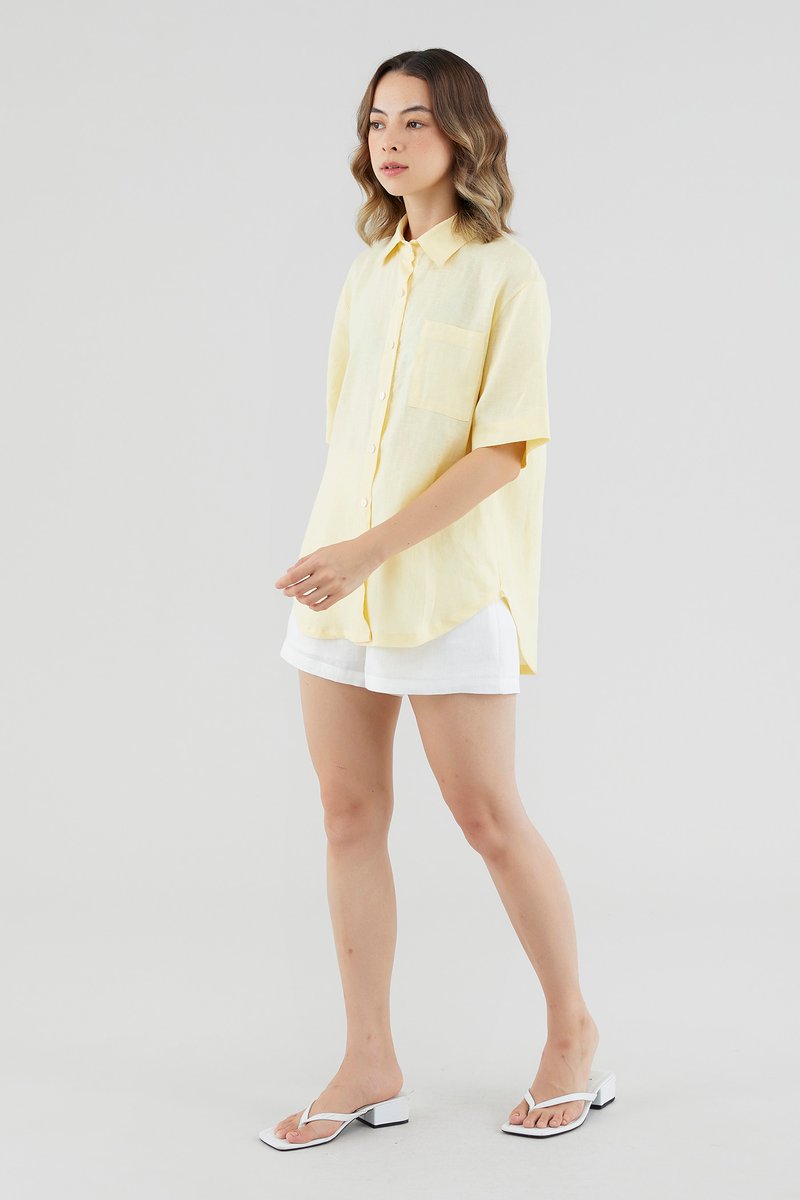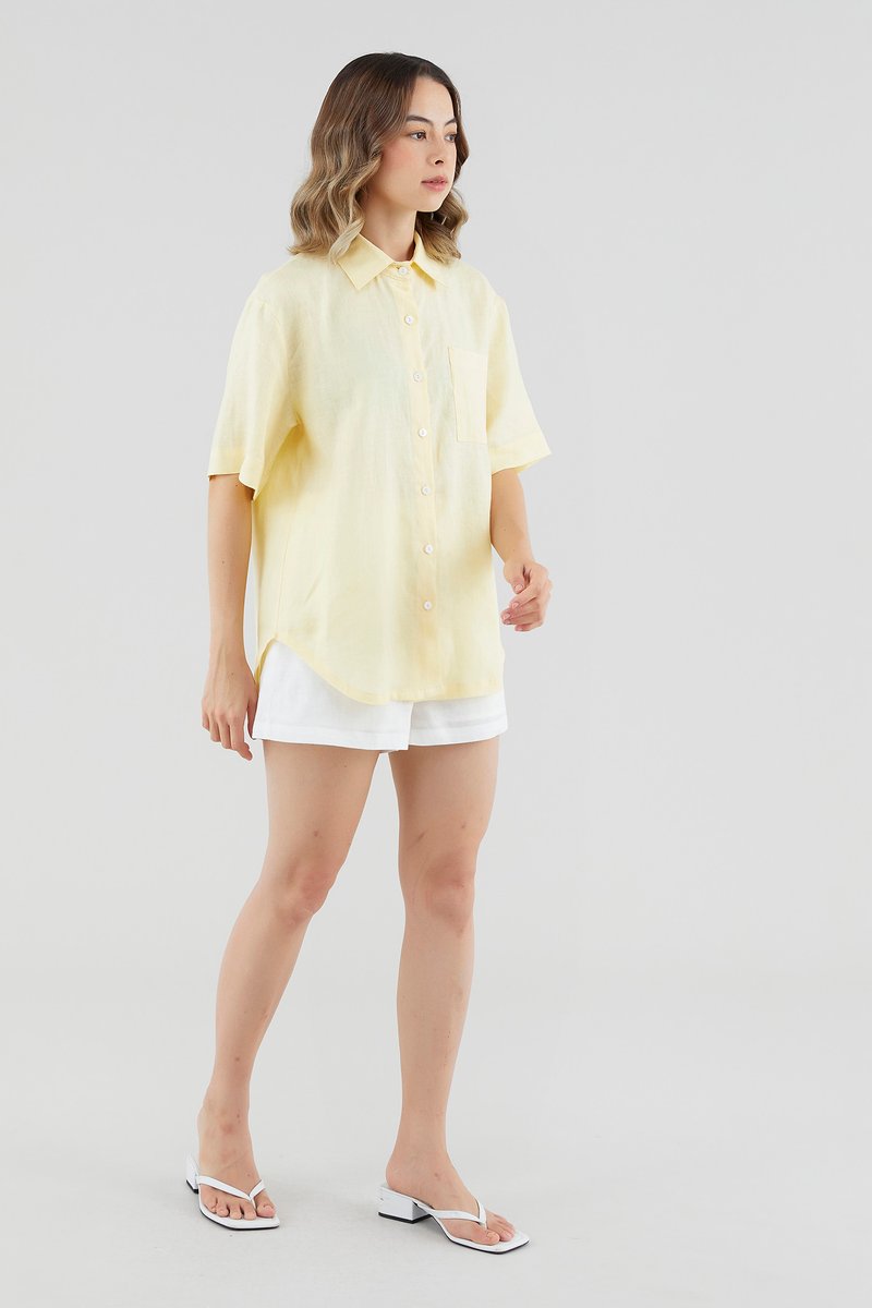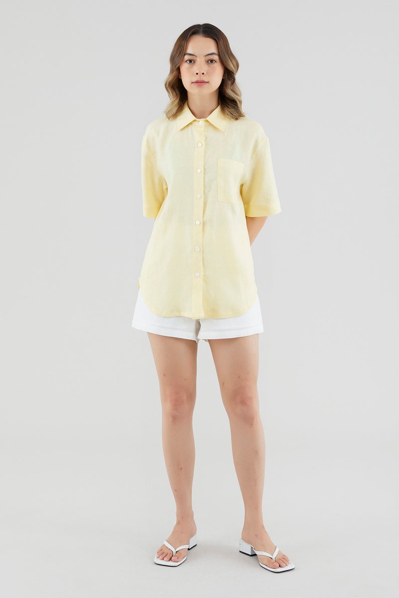 A sun-day staple. Cut from airy and softly tailored 100% linen, this shirt features short sleeves, a front button-down closure and a high-low hemline. Worn in a relaxed, oversized fit.