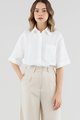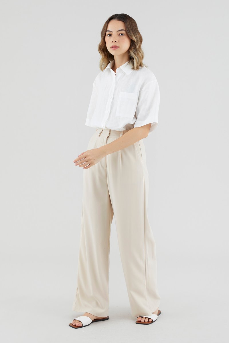 A sun-day staple. Cut from airy and softly tailored 100% linen, this shirt features short sleeves, a front button-down closure and a high-low hemline. Worn in a relaxed, oversized fit.