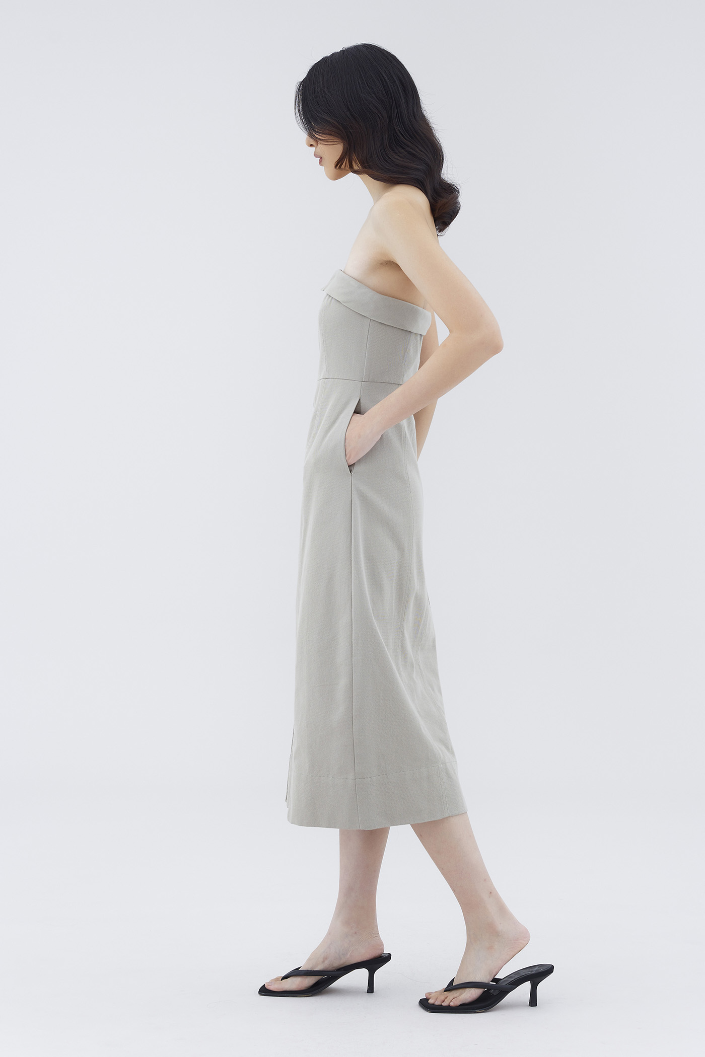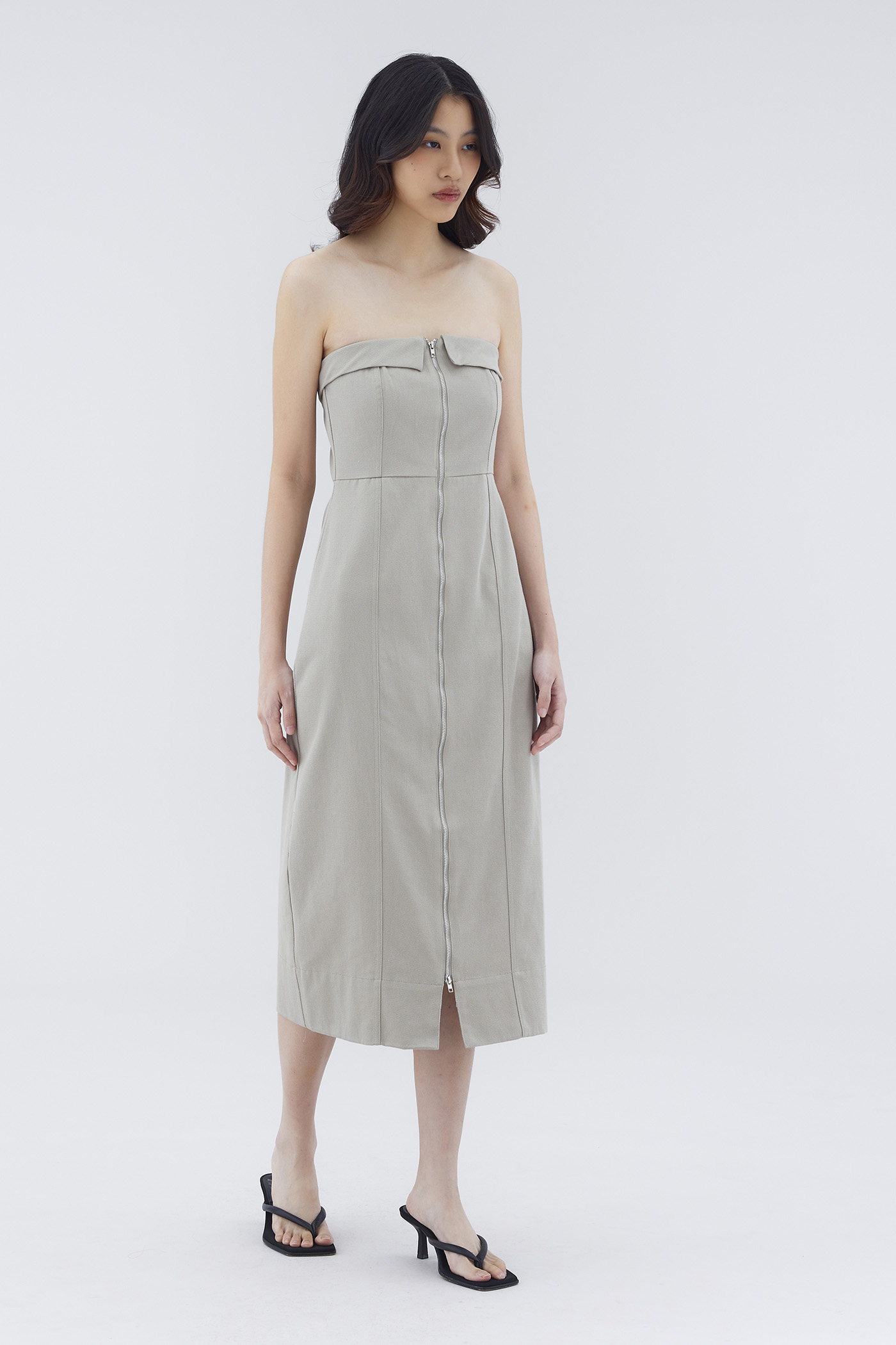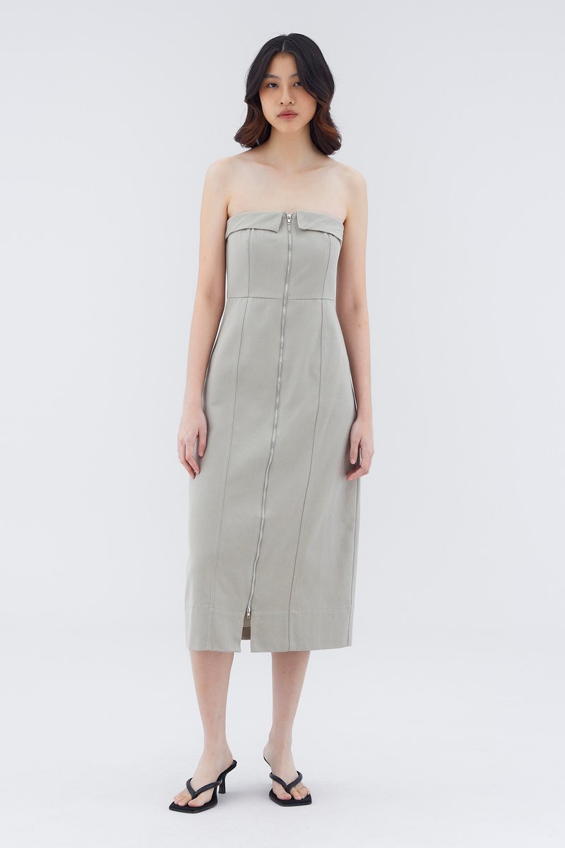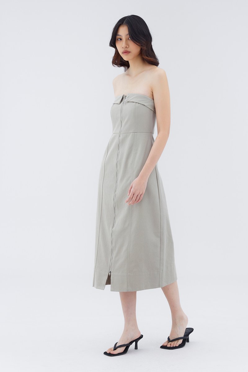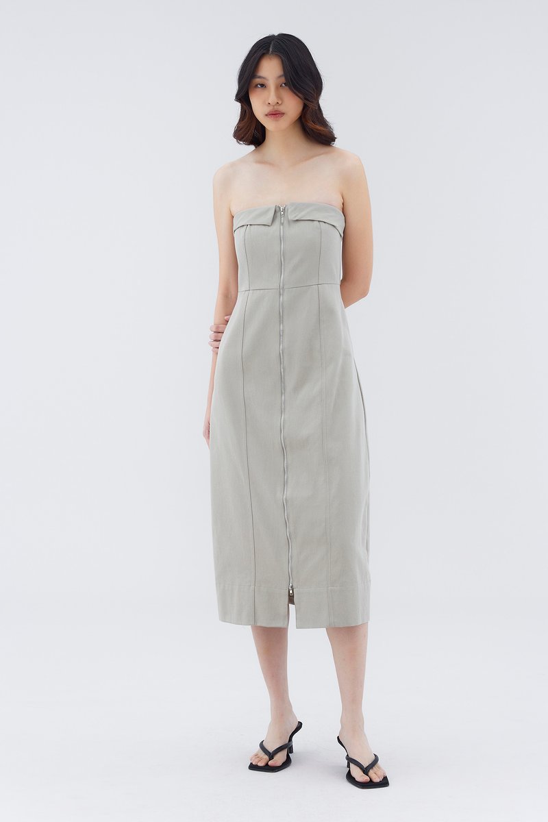 The whole package. Cut from softly structured heavyweight cotton twill, this strapless midi dress features panelling, a straight, fold-over neckline, two side pockets and a two-way front zip with an adjustable centre slit. Worn in a slim fit.
