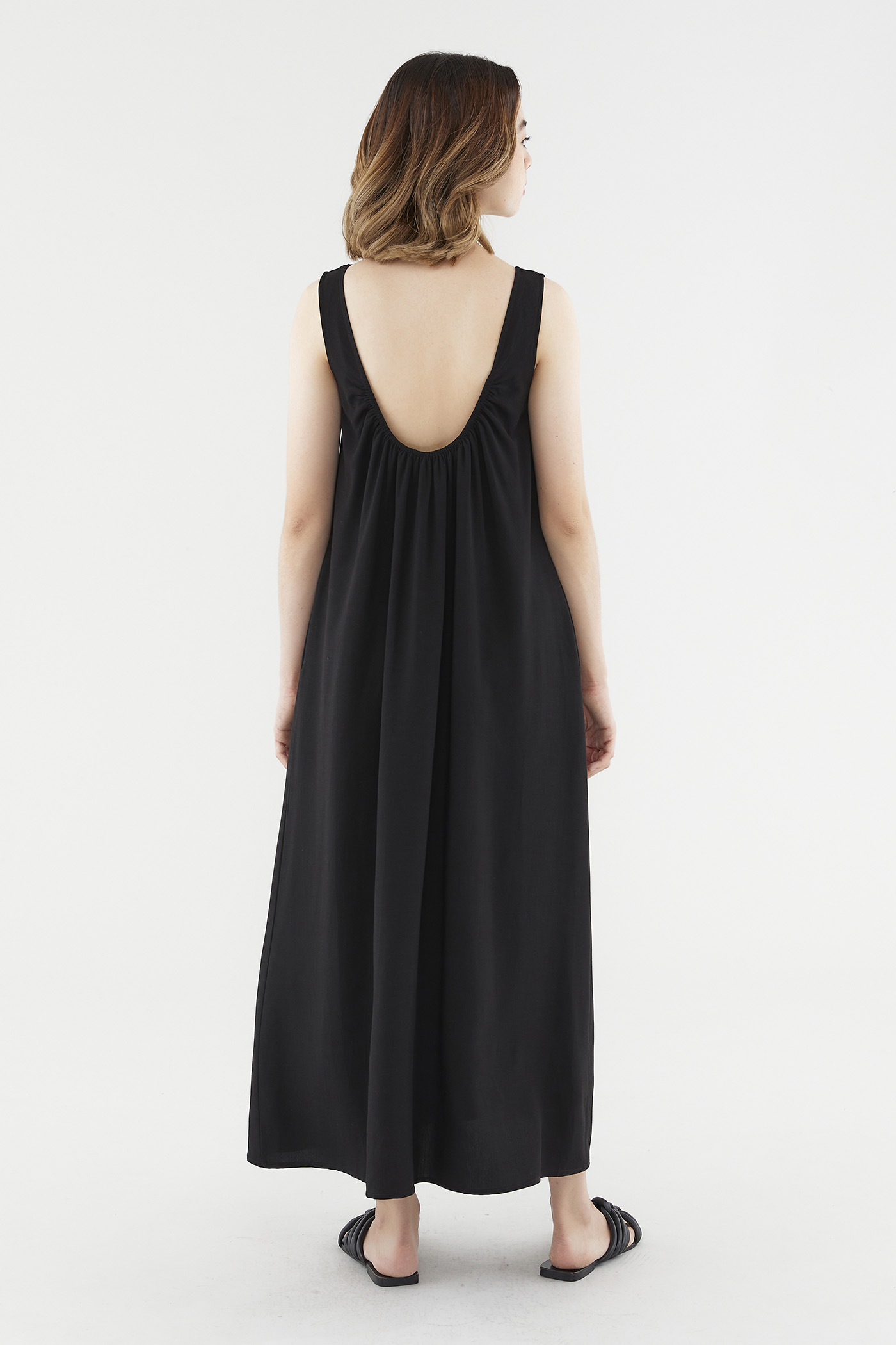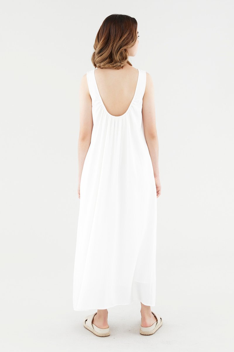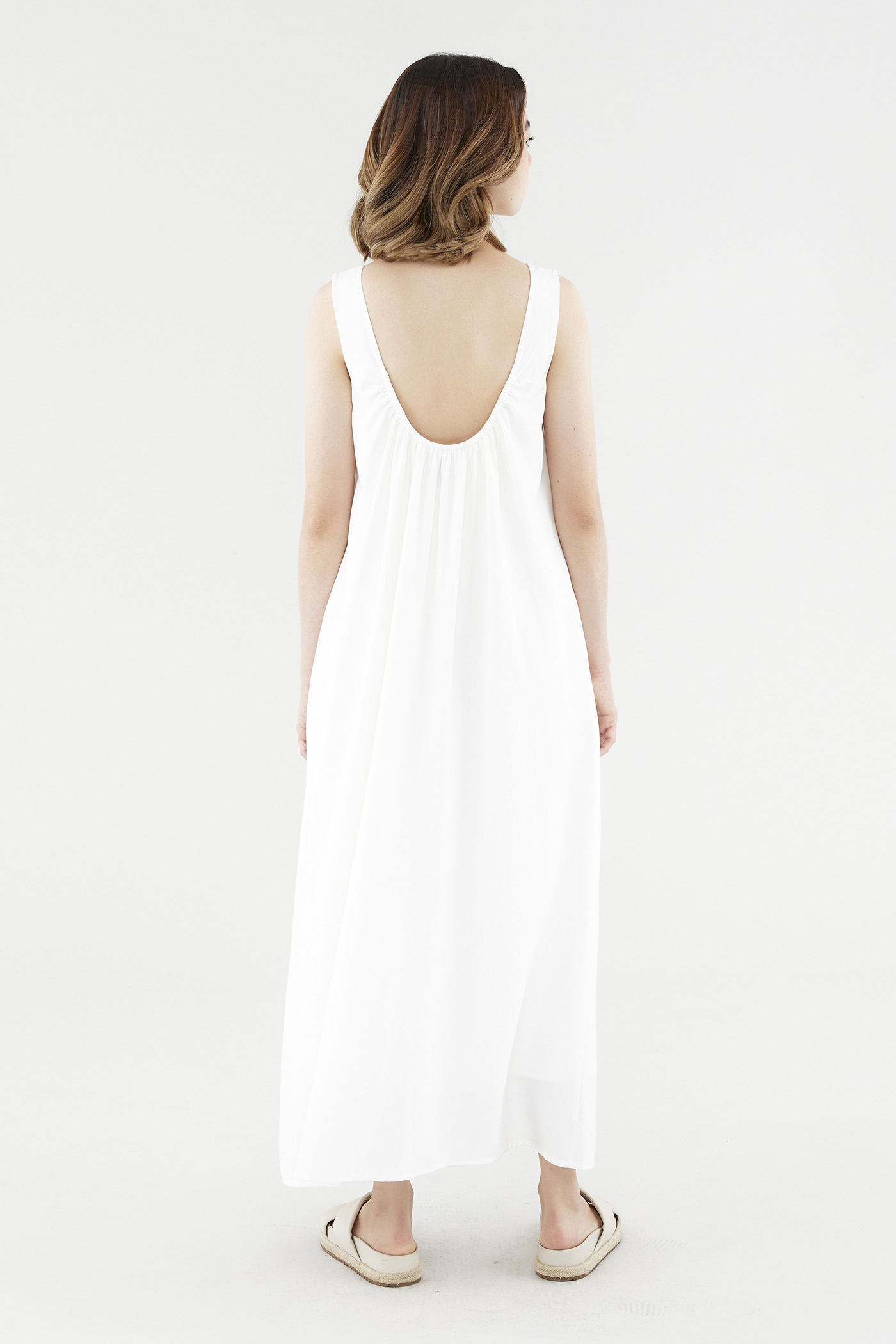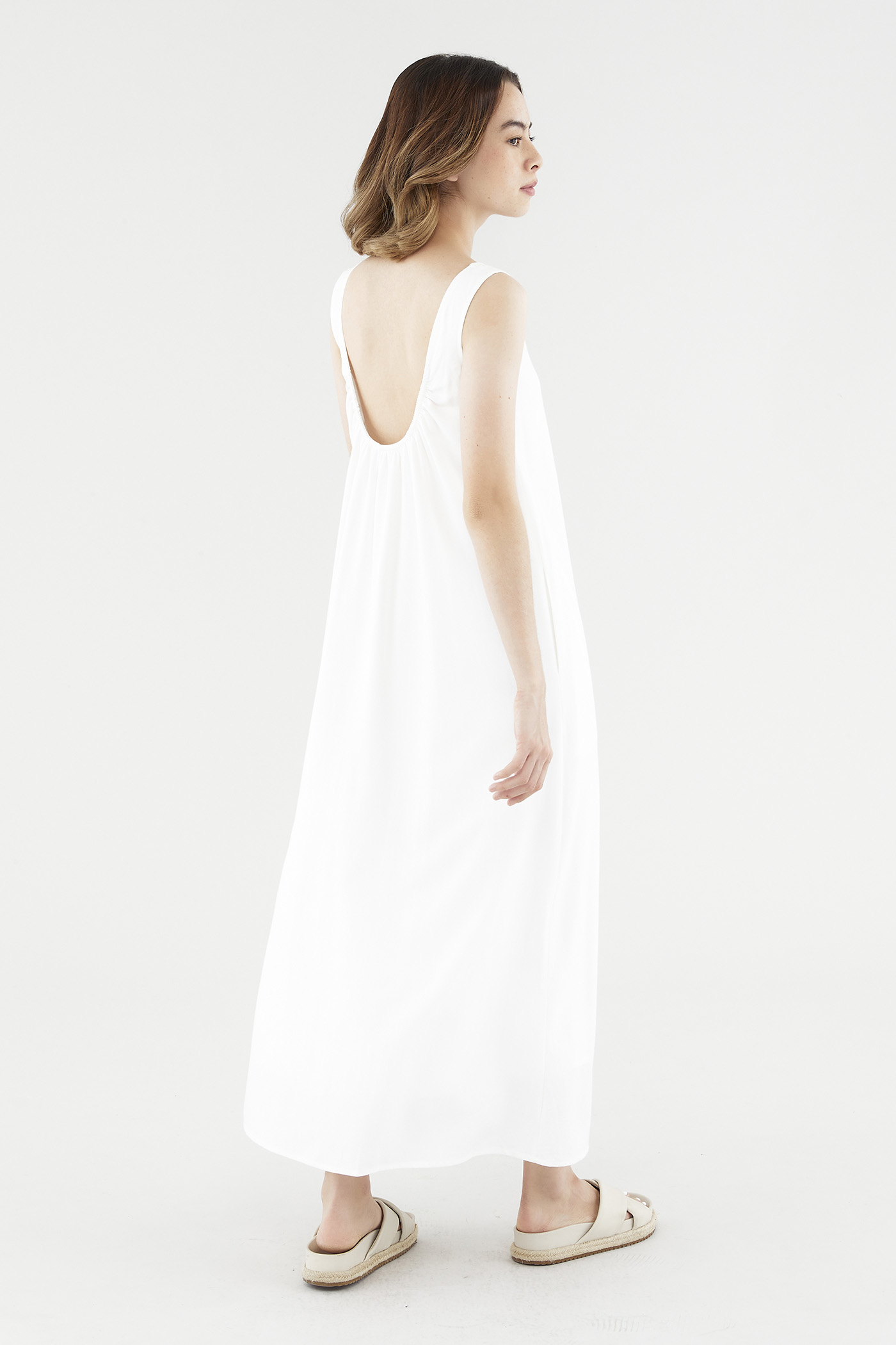 Stay cool, but with a touch of drama. Cut from smooth and fully lined fabric, this flowy maxi dress is designed to drape the silhouette effortlessly in a relaxed, waistless fit. It also flaunts a clean design on the front and an elastic scooped back for a bold finish. A stick-on or backless bra is recommended for this style.