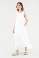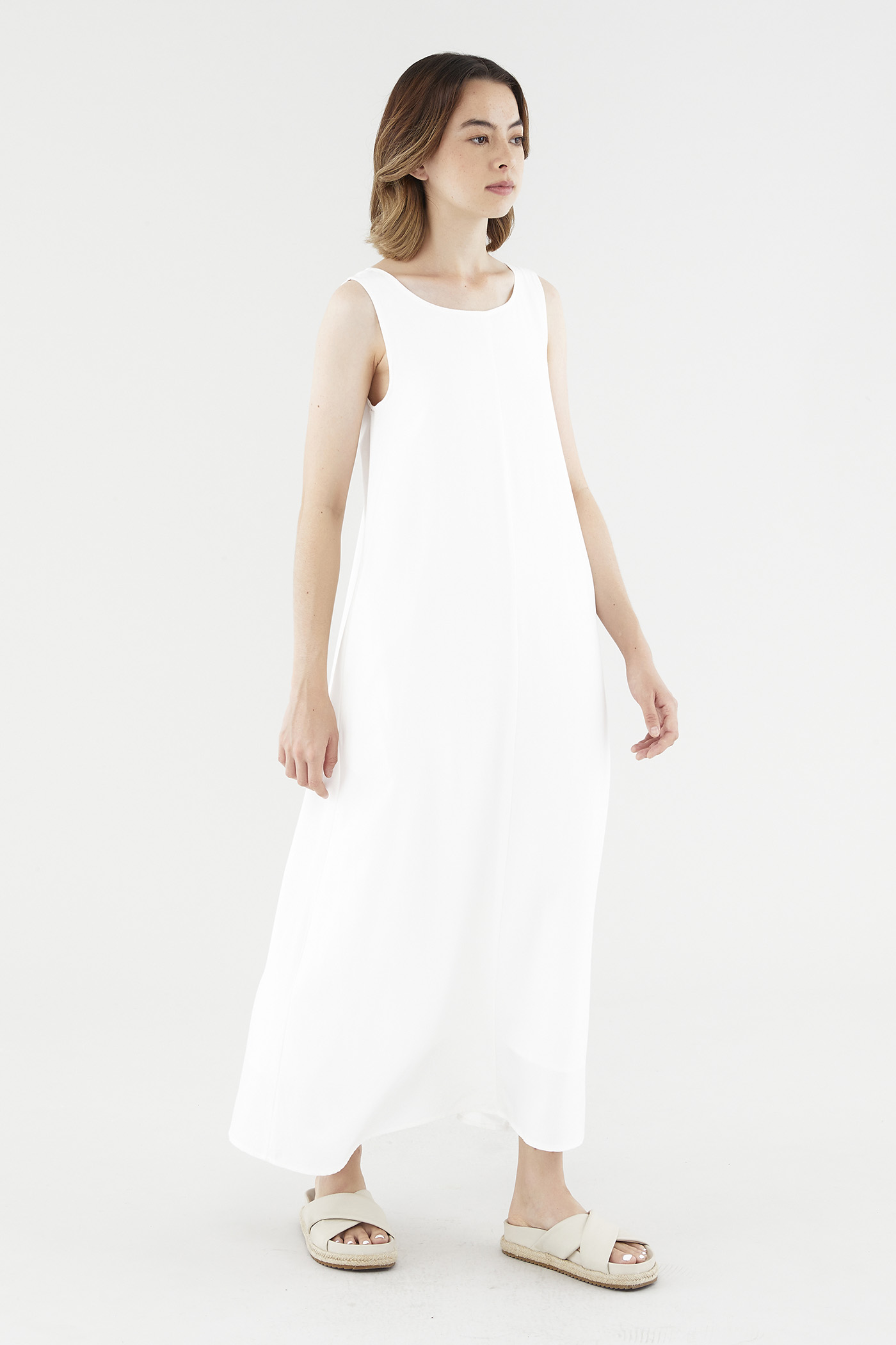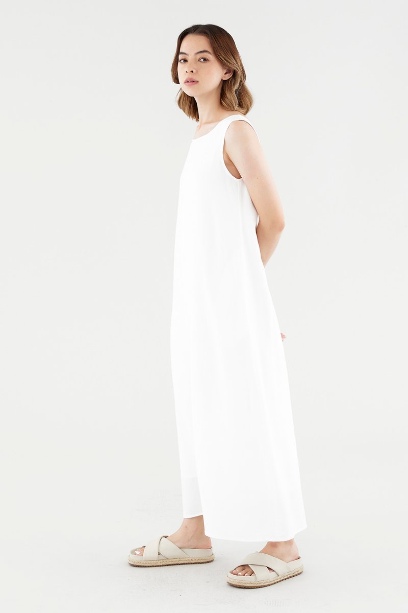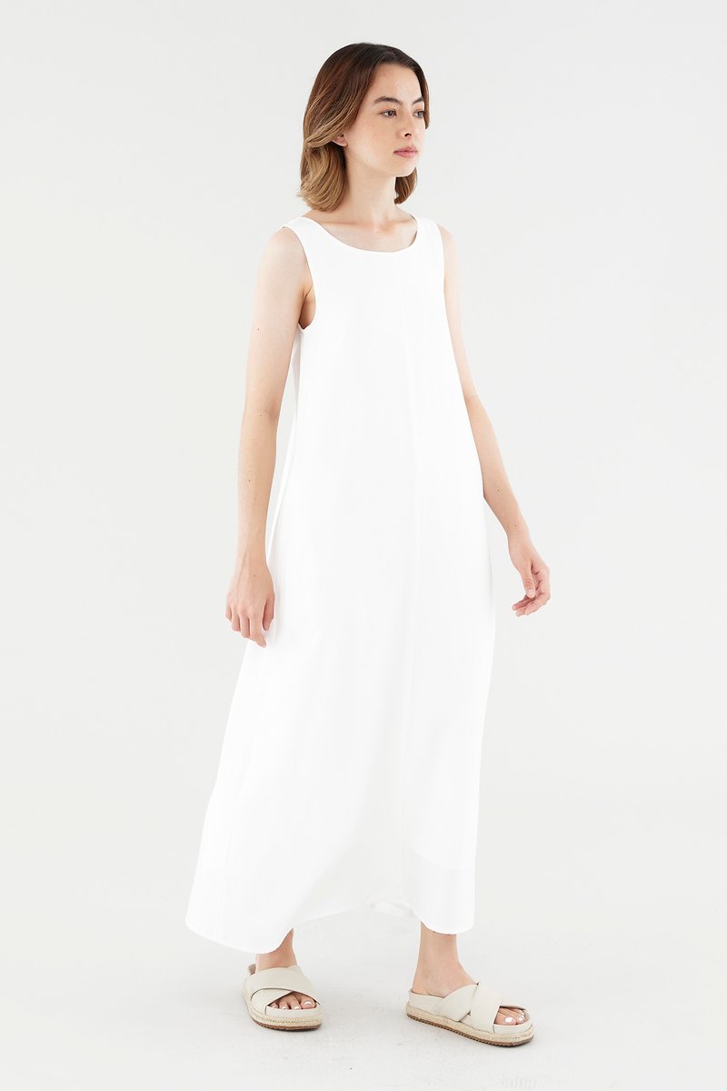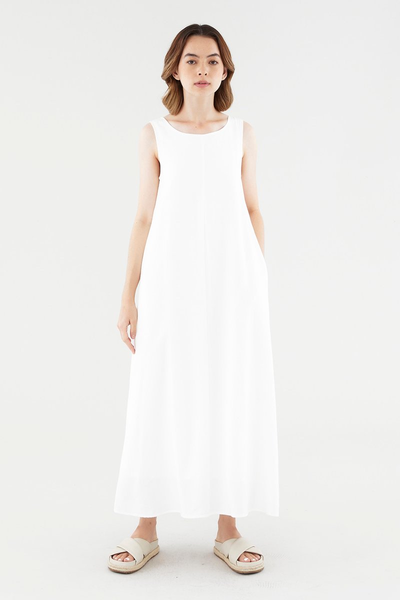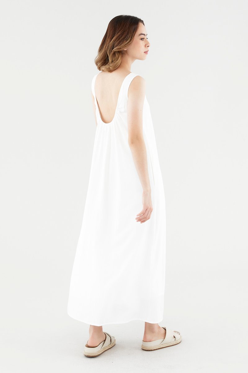 Stay cool, but with a touch of drama. Cut from smooth and fully lined fabric, this flowy maxi dress is designed to drape the silhouette effortlessly in a relaxed, waistless fit. It also flaunts a clean design on the front and an elastic scooped back for a bold finish. A stick-on or backless bra is recommended for this style.