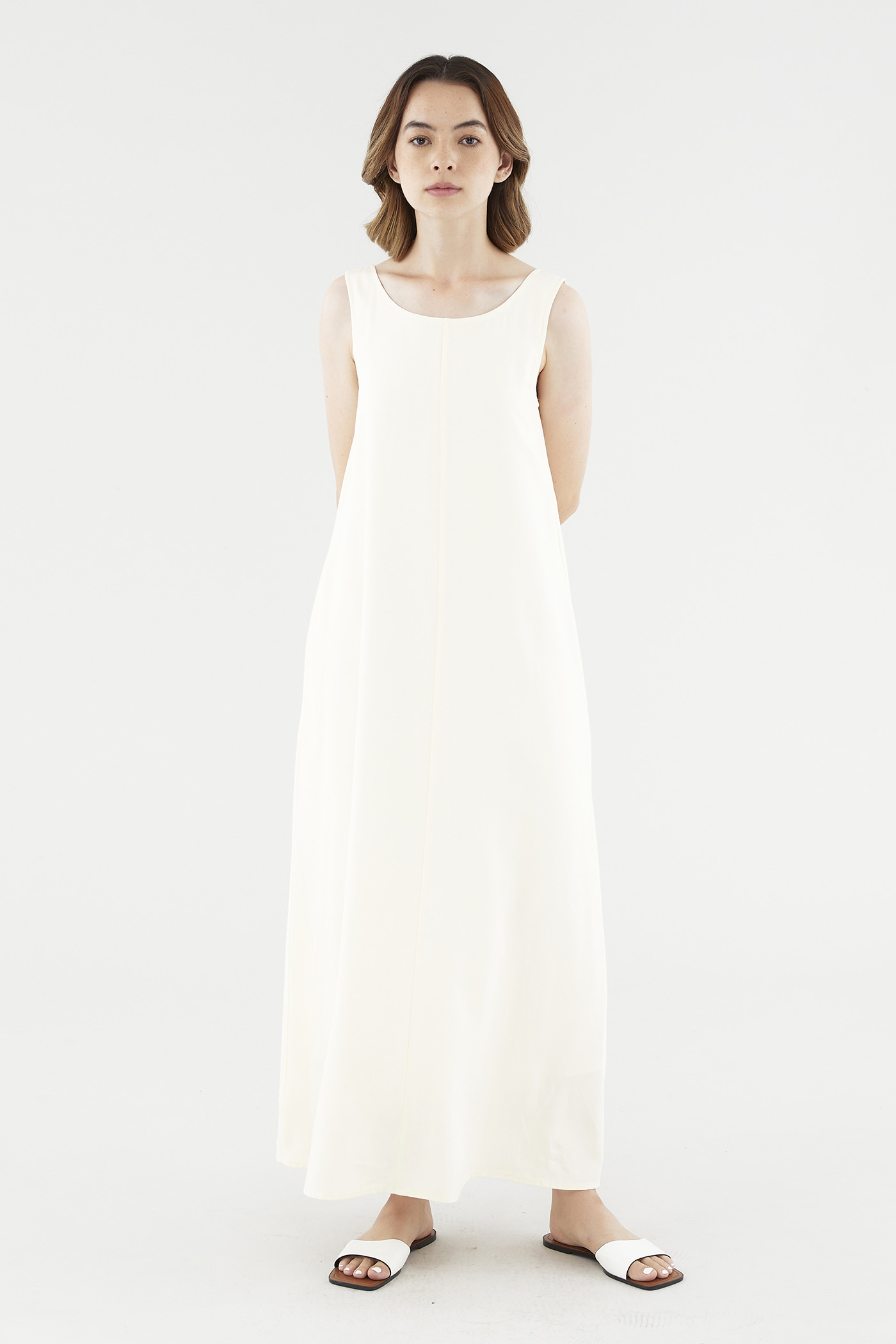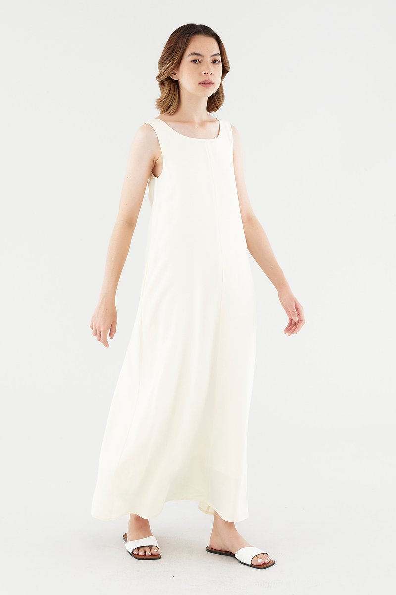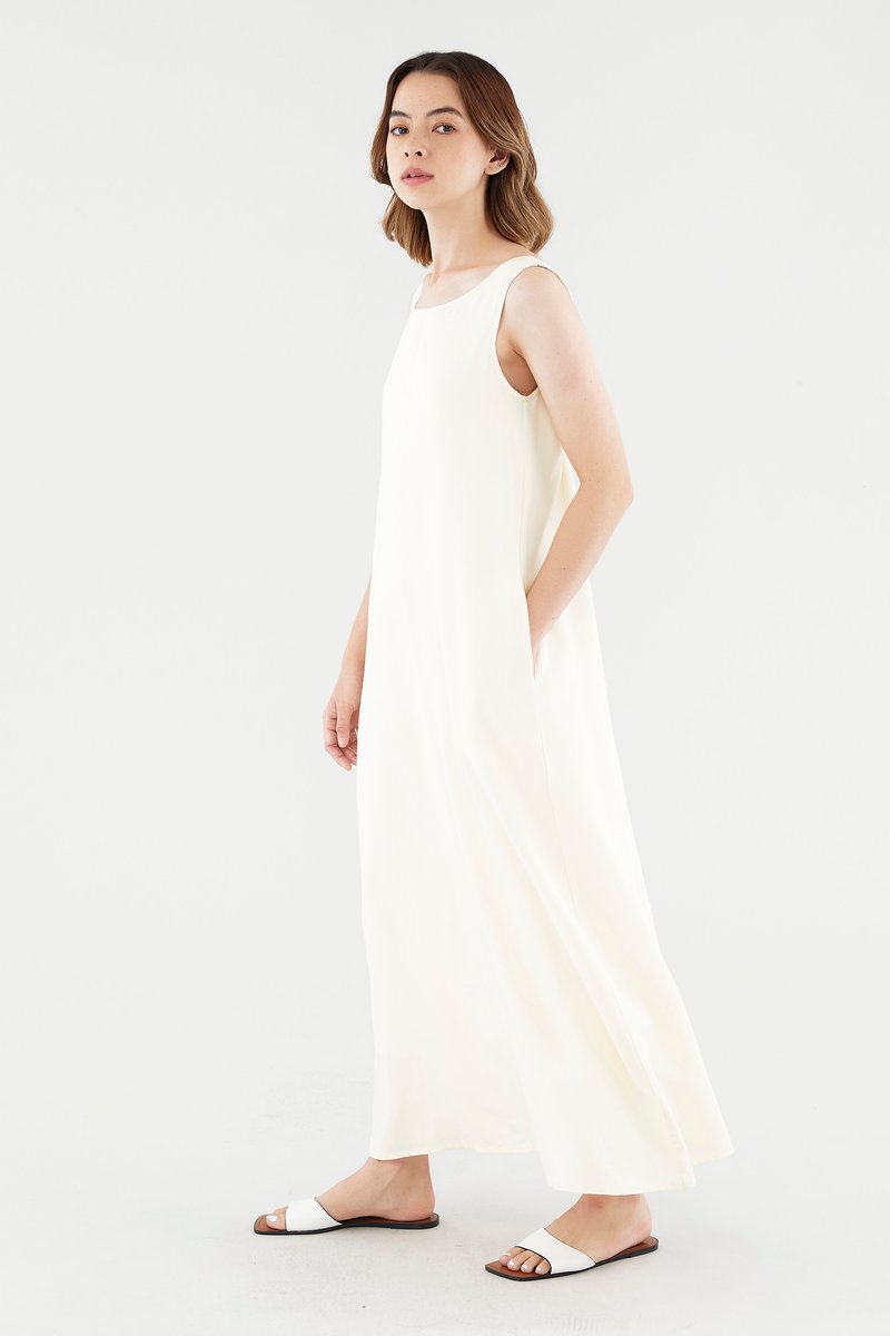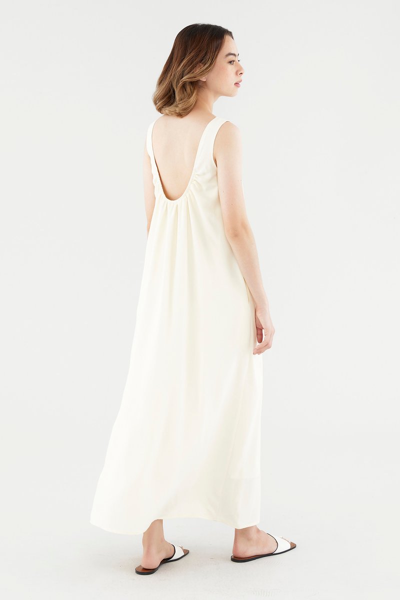 Stay cool, but with a touch of drama. Cut from smooth and fully lined fabric, this flowy maxi dress is designed to drape the silhouette effortlessly in a relaxed, waistless fit. It also flaunts a clean design on the front and an elastic scooped back for a bold finish. A stick-on or backless bra is recommended for this style.