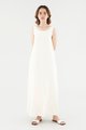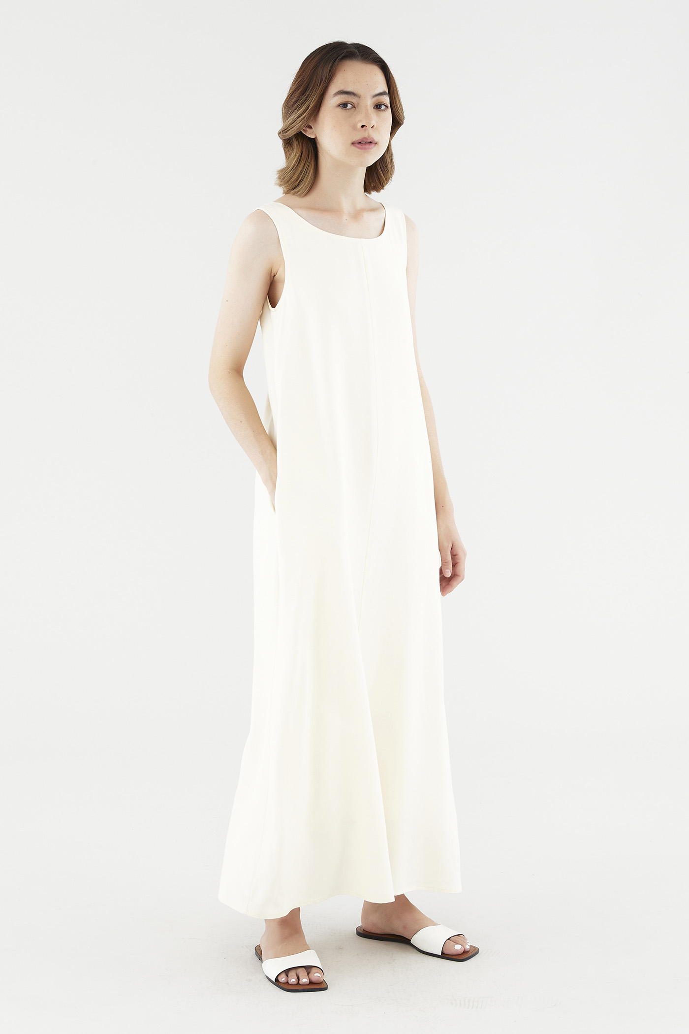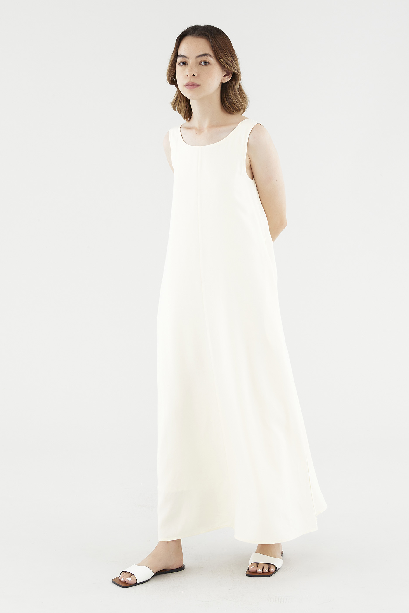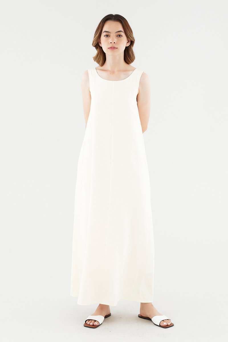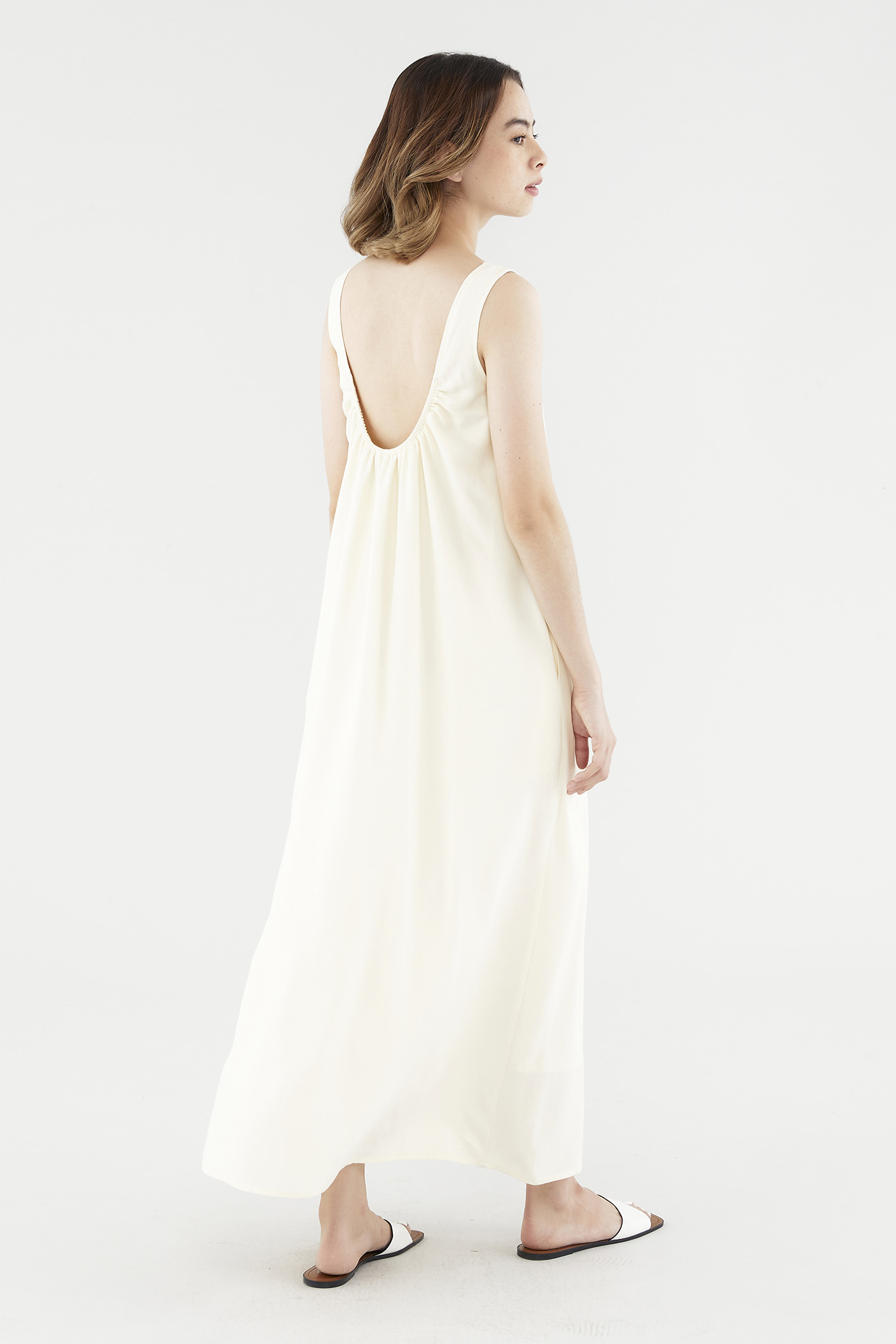 Stay cool, but with a touch of drama. Cut from smooth and fully lined fabric, this flowy maxi dress is designed to drape the silhouette effortlessly in a relaxed, waistless fit. It also flaunts a clean design on the front and an elastic scooped back for a bold finish. A stick-on or backless bra is recommended for this style.