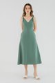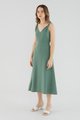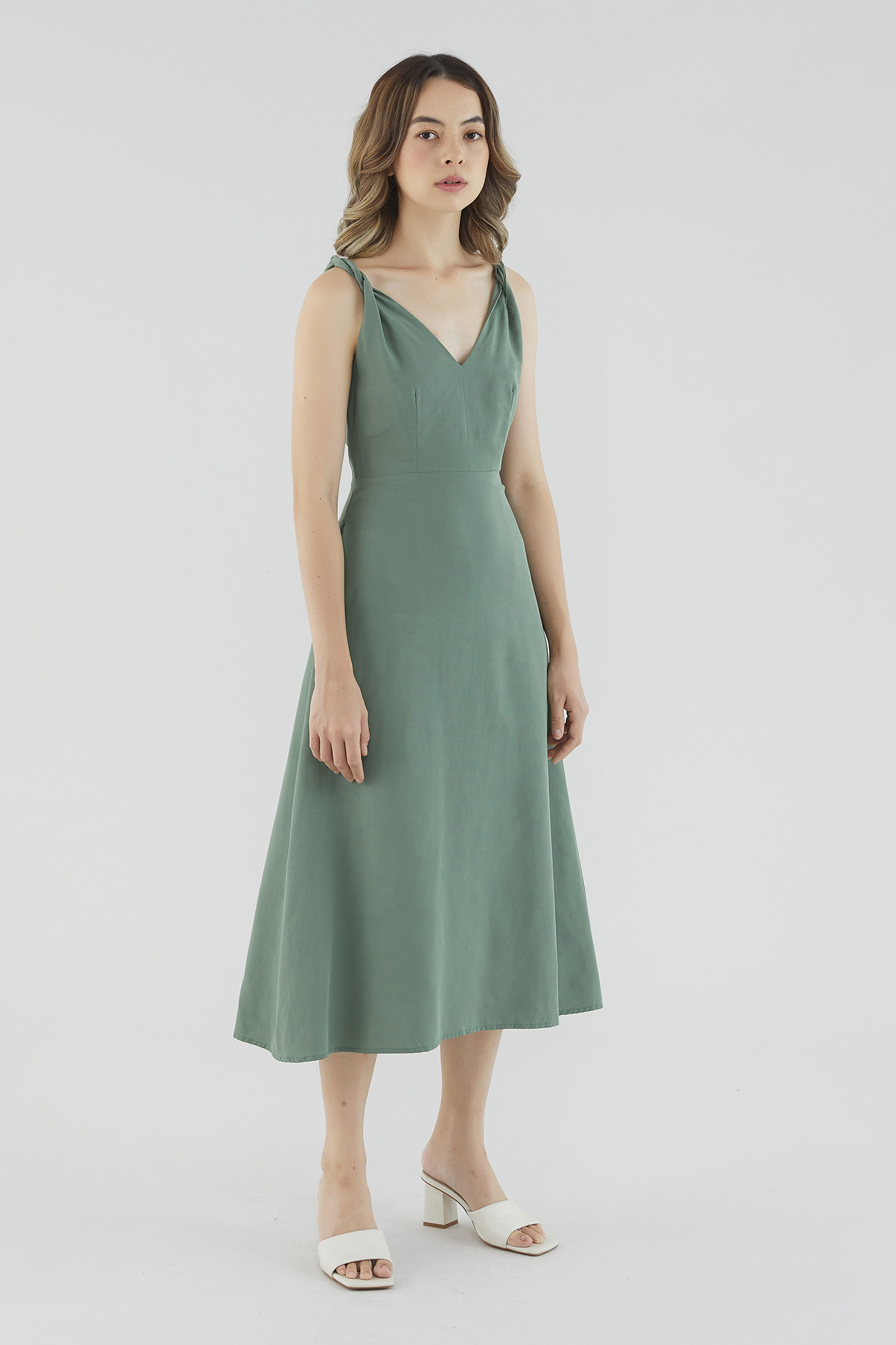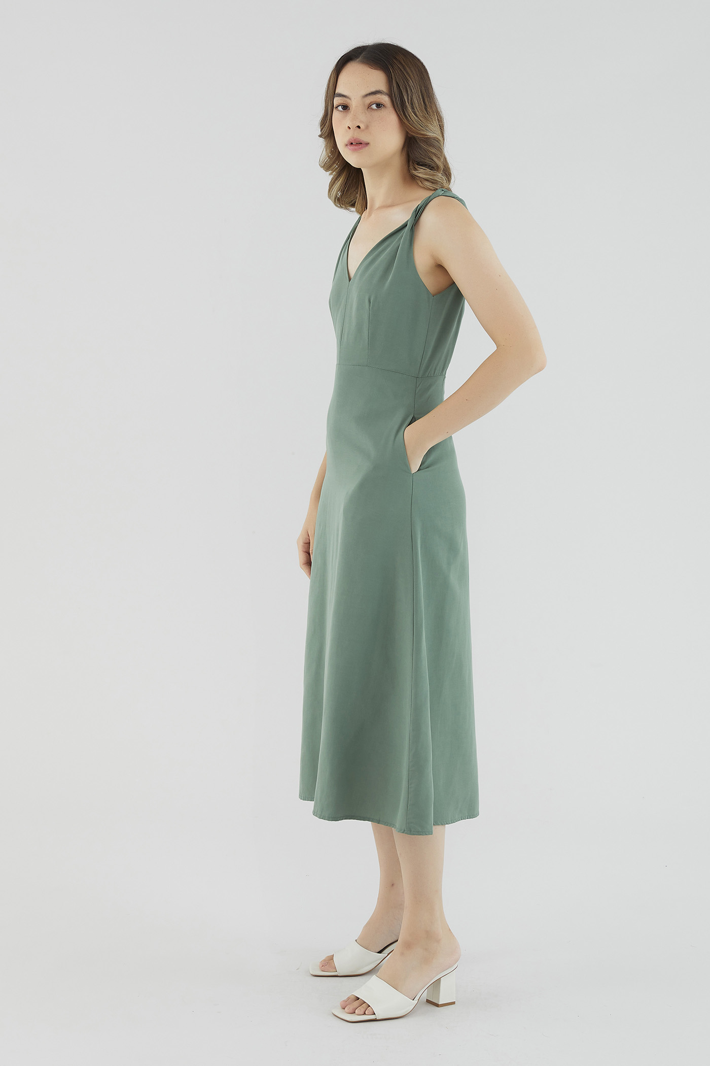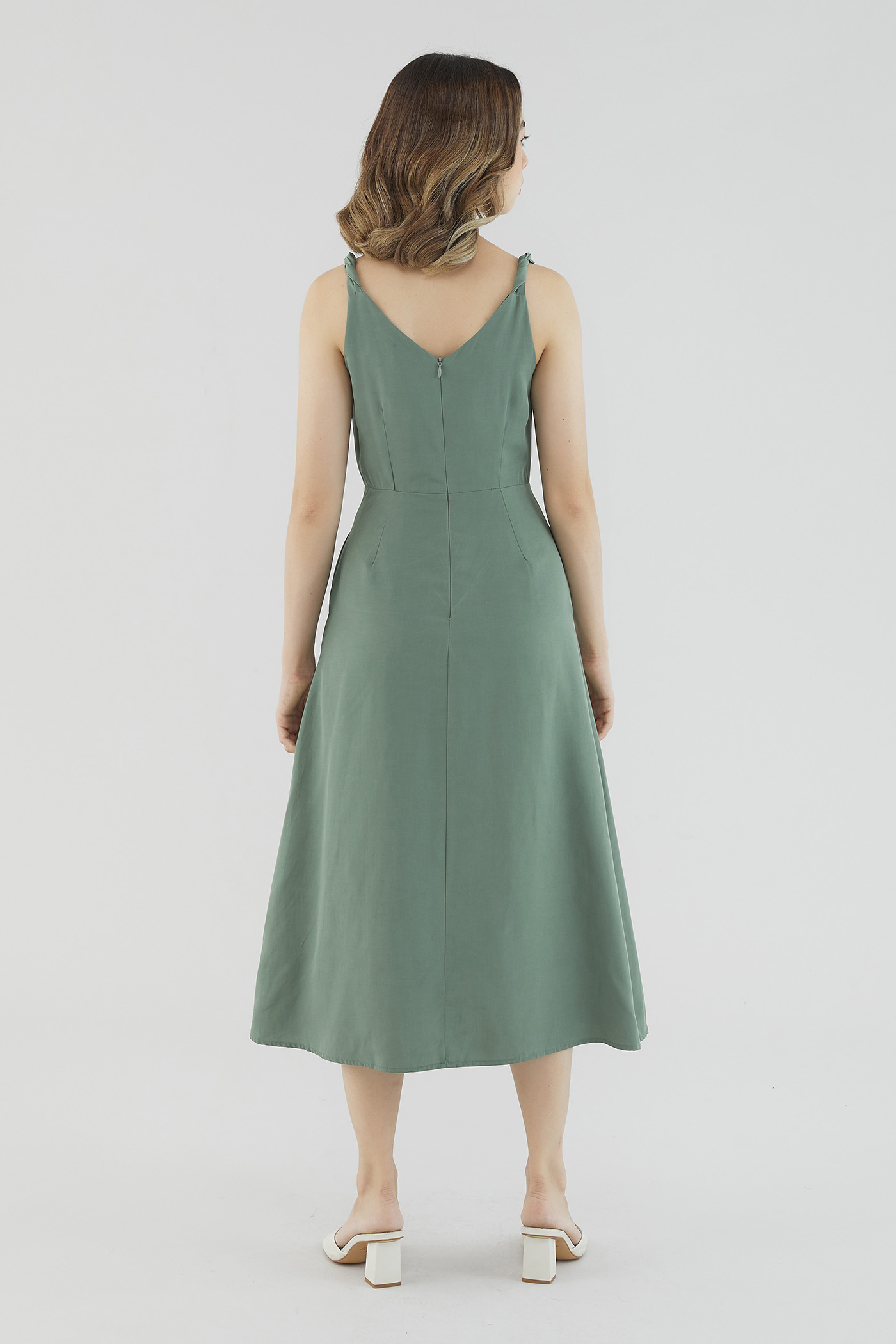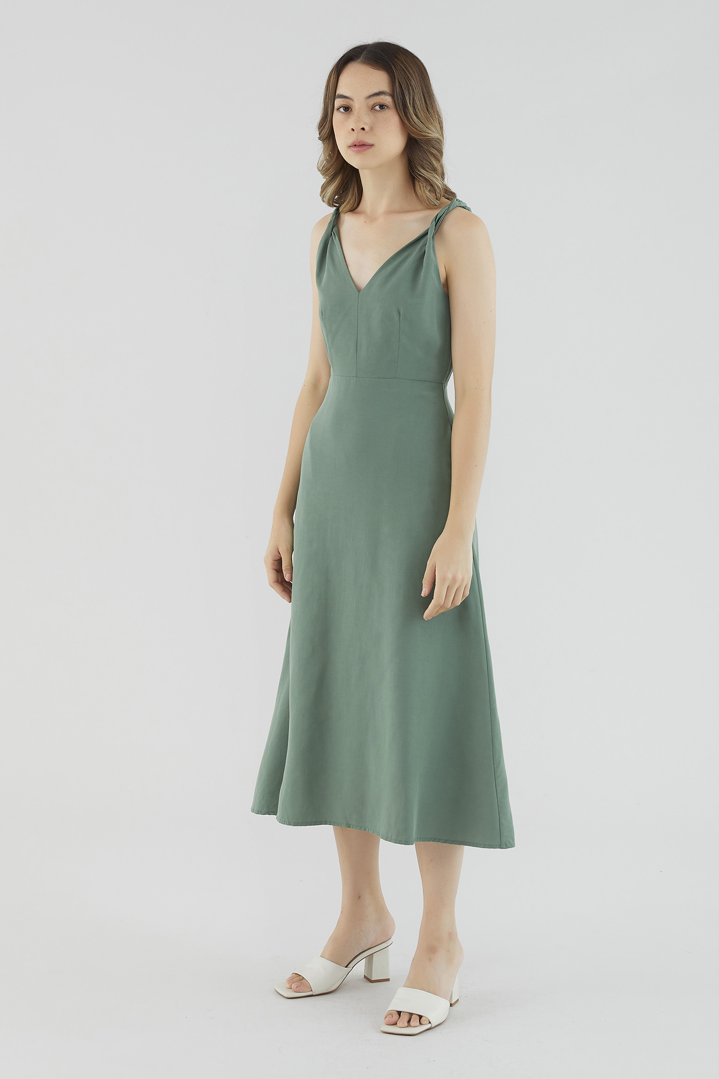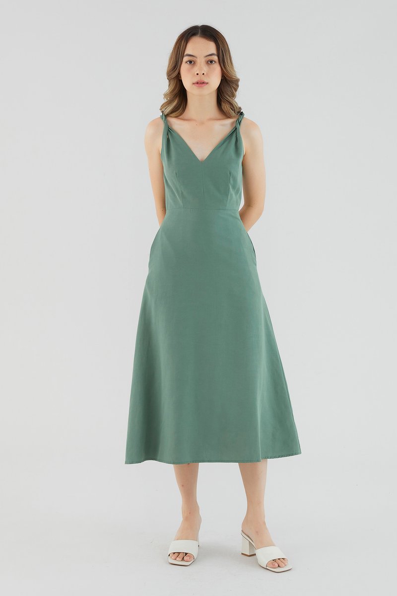 <p><span style="font-weight: 400;">Fabric Composition: 92% Lyocell 8% Linen</span></p> <p><span style="font-weight: 400;">Lining: Full</span></p> <p><span style="font-weight: 400;">Sheerness: Not sheer</span></p> <p><span style="font-weight: 400;">Pockets: Two pockets on the side</span></p> <p><span style="font-weight: 400;">Sleek, with a twist. Cut from smooth and gently tailored fabric, this sleeveless midi dress features non-adjustable twisted shoulder straps, a V-shaped neckline and back, and a fitted waist. Worn in a slim fit with a zip closure at the back. </span></p> <p><span style="font-weight: 400;">Care Instructions: Do not soak / Do not bleach / Handwash or Machine wash on gentle mode / Do not machine dry / Iron using low heat</span></p> <p><i><span style="font-weight: 400;">This piece is made from a combination of our Wear Better fabrics, linen and lyocell. Both are fully biodegradable, durable and derived from production processes that consume and generate significantly less resources and waste respectively — meaning your clothes have a longer, less environmentally damaging life cycle.</span></i></p>