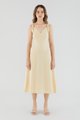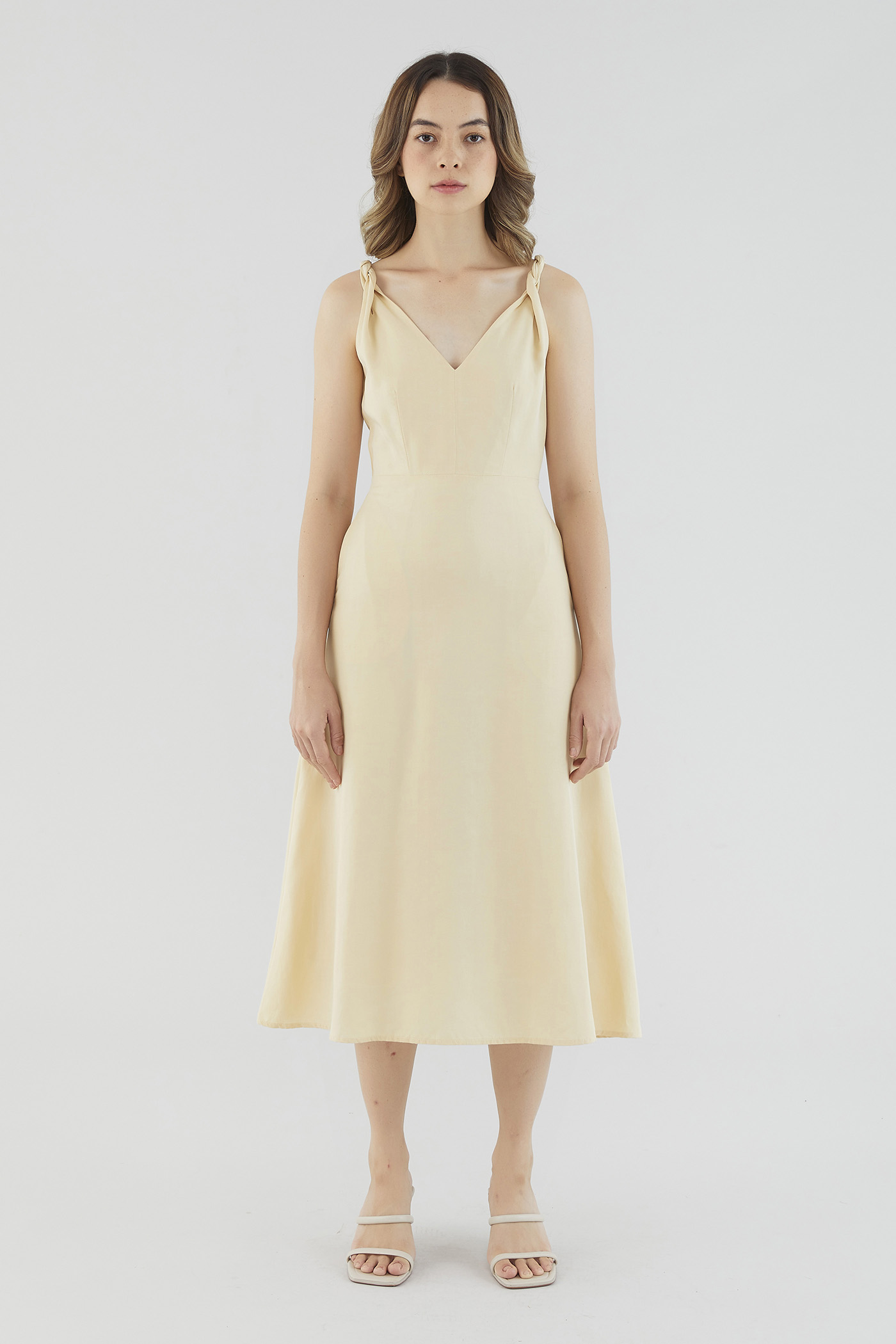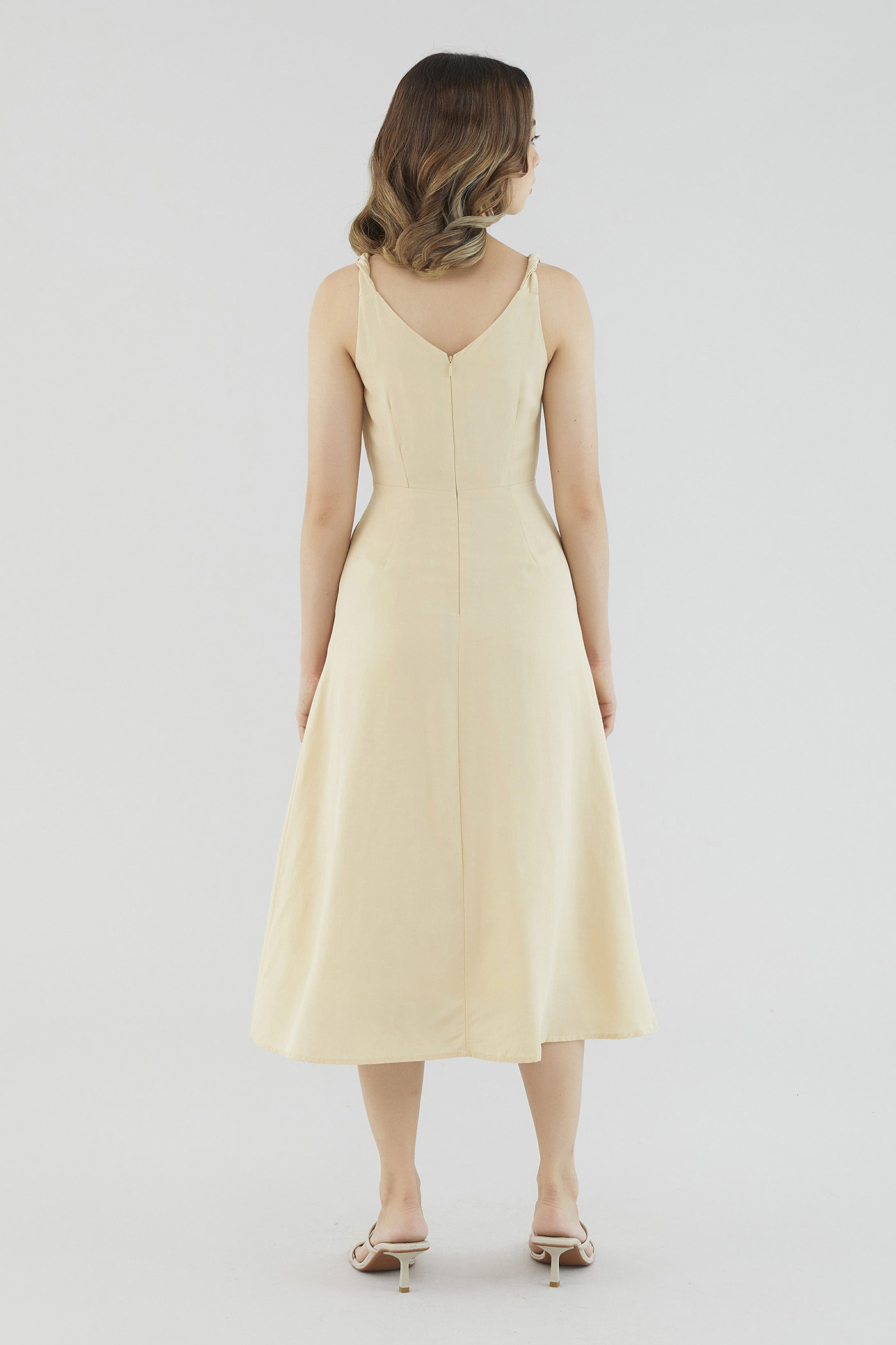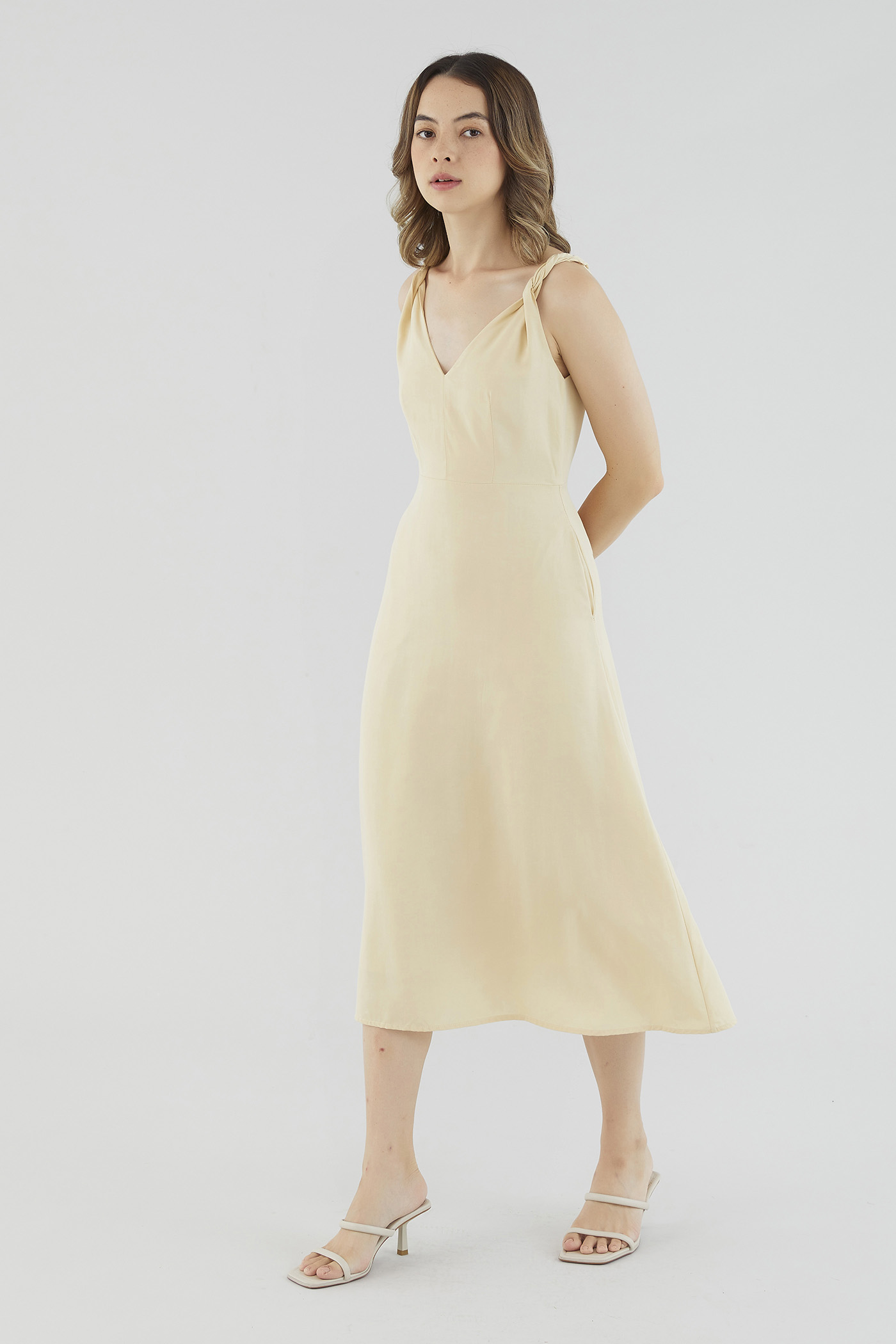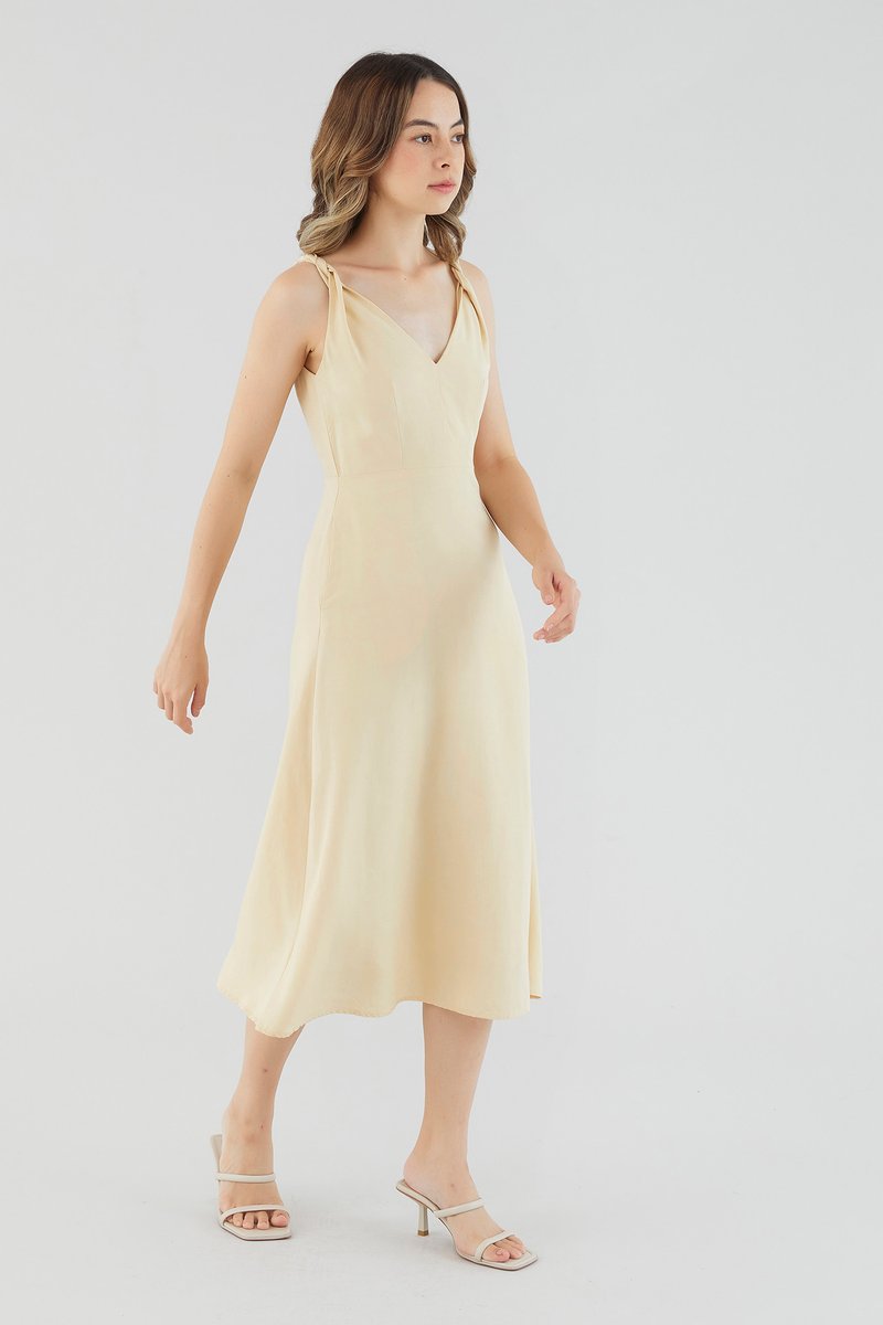 <p><span style="font-weight: 400;">Fabric Composition: 92% Lyocell 8% Linen</span></p> <p><span style="font-weight: 400;">Lining: Full</span></p> <p><span style="font-weight: 400;">Sheerness: Not sheer</span></p> <p><span style="font-weight: 400;">Pockets: Two pockets on the side</span></p> <p><span style="font-weight: 400;">Sleek, with a twist. Cut from smooth and gently tailored fabric, this sleeveless midi dress features non-adjustable twisted shoulder straps, a V-shaped neckline and back, and a fitted waist. Worn in a slim fit with a zip closure at the back. </span></p> <p><span style="font-weight: 400;">Care Instructions: Do not soak / Do not bleach / Handwash or Machine wash on gentle mode / Do not machine dry / Iron using low heat</span></p> <p><i><span style="font-weight: 400;">This piece is made from a combination of our Wear Better fabrics, linen and lyocell. Both are fully biodegradable, durable and derived from production processes that consume and generate significantly less resources and waste respectively — meaning your clothes have a longer, less environmentally damaging life cycle.</span></i></p>
