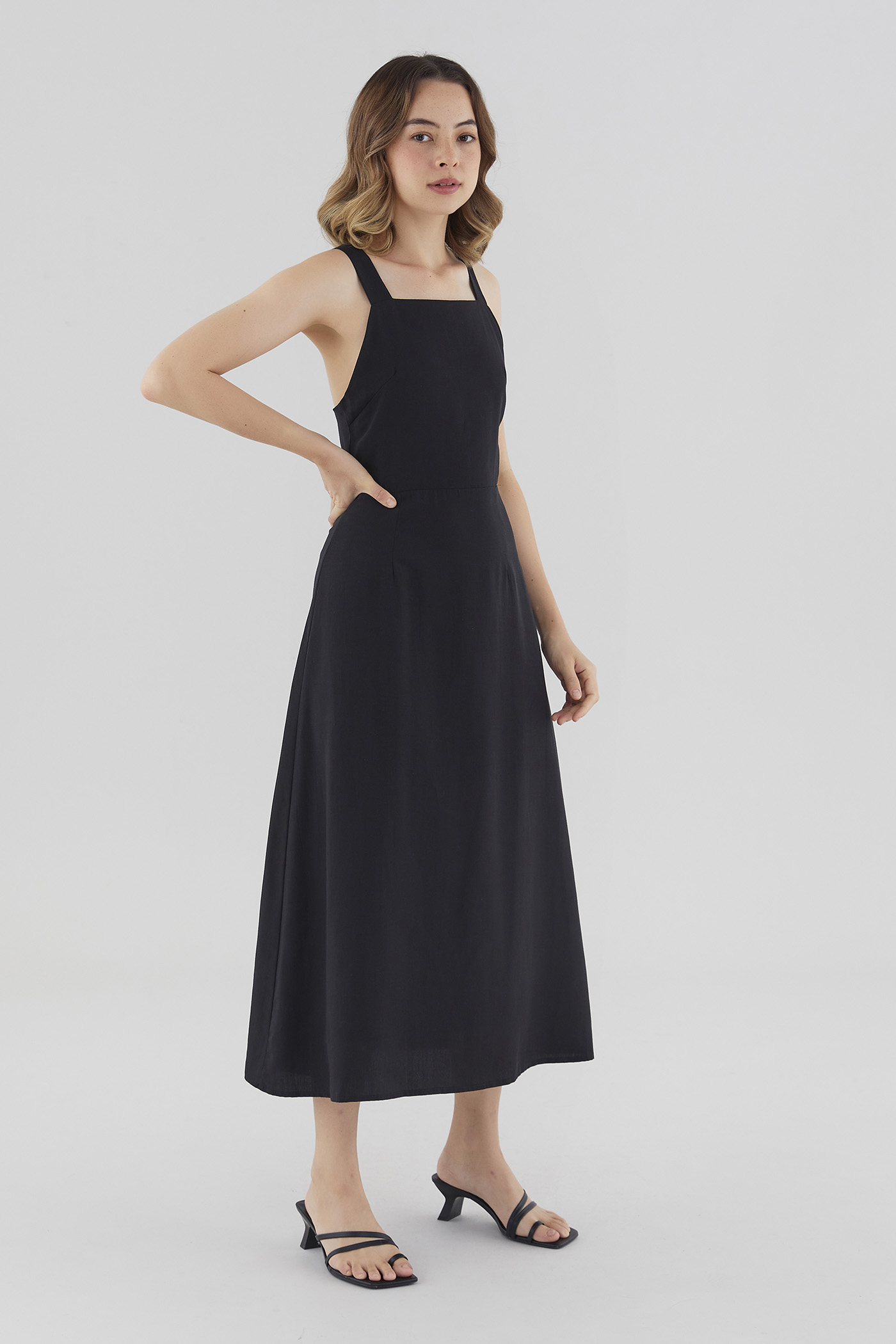 Strappy elegance. Made from soft and flowy fabric, this sleeveless maxi dress features a square neckline, a back zip closure and wide non-adjustable straps that cross over at the back. Fits slimmer through the waist before flowing out in a relaxed skirt.