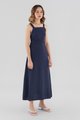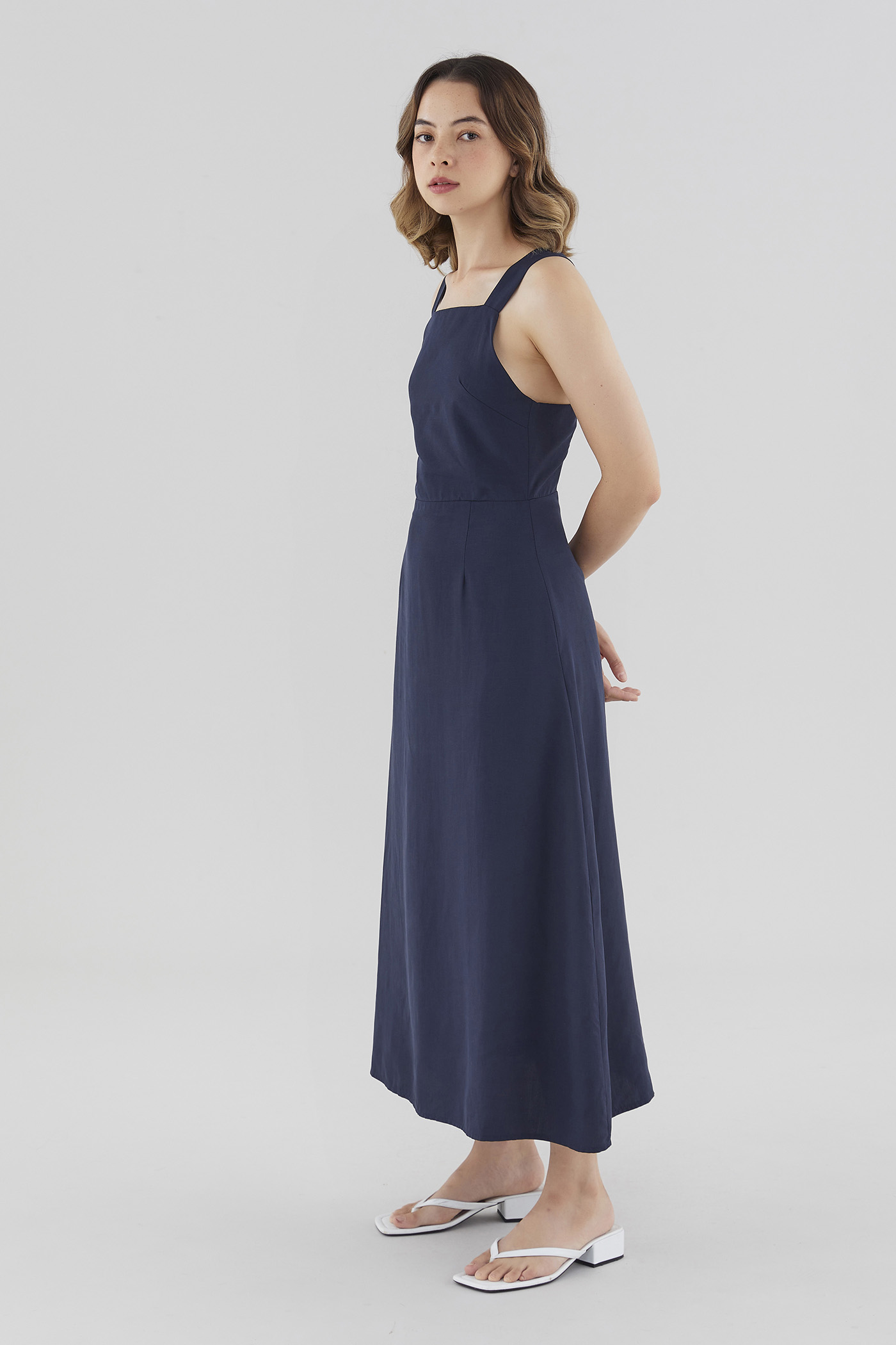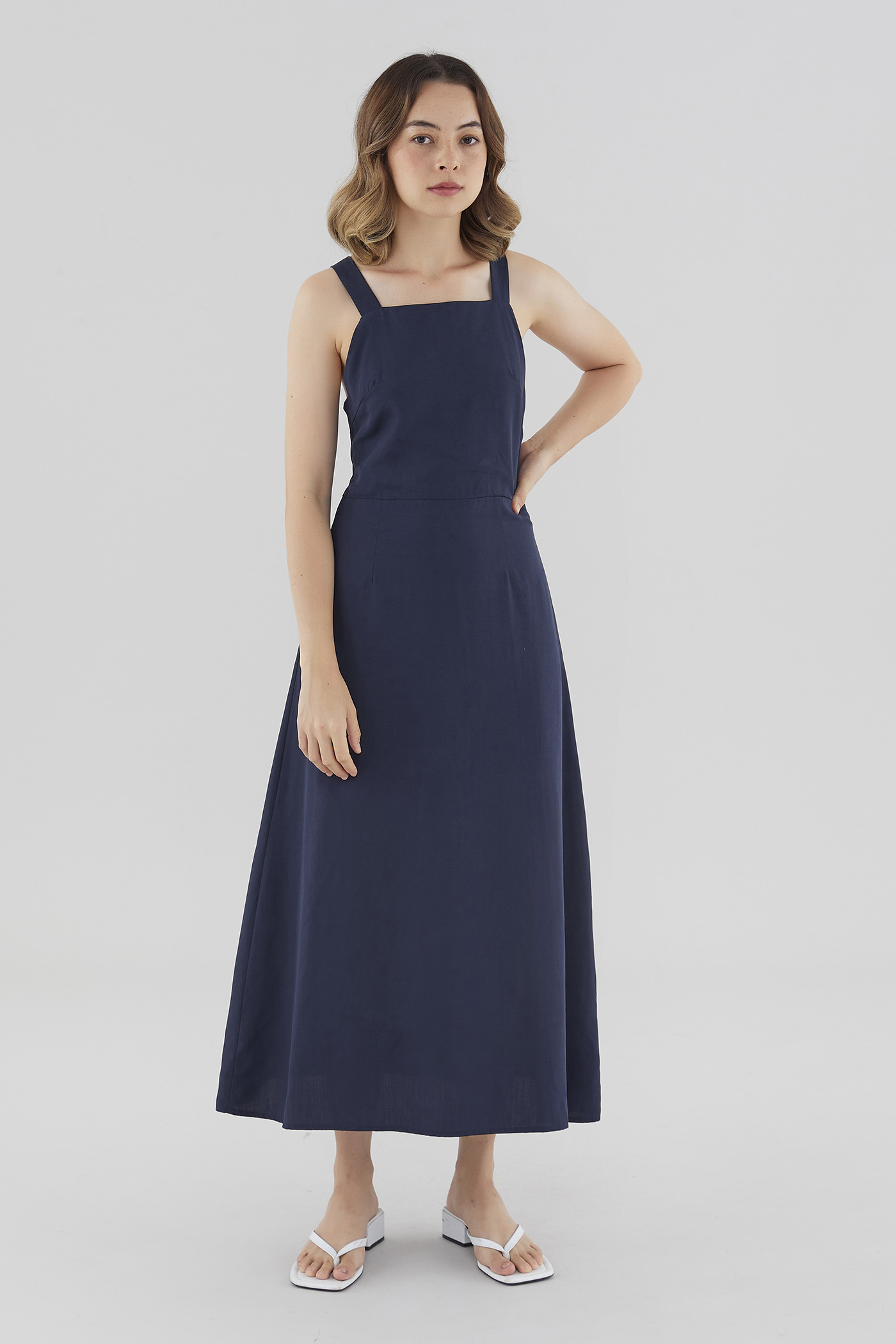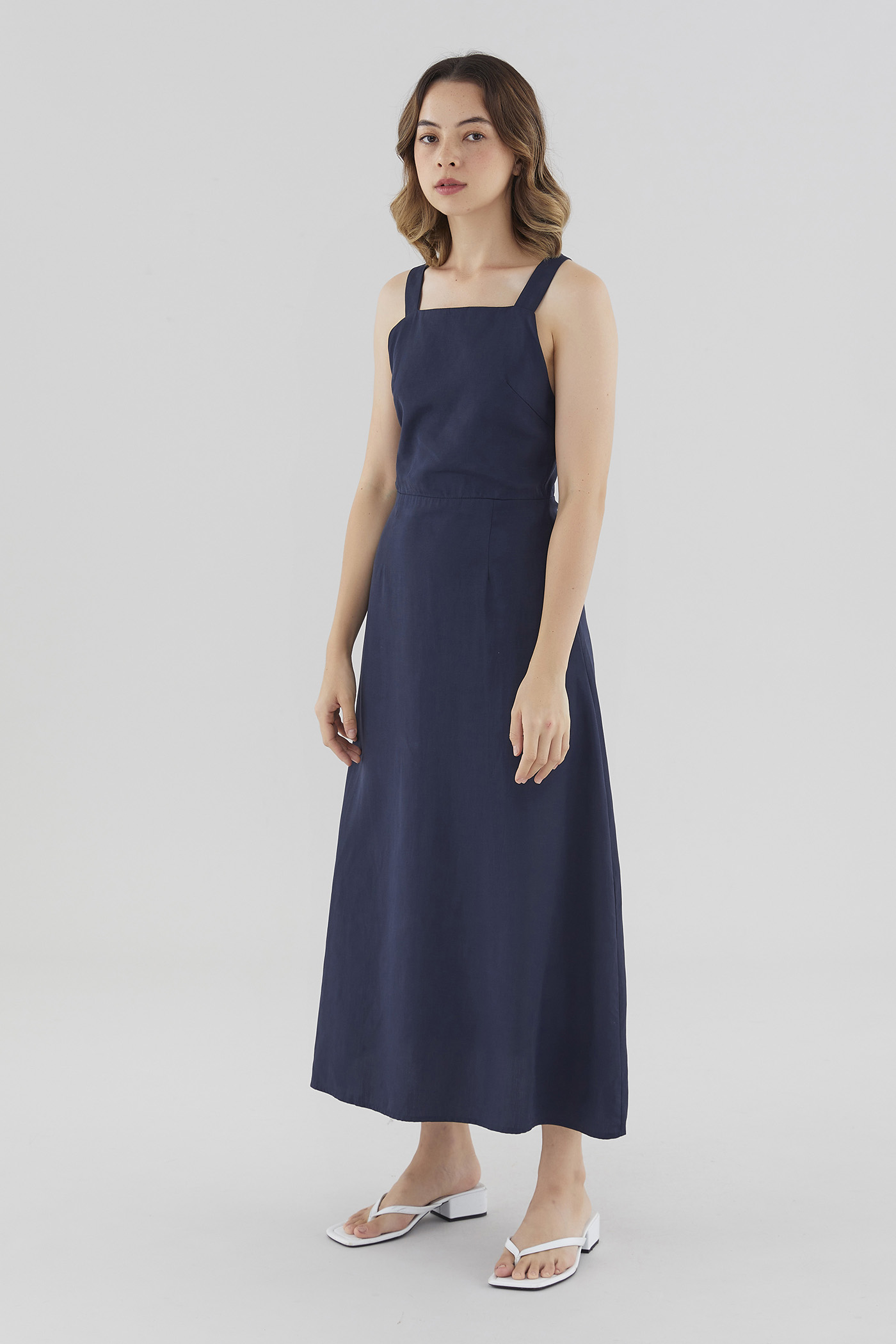 Strappy elegance. Made from soft and flowy fabric, this sleeveless maxi dress features a square neckline, a back zip closure and wide non-adjustable straps that cross over at the back. Fits slimmer through the waist before flowing out in a relaxed skirt.