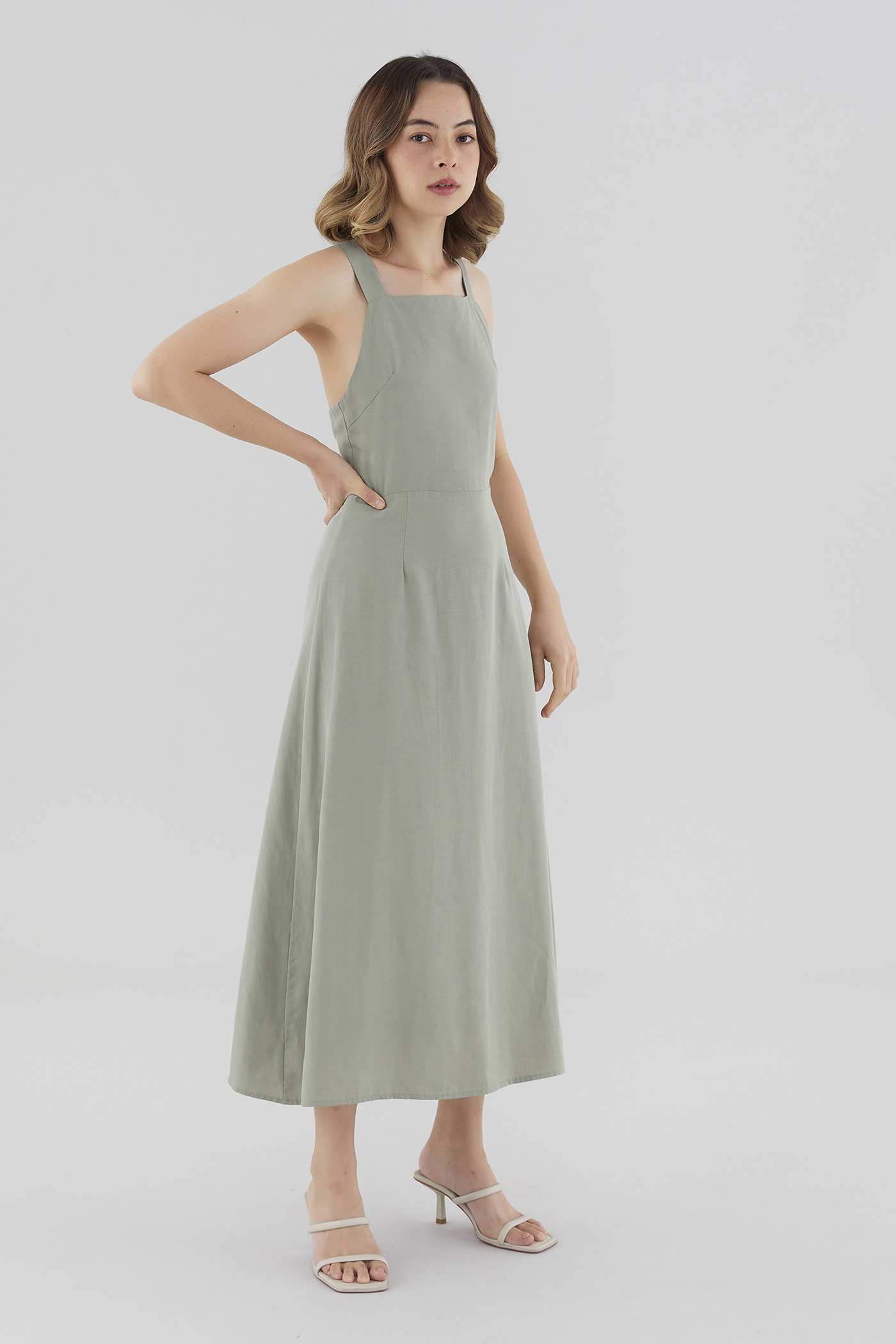 Strappy elegance. Made from soft and flowy fabric, this sleeveless maxi dress features a square neckline, a back zip closure and wide non-adjustable straps that cross over at the back. Fits slimmer through the waist before flowing out in a relaxed skirt.