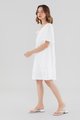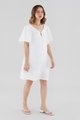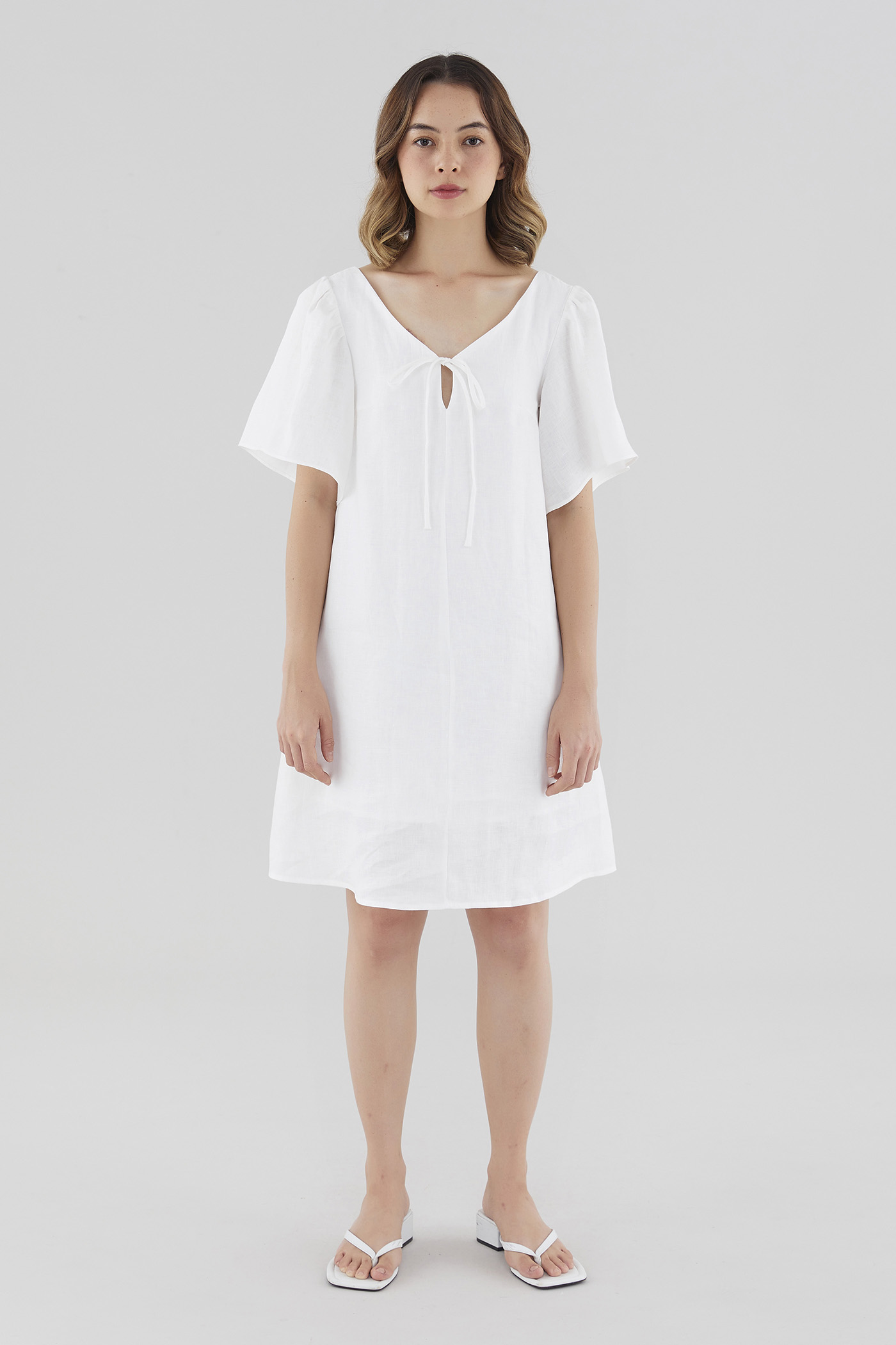 Easy does it. Made from airy and lightweight 100% linen, this knee-length dress features flowy short sleeves, a V-shaped neckline and back, a tie-strap closure on the front and a side zip closure. Fits relaxed in a shift silhouette.