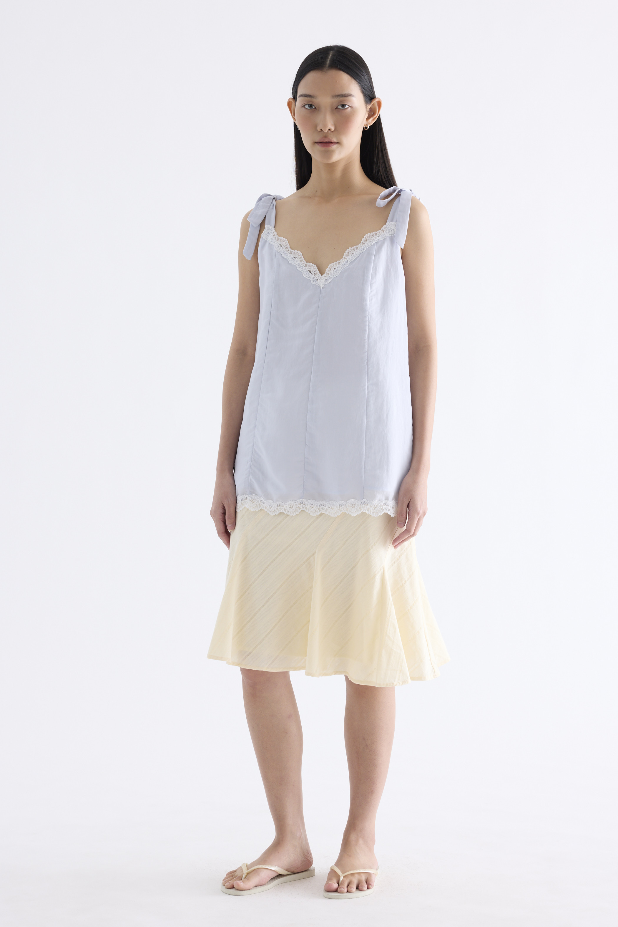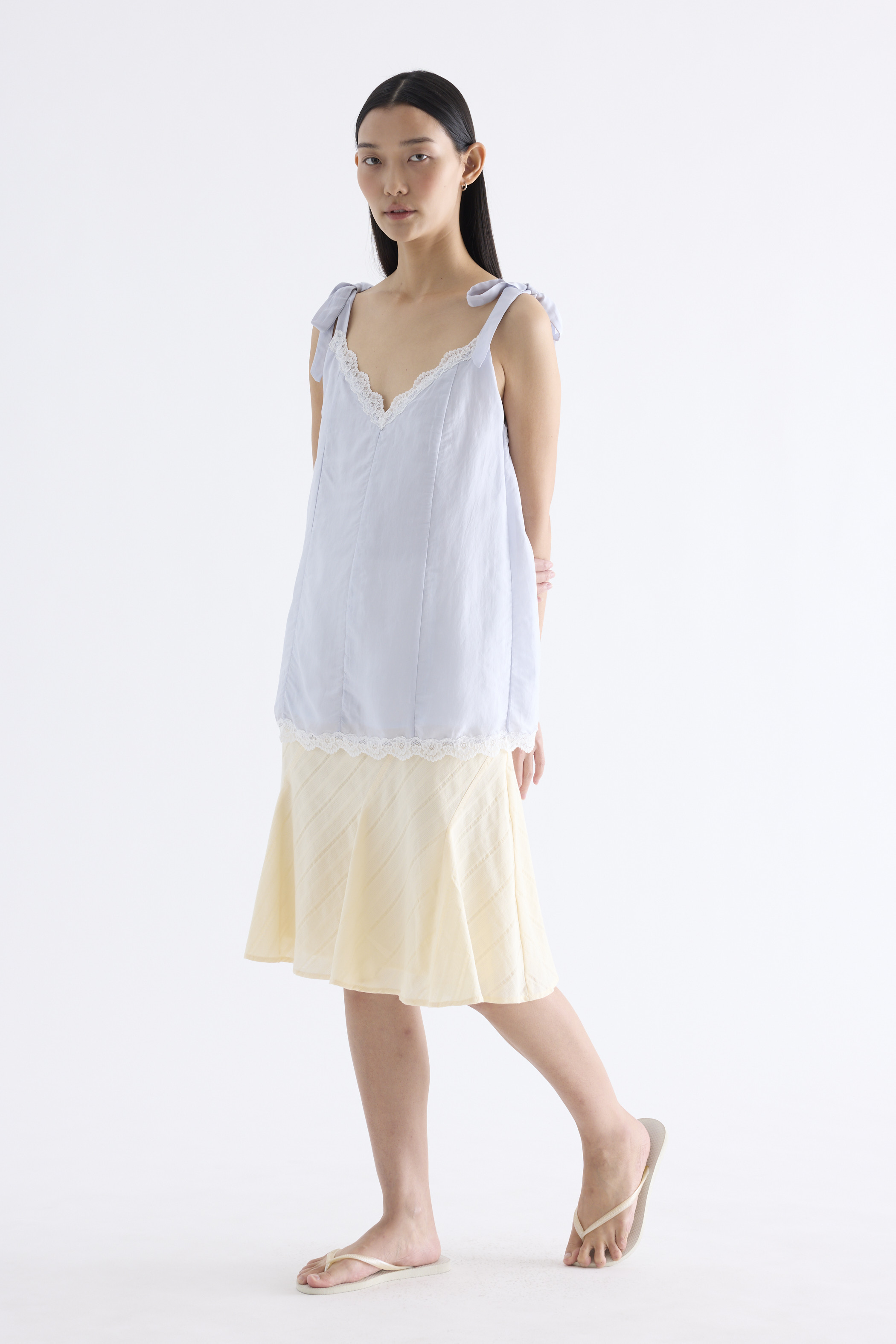 Go to new lengths. Made from light fabric with a soft sheen, this longline slip top features a lace-trimmed V-neckline, self-tying shoulder straps and a panelled construction. Worn in a relaxed fit.