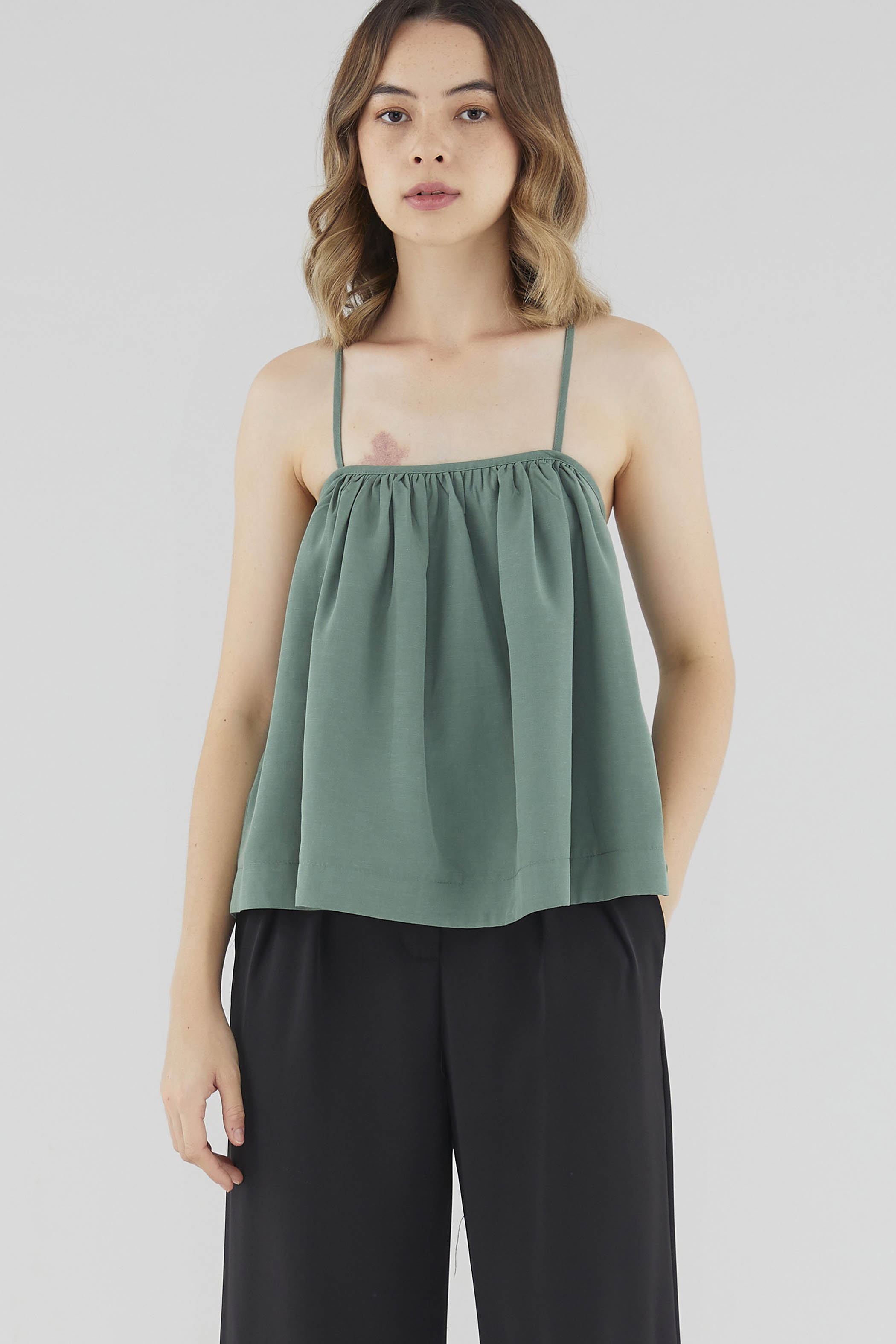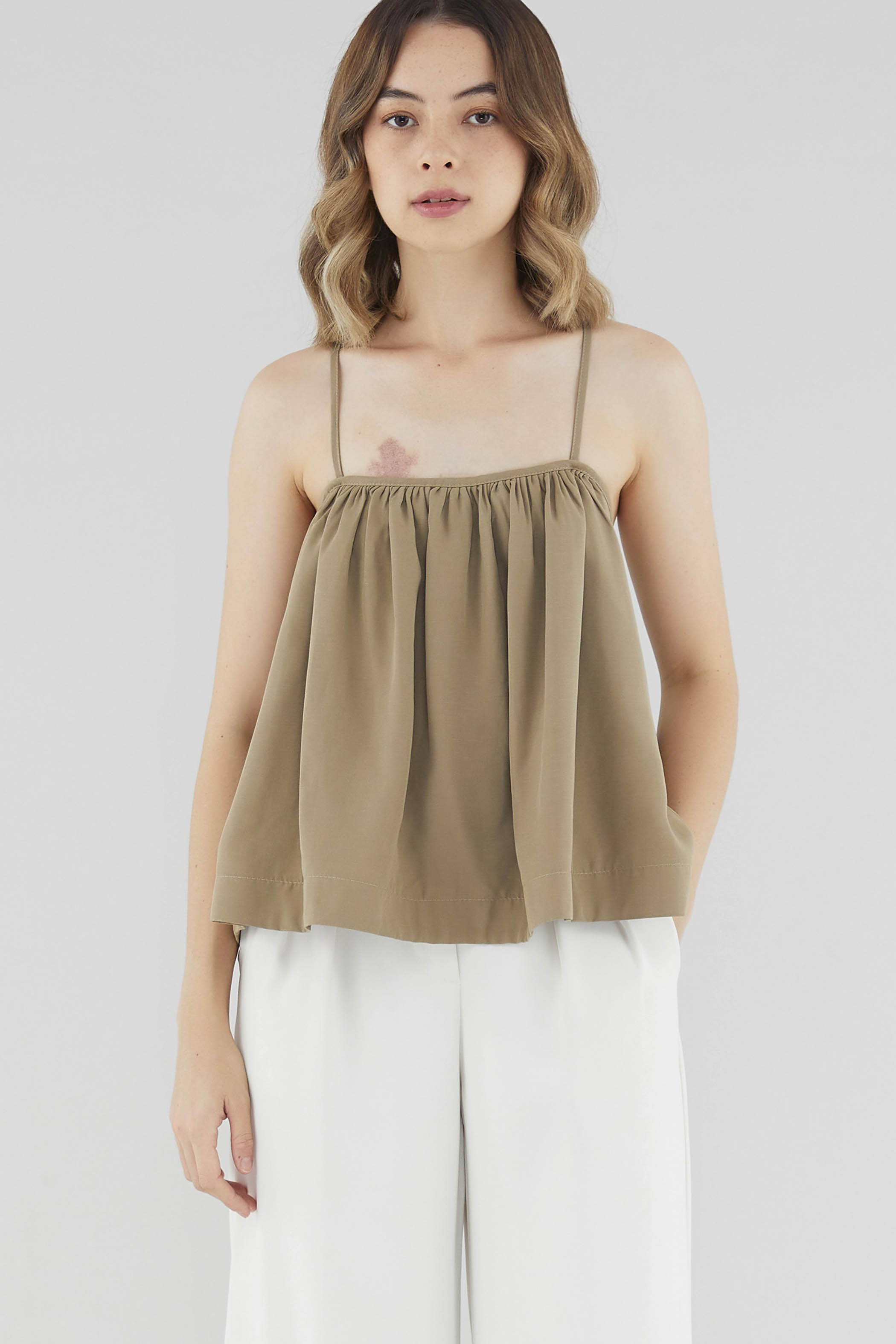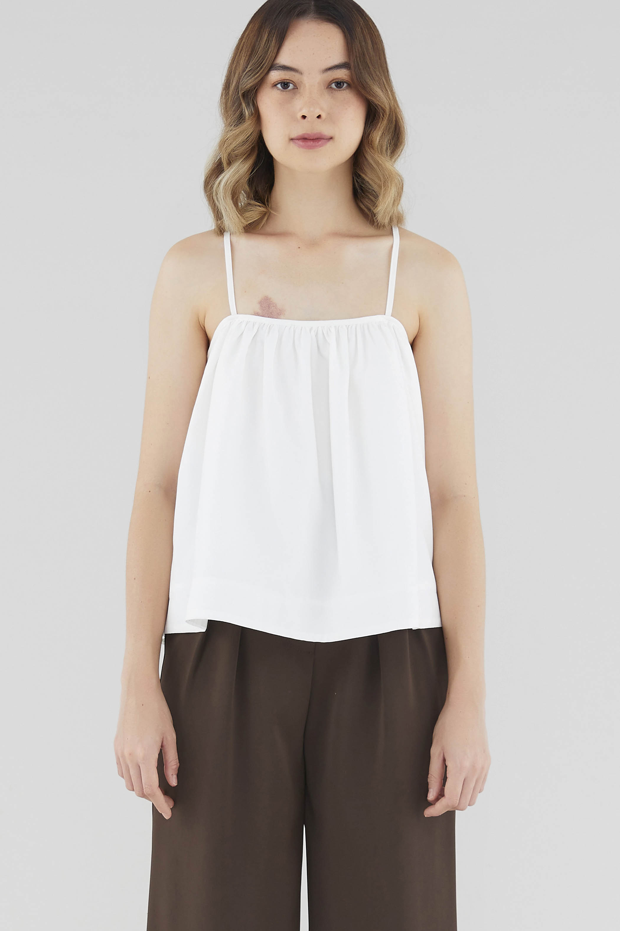 Versatile volume. Made from non-stretch fabric with a structured drape, this sleeveless top features a gathered straight neckline, slim non-adjustable straps that cross over at the back and a side zip closure. Fits relaxed in a flattering tent silhouette.