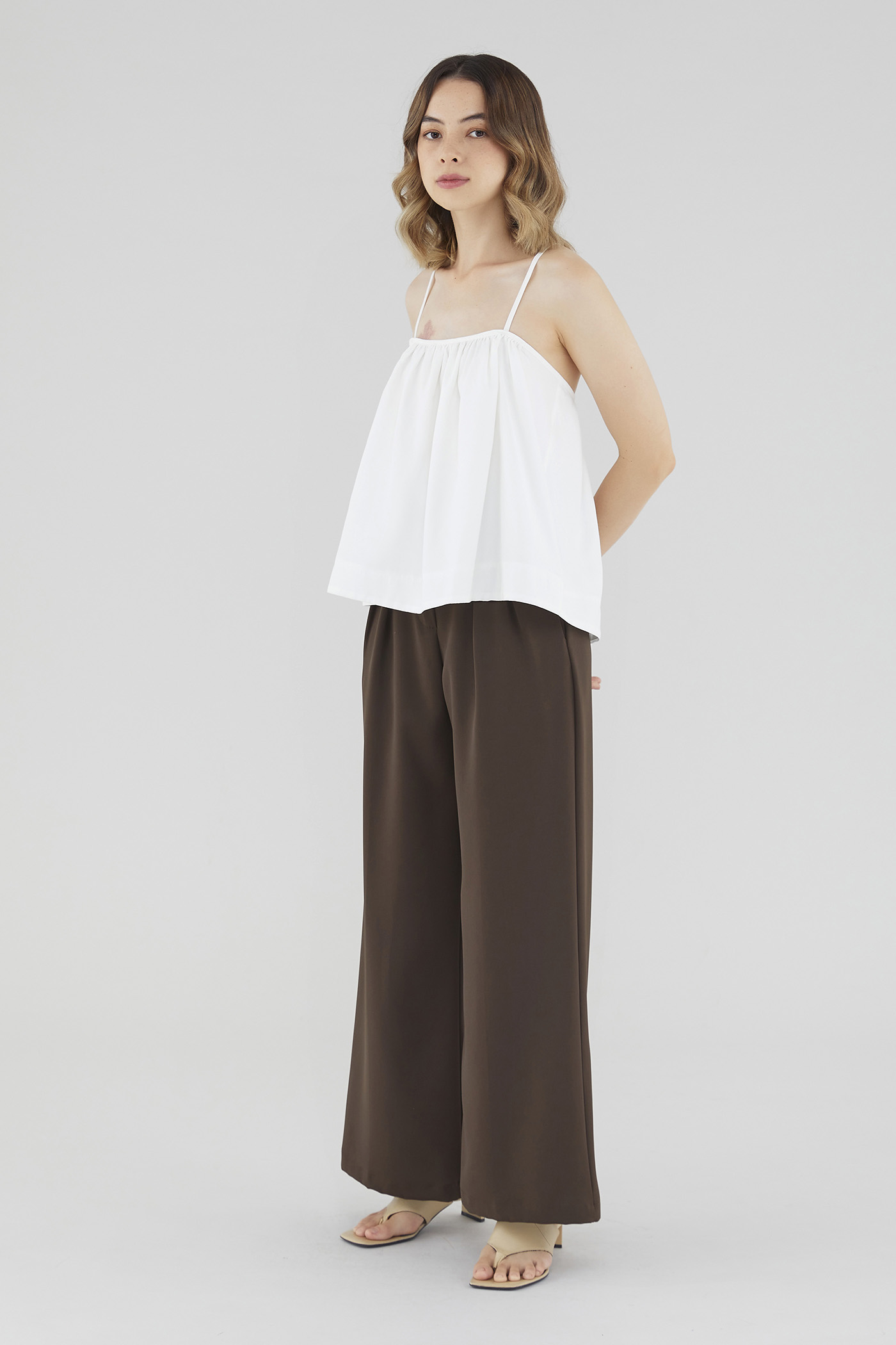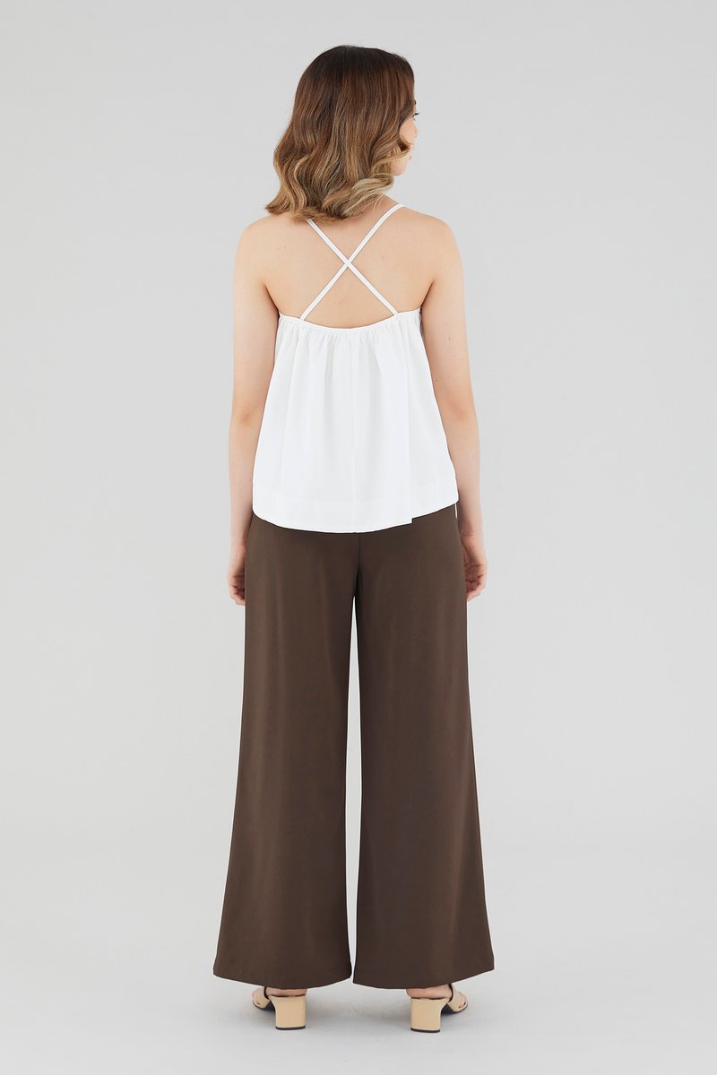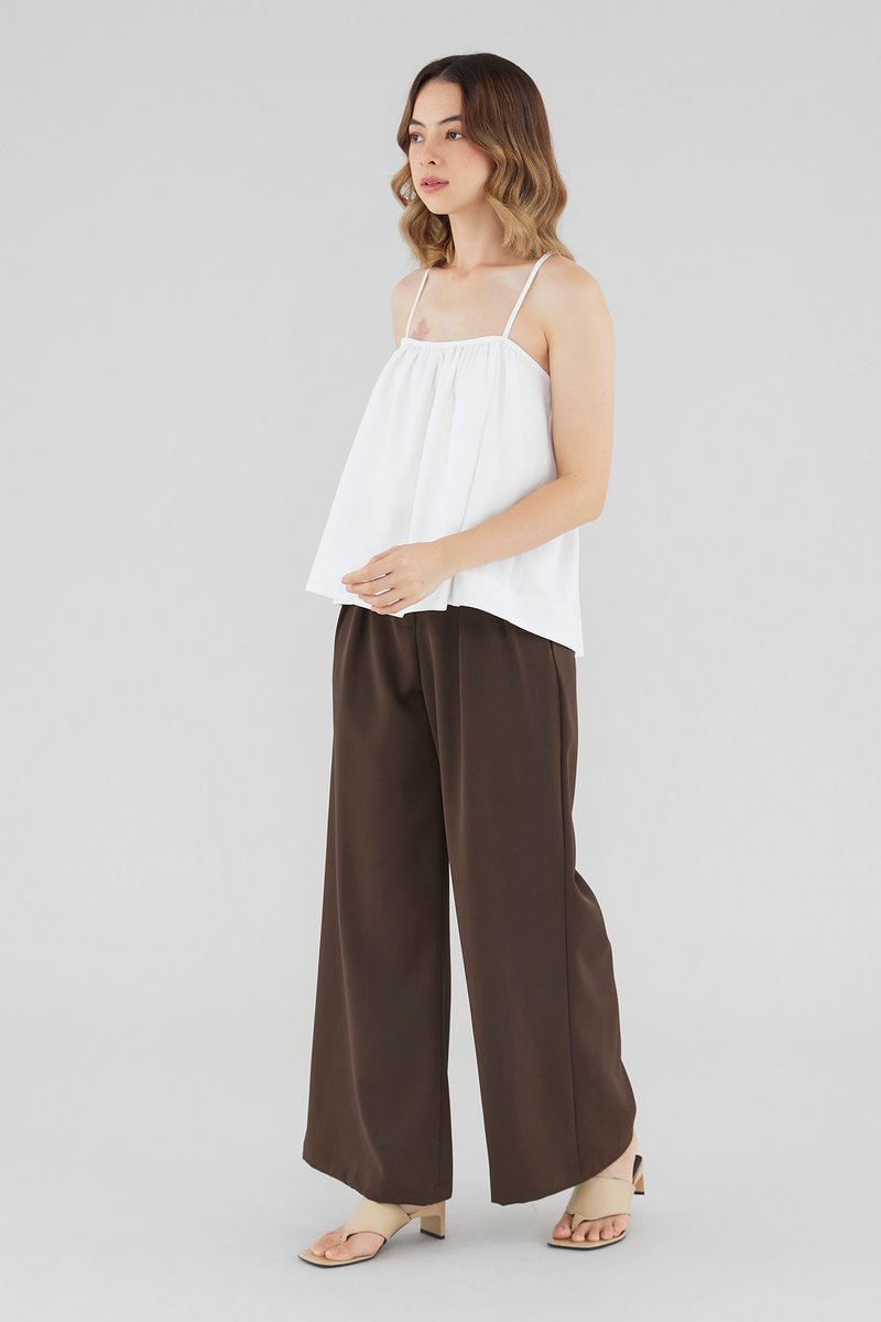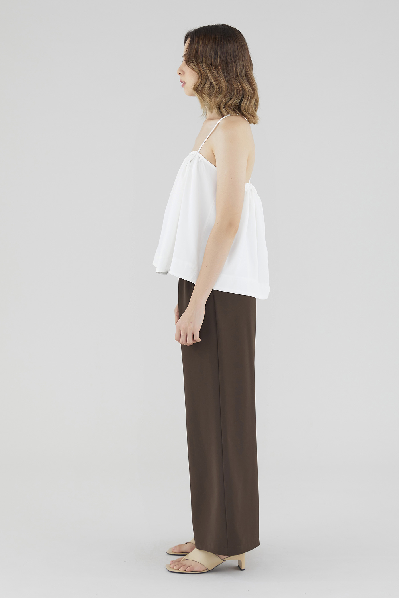 Versatile volume. Made from non-stretch fabric with a structured drape, this sleeveless top features a gathered straight neckline, slim non-adjustable straps that cross over at the back and a side zip closure. Fits relaxed in a flattering tent silhouette.