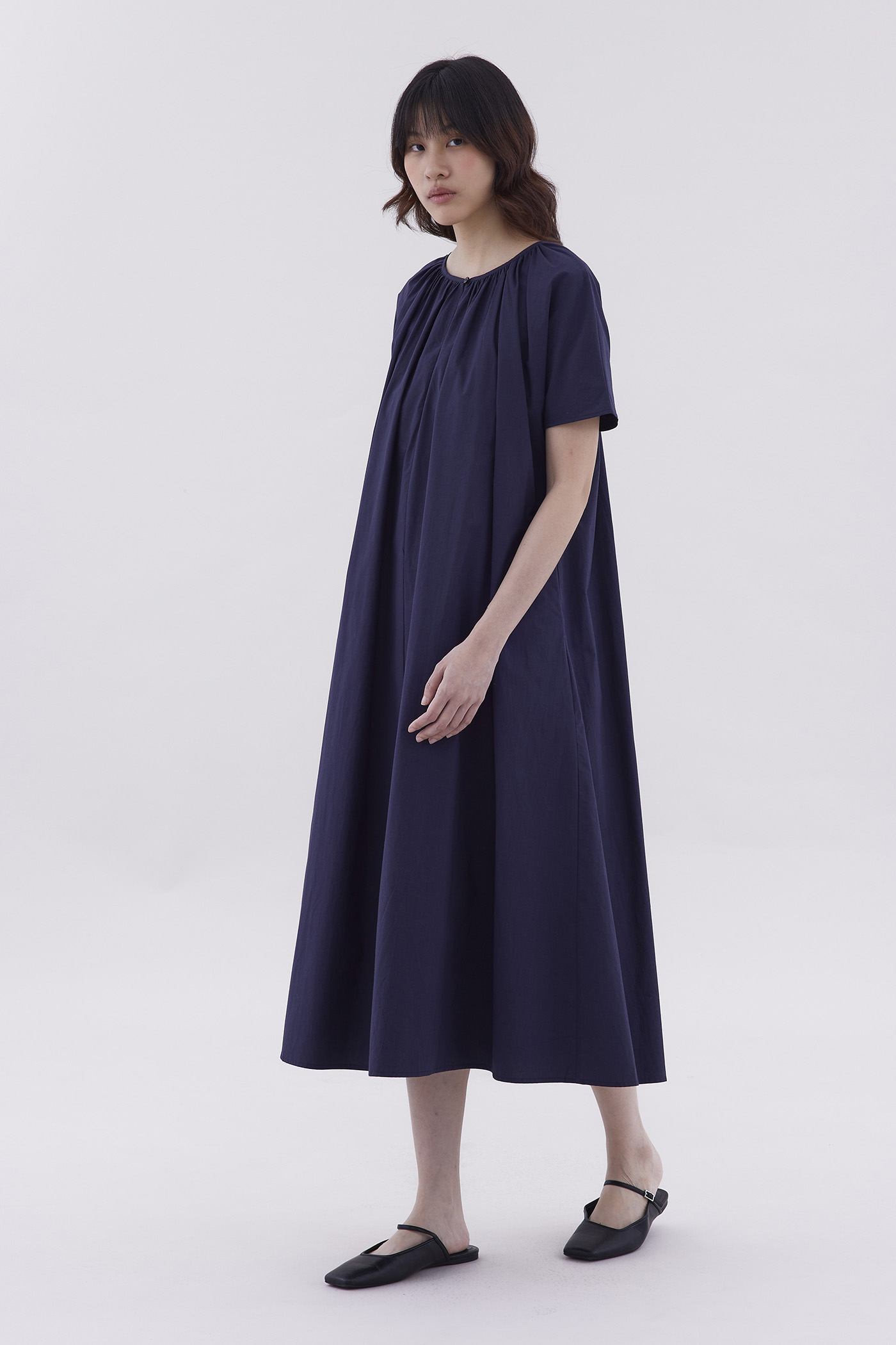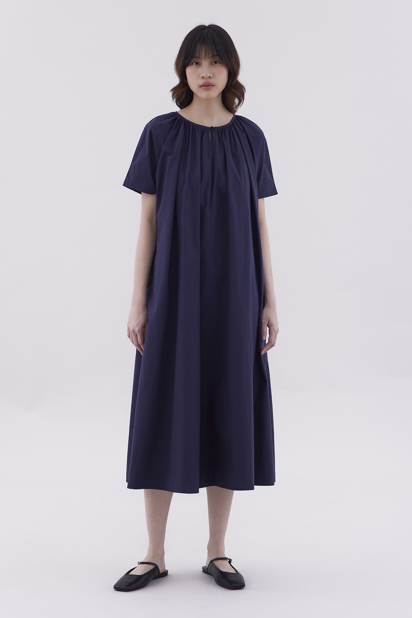A touch of texture. Made from smooth and softly structured cotton, this maxi dress features short sleeves and a gathered round neckline with a front button closure. Fits relaxed in a tent silhouette.