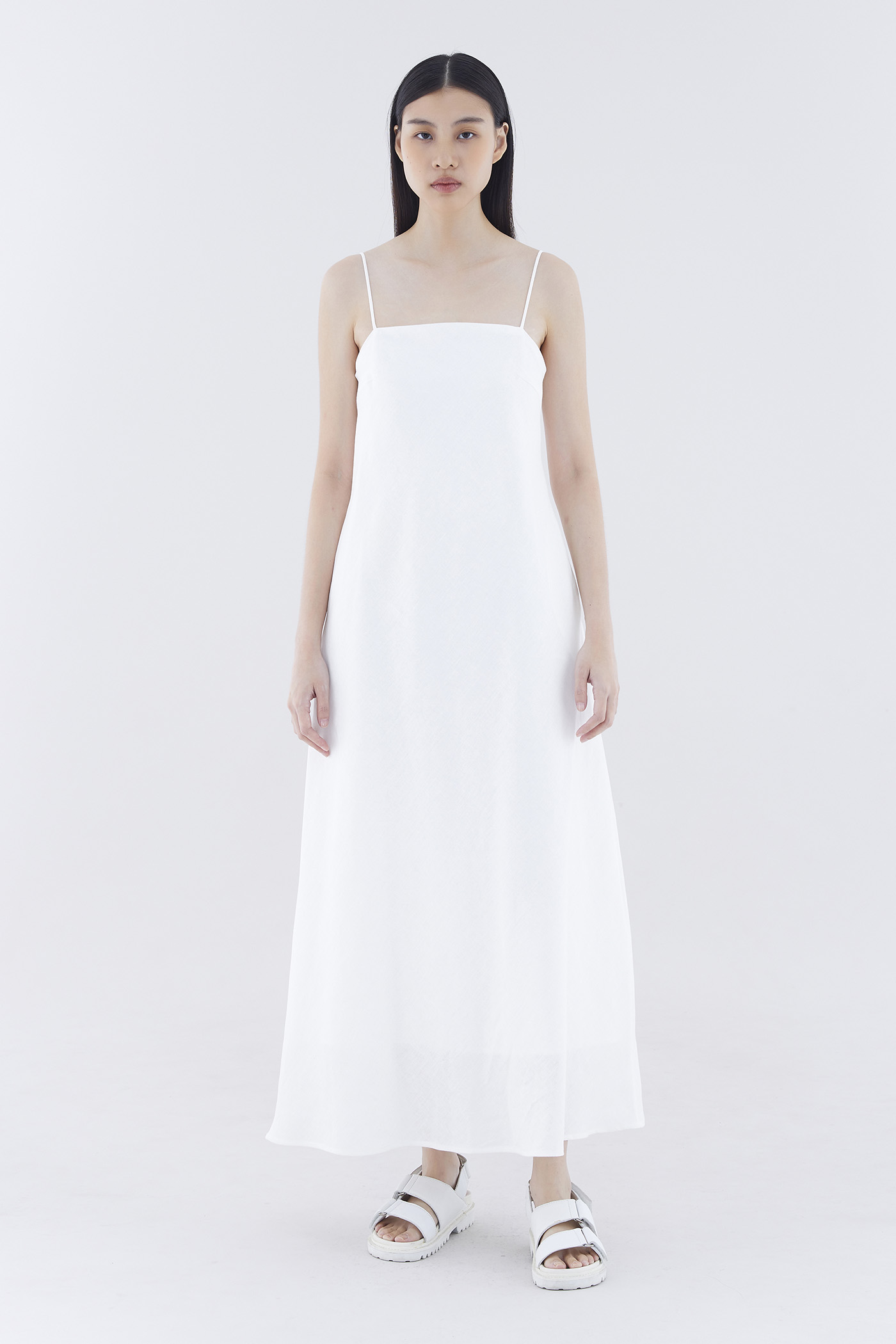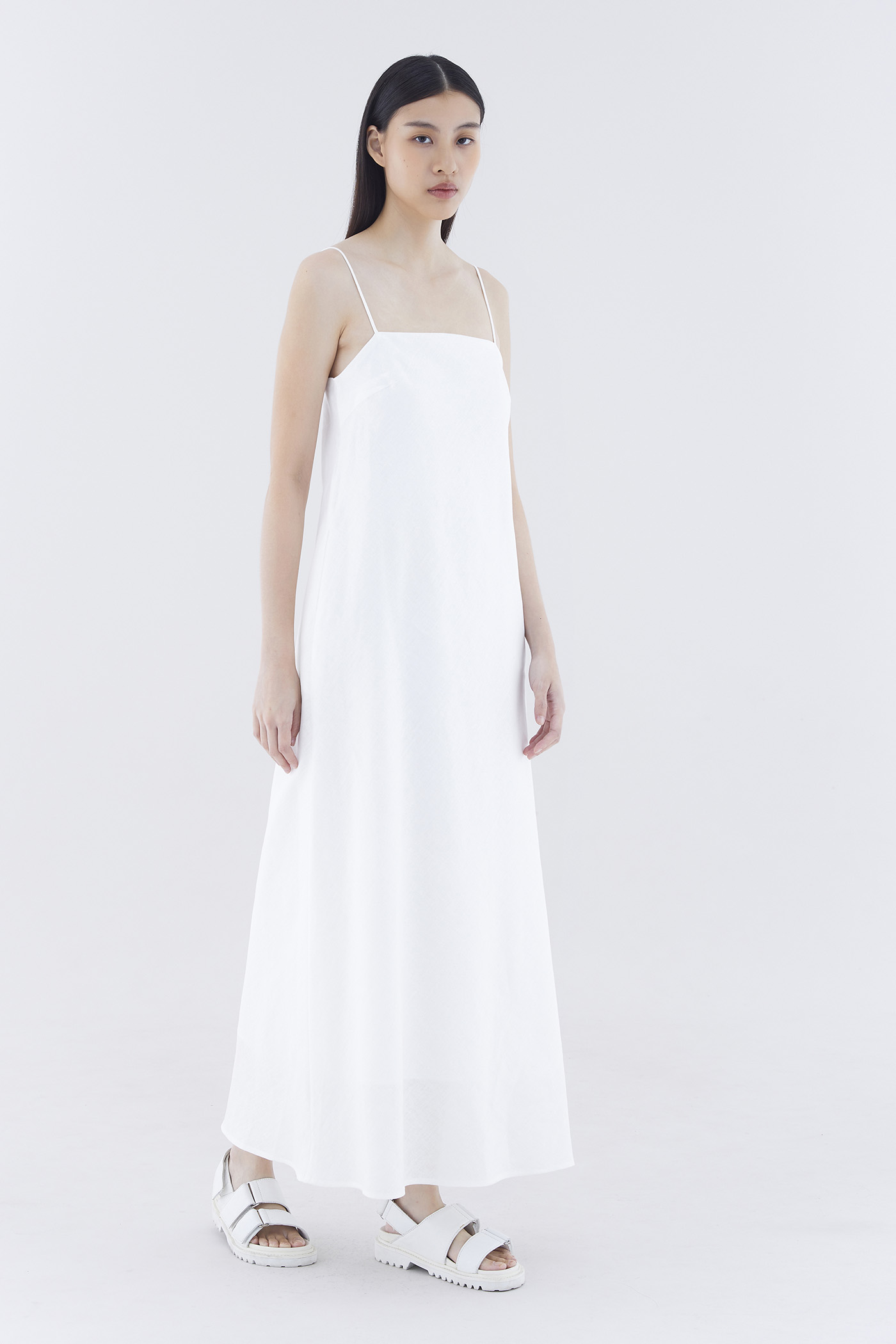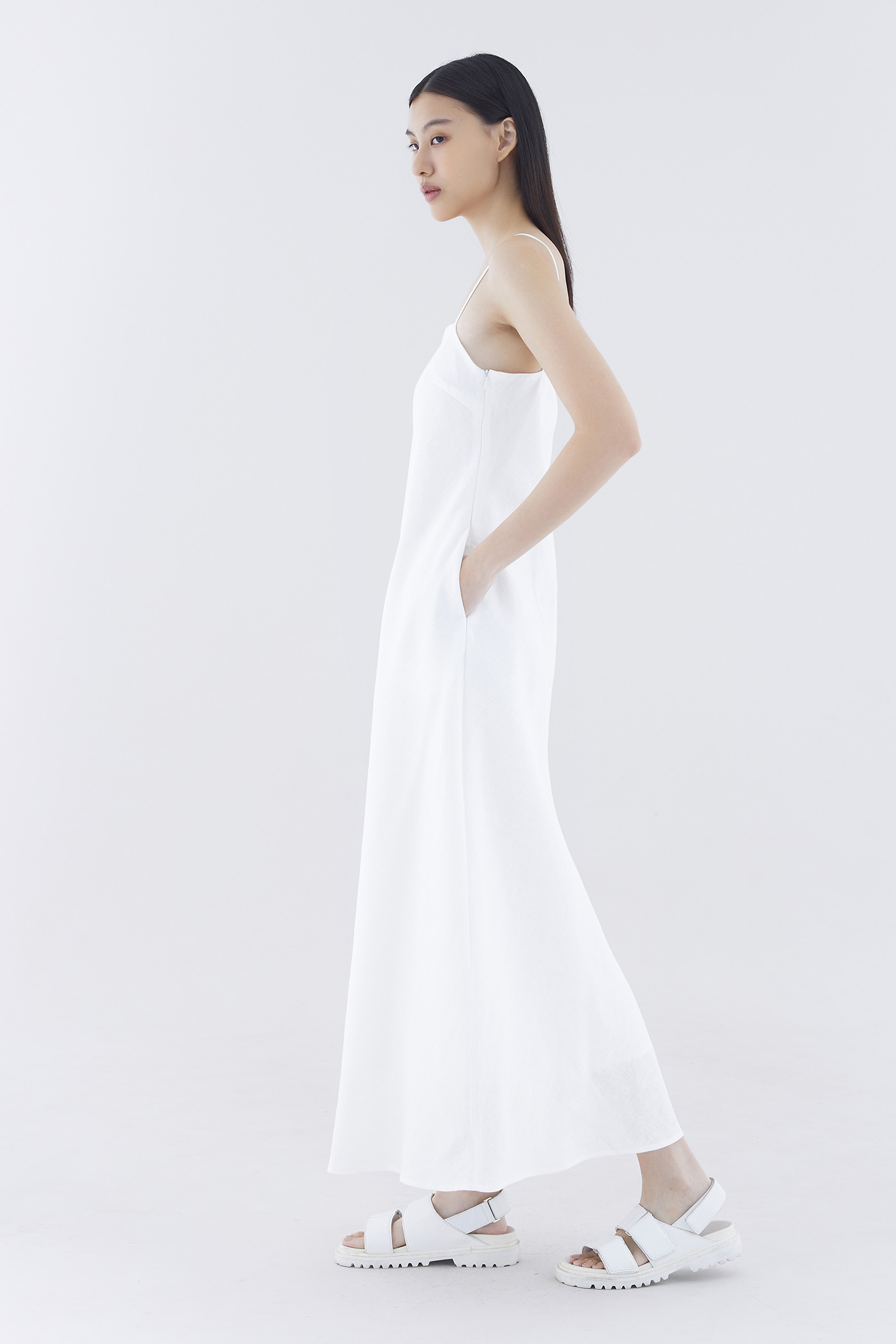 For your weekend plans. Cut from airy and gently tailored 100% linen, this sleeveless maxi dress features a bias-cut silhouette, a straight neckline, slim non-adjustable shoulder straps and a side zip closure. Worn in a relaxed fit.