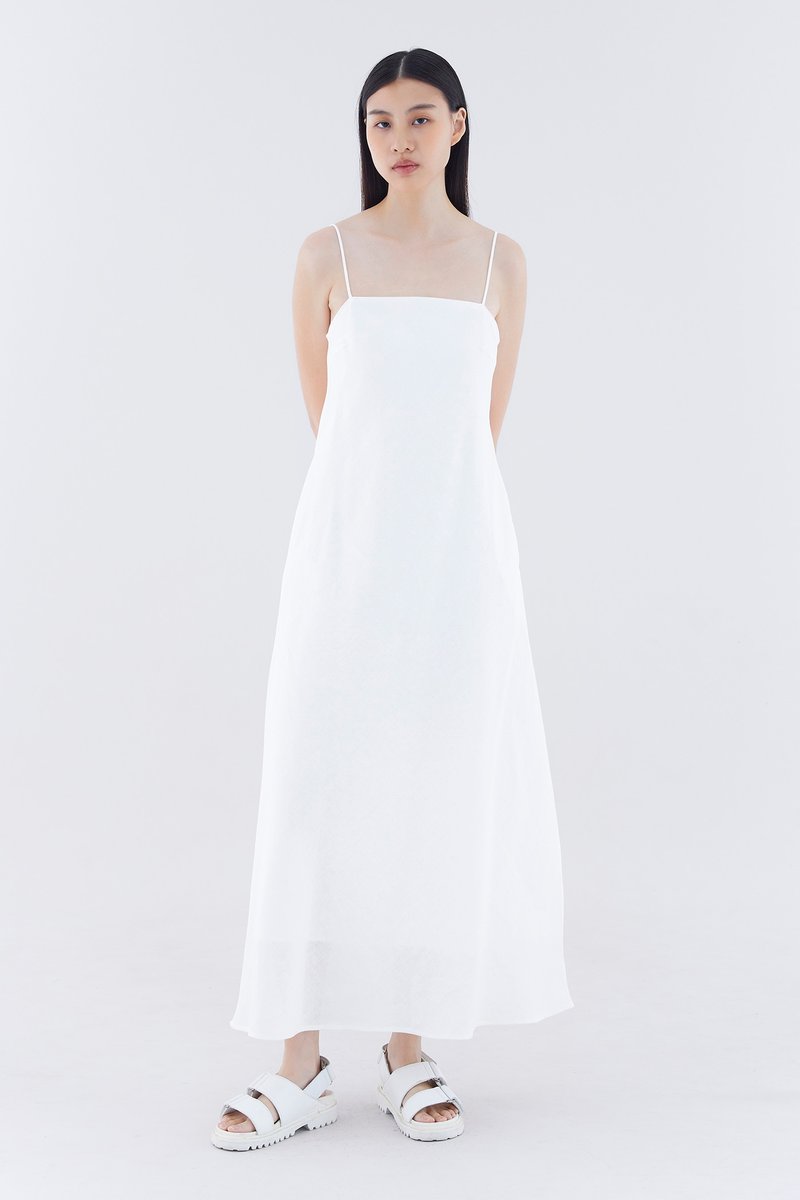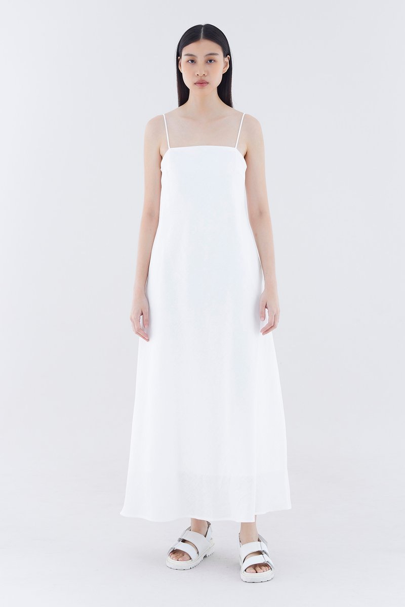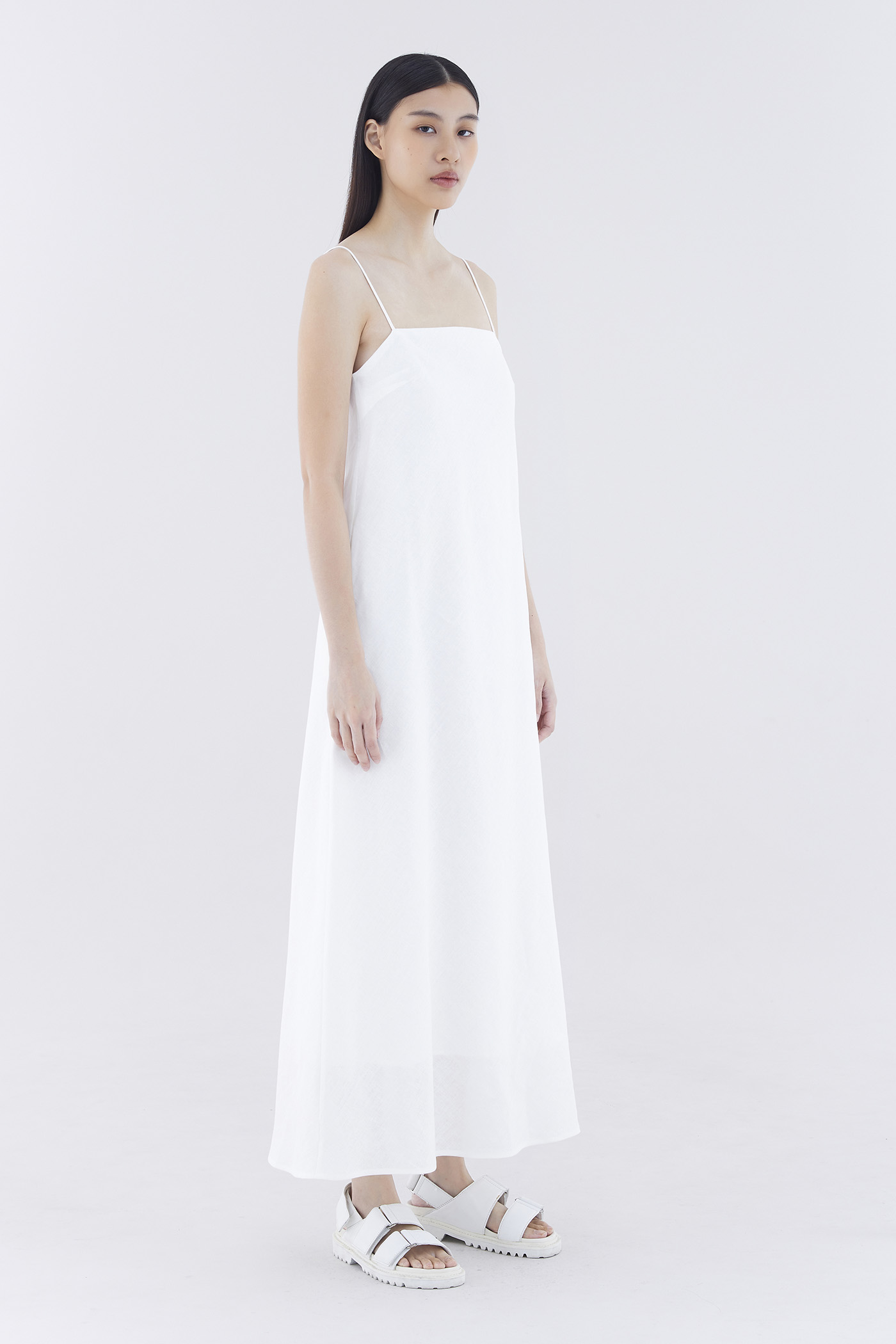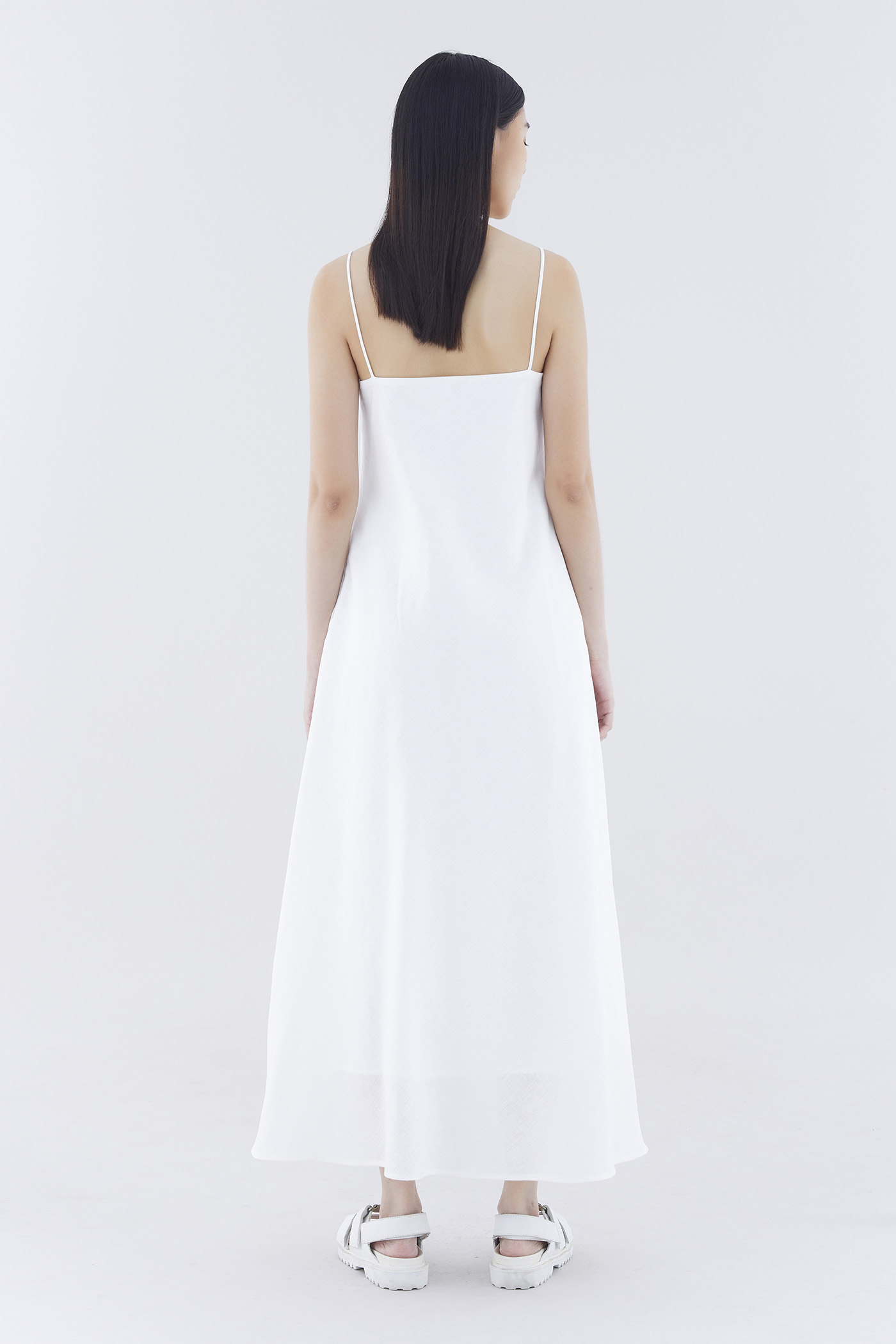 For your weekend plans. Cut from airy and gently tailored 100% linen, this sleeveless maxi dress features a bias-cut silhouette, a straight neckline, slim non-adjustable shoulder straps and a side zip closure. Worn in a relaxed fit.
