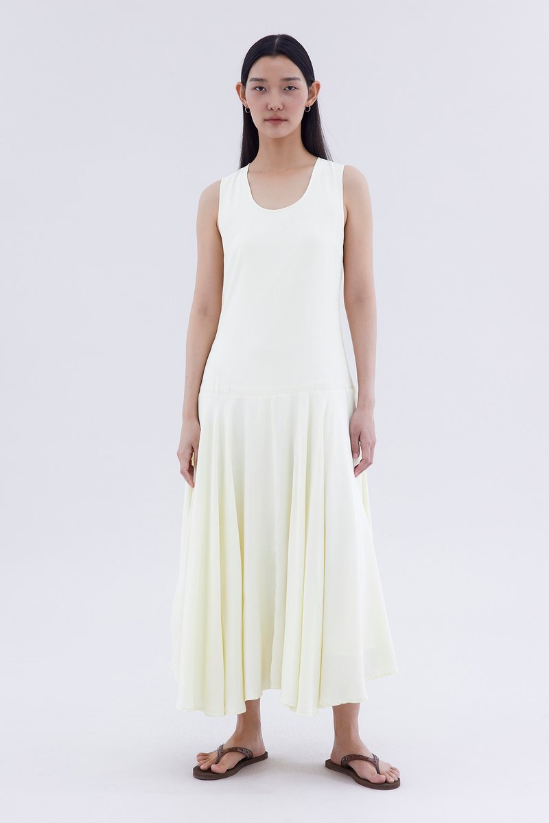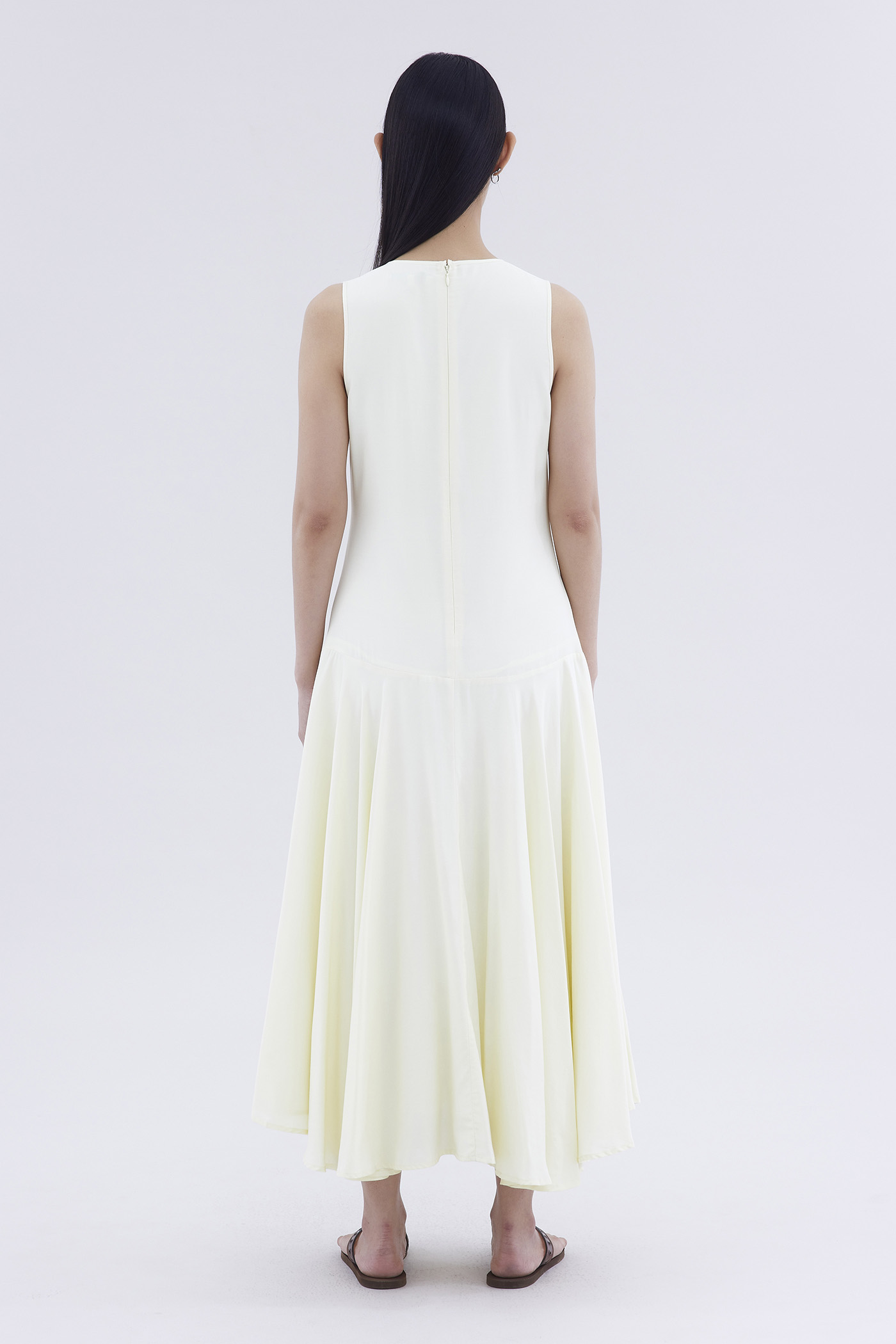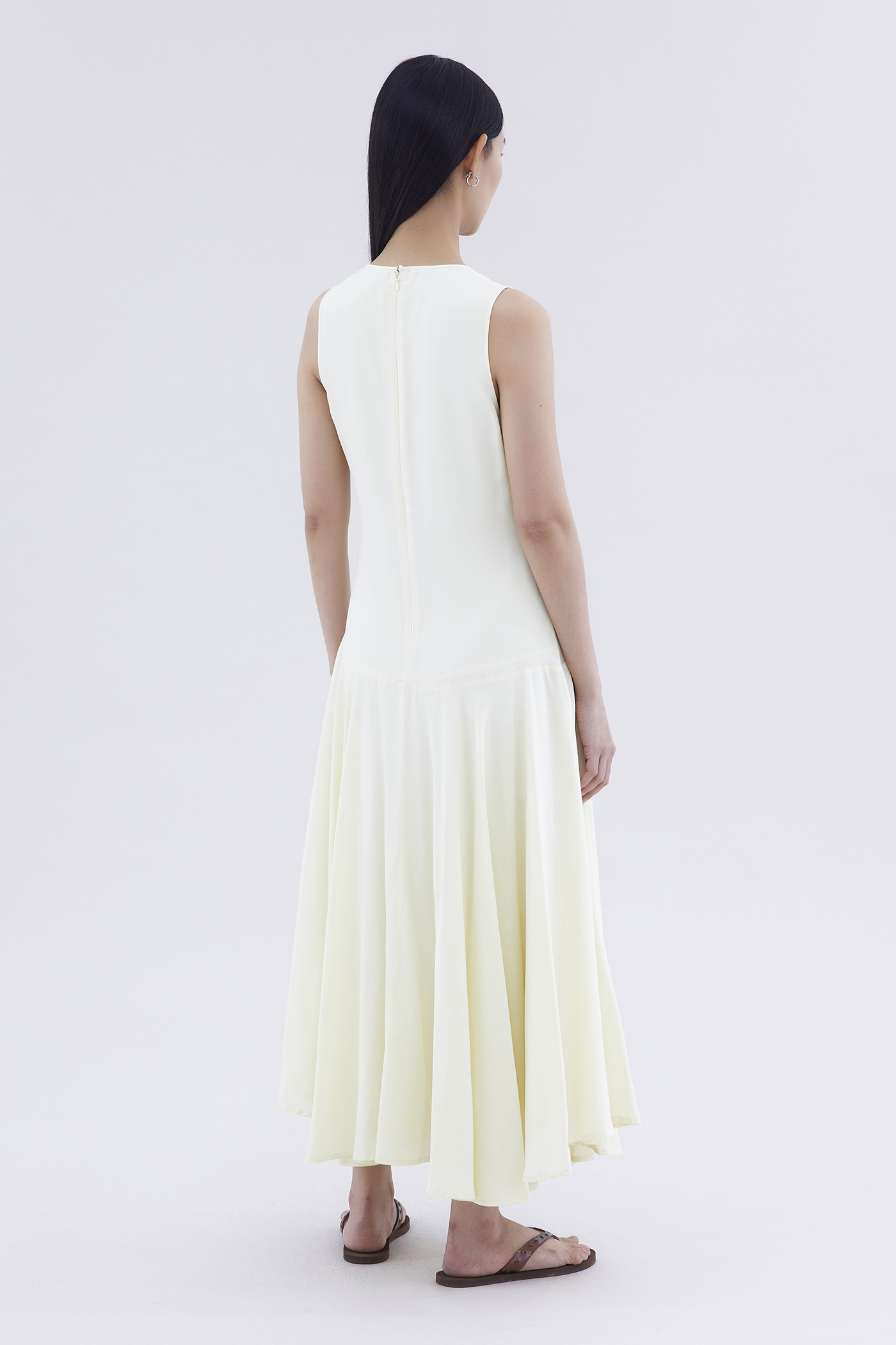 One and done. Made from smooth and drapey fabric, this sleeveless maxi dress features a flowy dropped waist, scoop neckline and back zip closure. Fits relaxed in a swing silhouette.