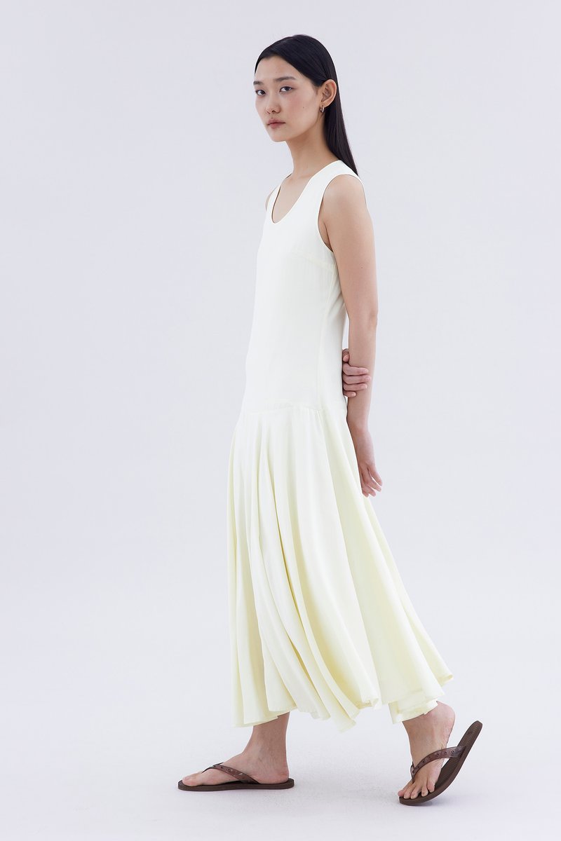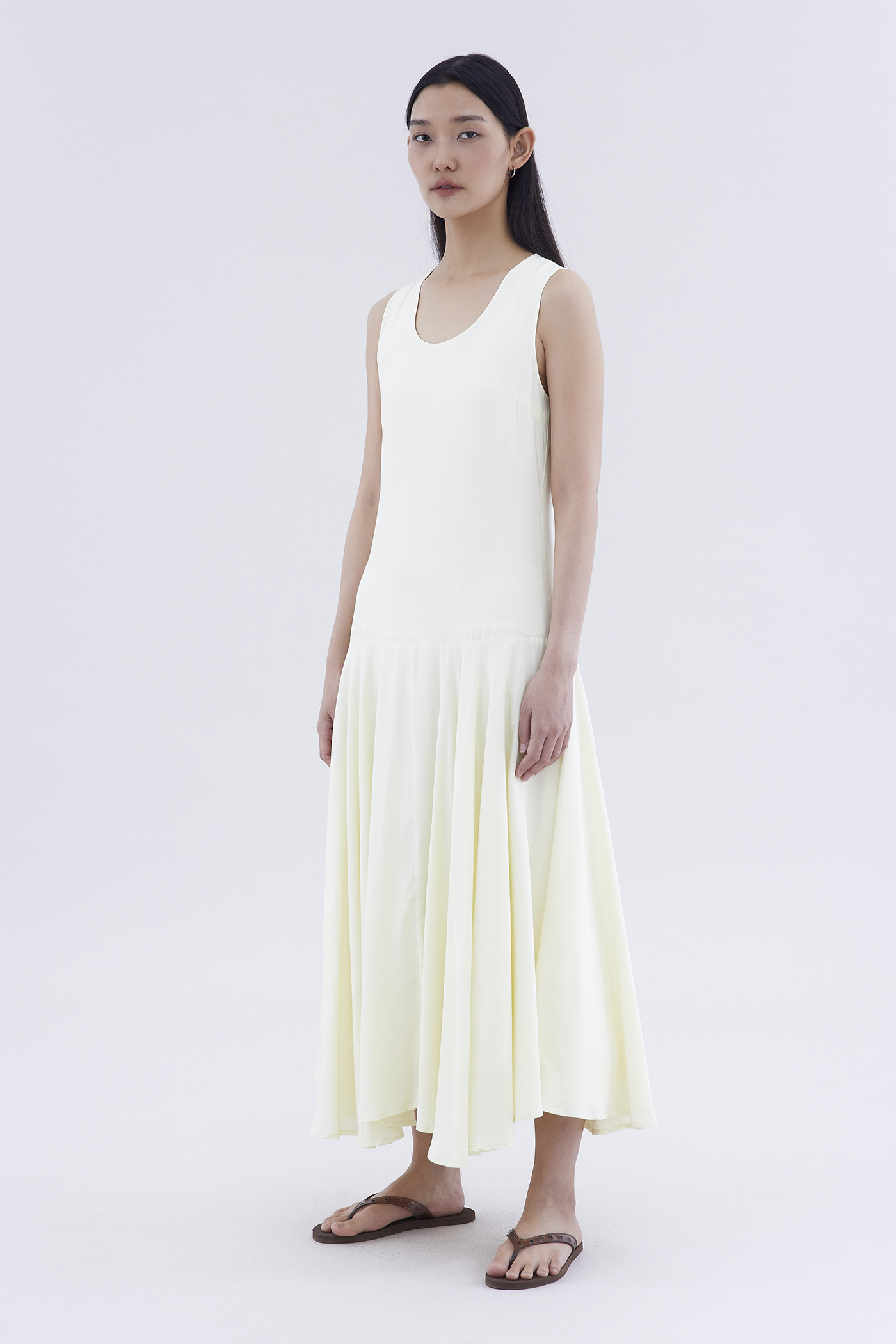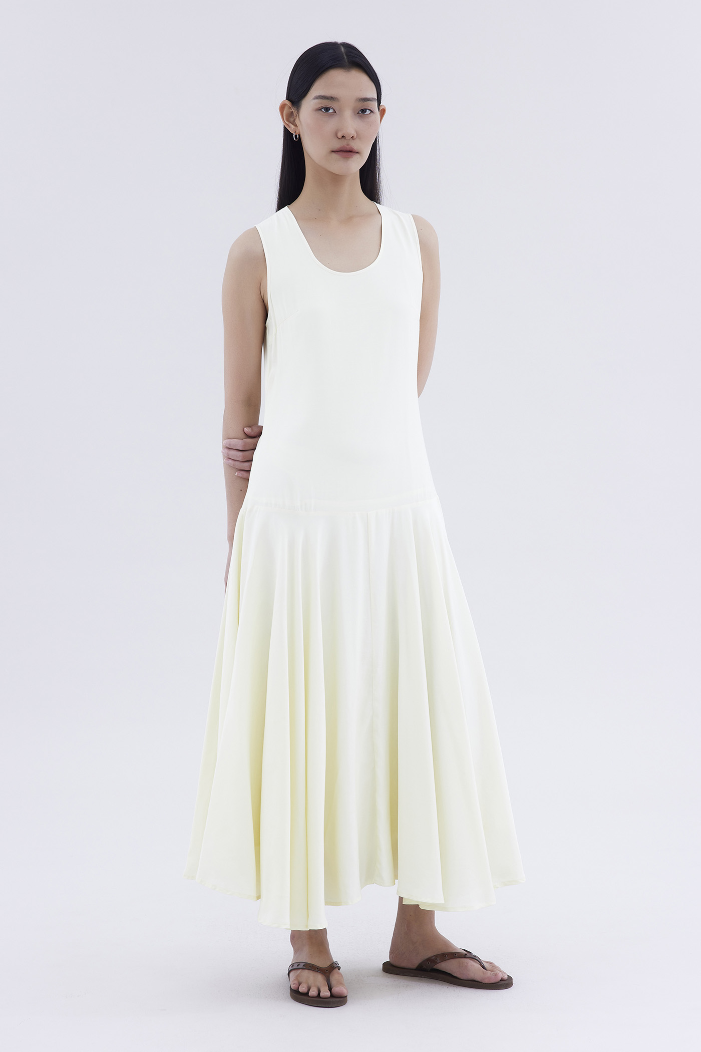 One and done. Made from smooth and drapey fabric, this sleeveless maxi dress features a flowy dropped waist, scoop neckline and back zip closure. Fits relaxed in a swing silhouette.