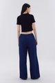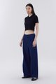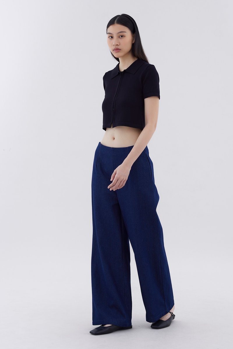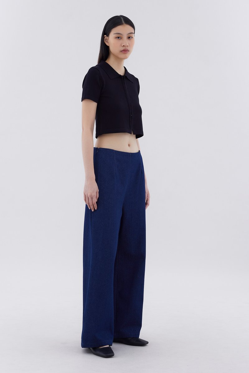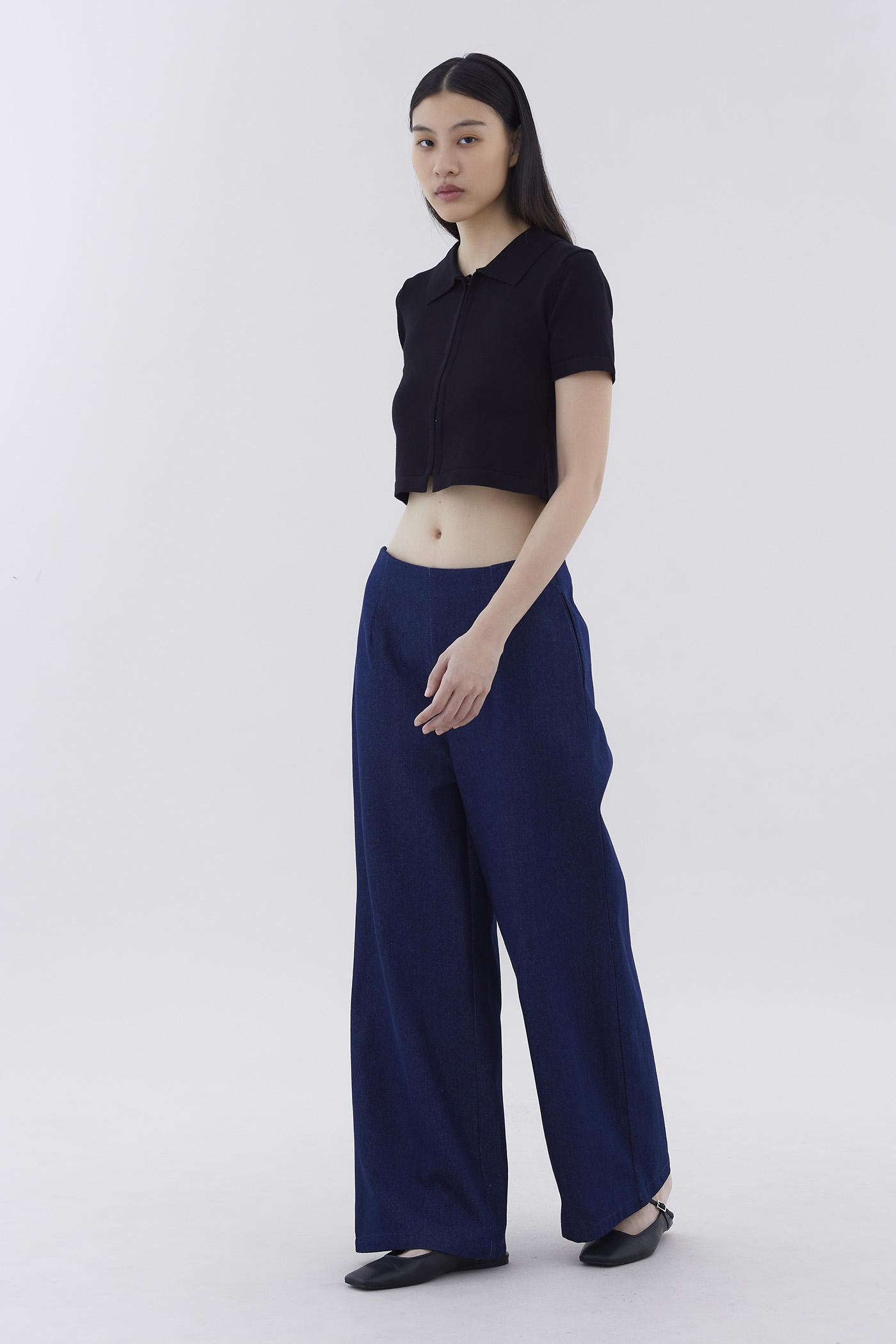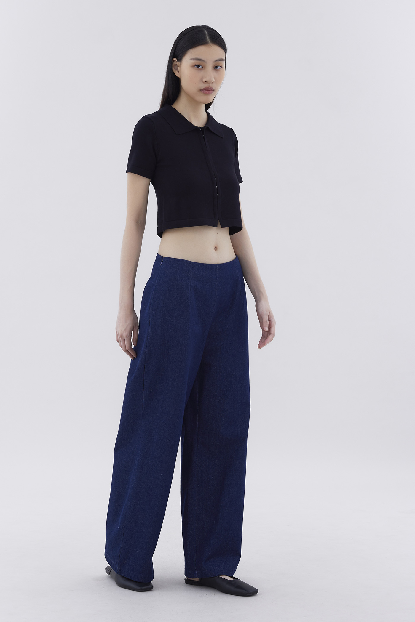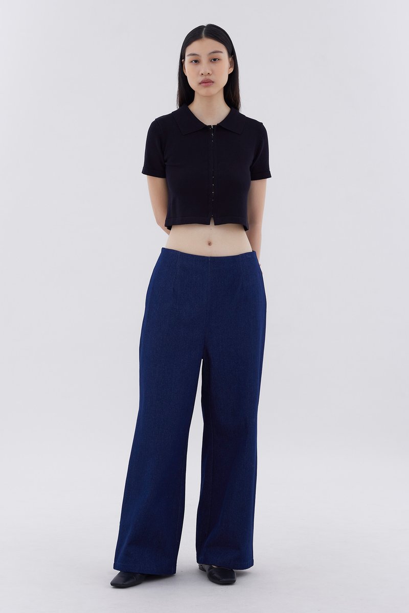 Switch up your jeans. Made from non-sheer and softly structured cotton, these high-rise denim pants feature a seamless waistband, wide legs and side zip closure. Worn in a relaxed fit.
