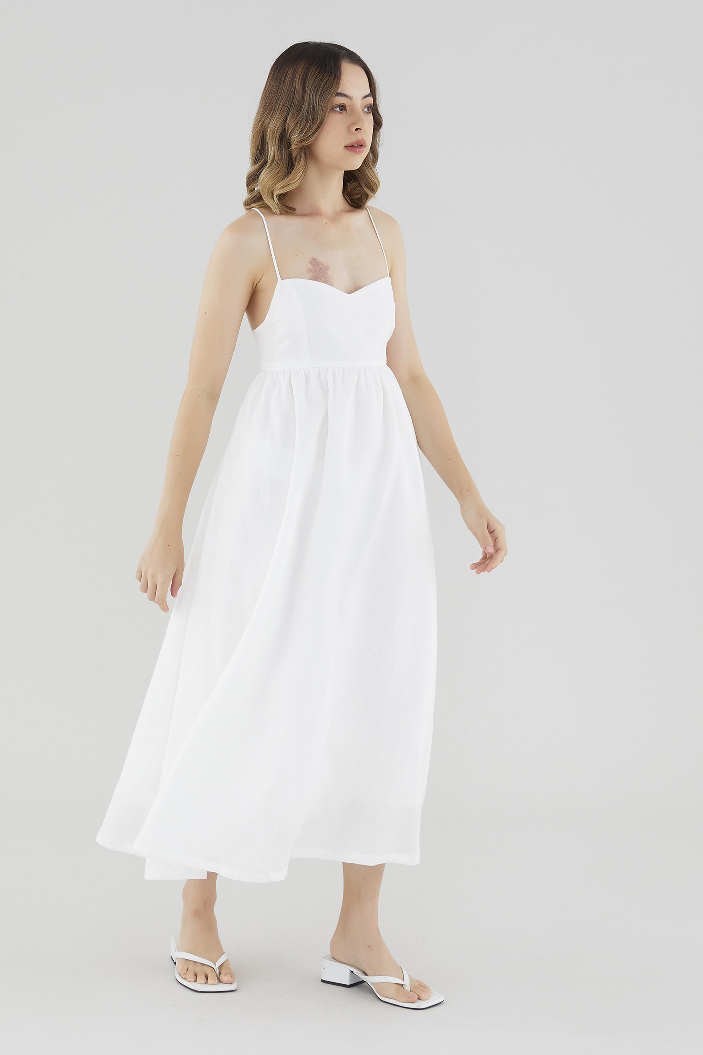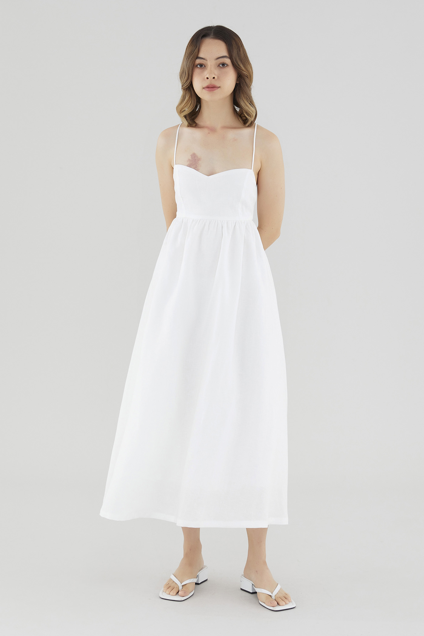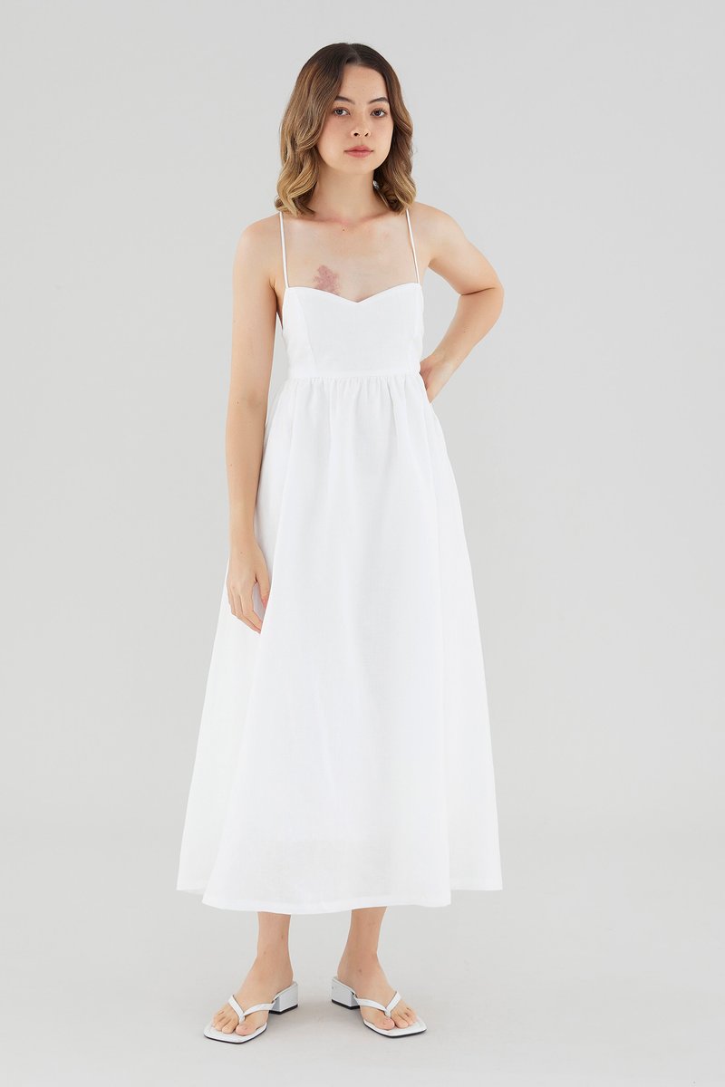 Your beach-to-brunch dress. Cut from airy and softly tailored 100% linen, this sleeveless A-line maxi features a dipped neckline and back-tie shoulder straps, along with a cut-out and elasticated band on the back. Fits slimmer through the bodice before flaring out in a relaxed skirt.