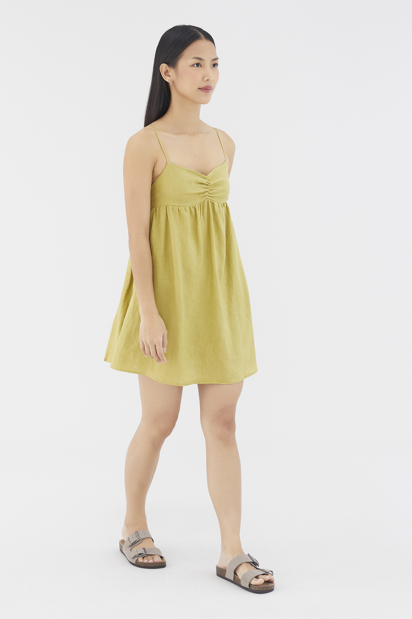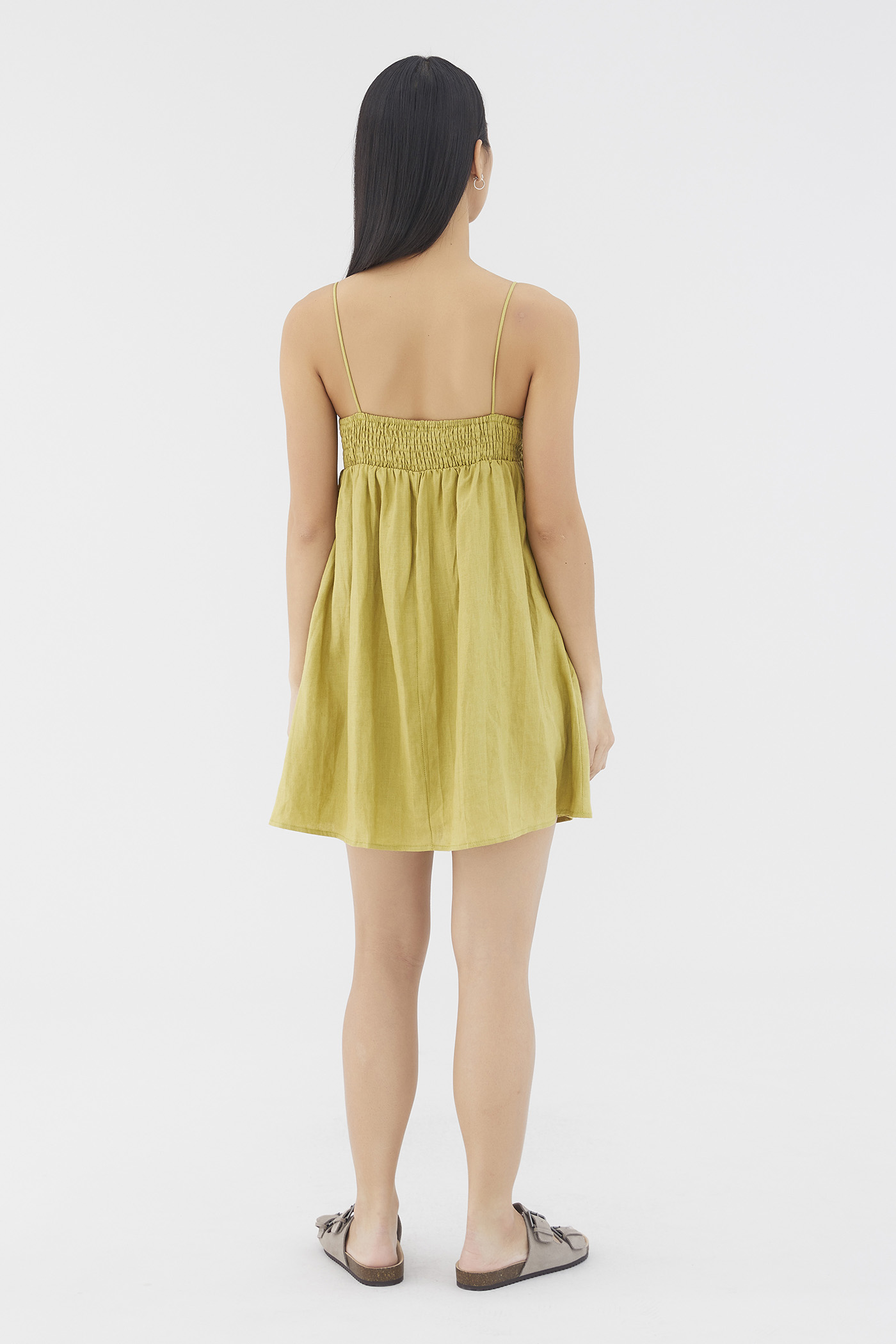 Warm weather approved. Cut from airy and lightweight 100% linen, this sleeveless mini dress features a dipped neckline, a ruched bust, slim non-adjustable shoulder straps, a smocked back and a side zip closure. Worn in an empire-waist silhouette that fits slimmer at the bust before flaring out in a relaxed skirt.