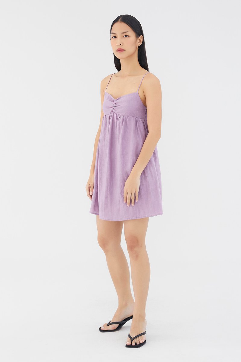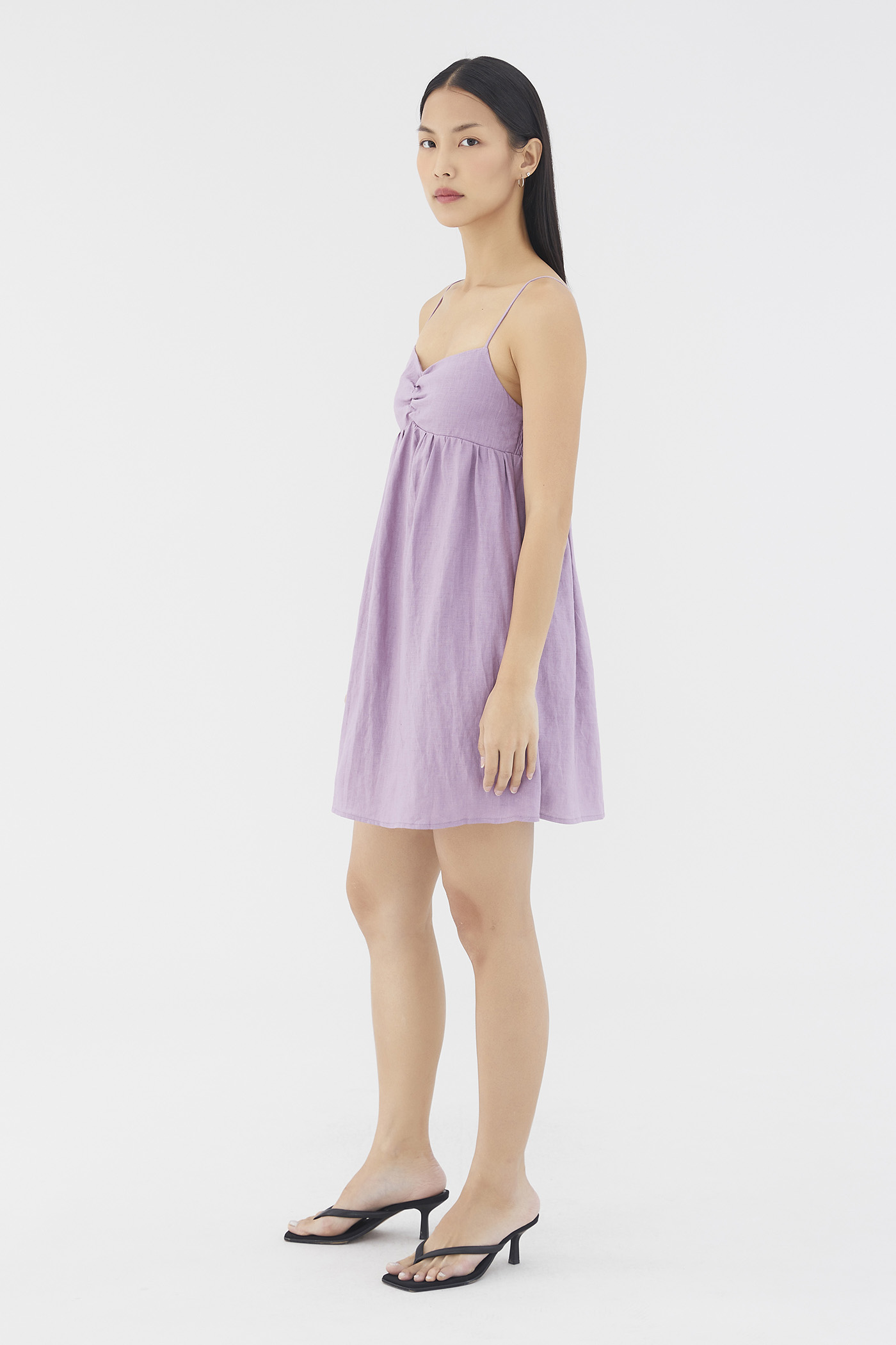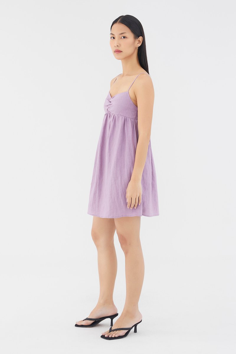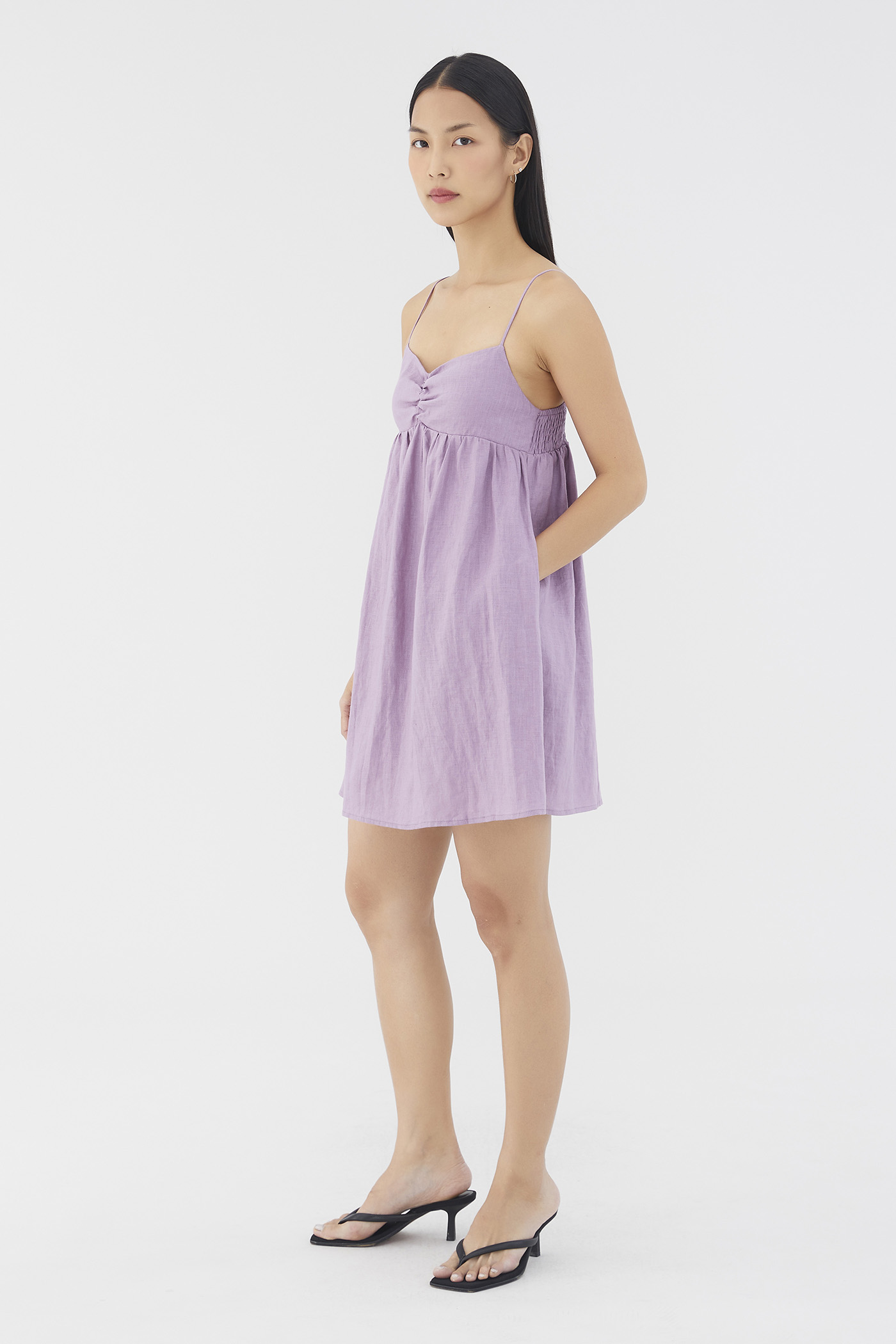 Warm weather approved. Cut from airy and lightweight 100% linen, this sleeveless mini dress features a dipped neckline, a ruched bust, slim non-adjustable shoulder straps, a smocked back and a side zip closure. Worn in an empire-waist silhouette that fits slimmer at the bust before flaring out in a relaxed skirt.