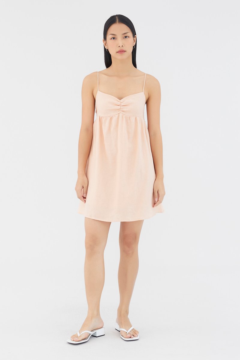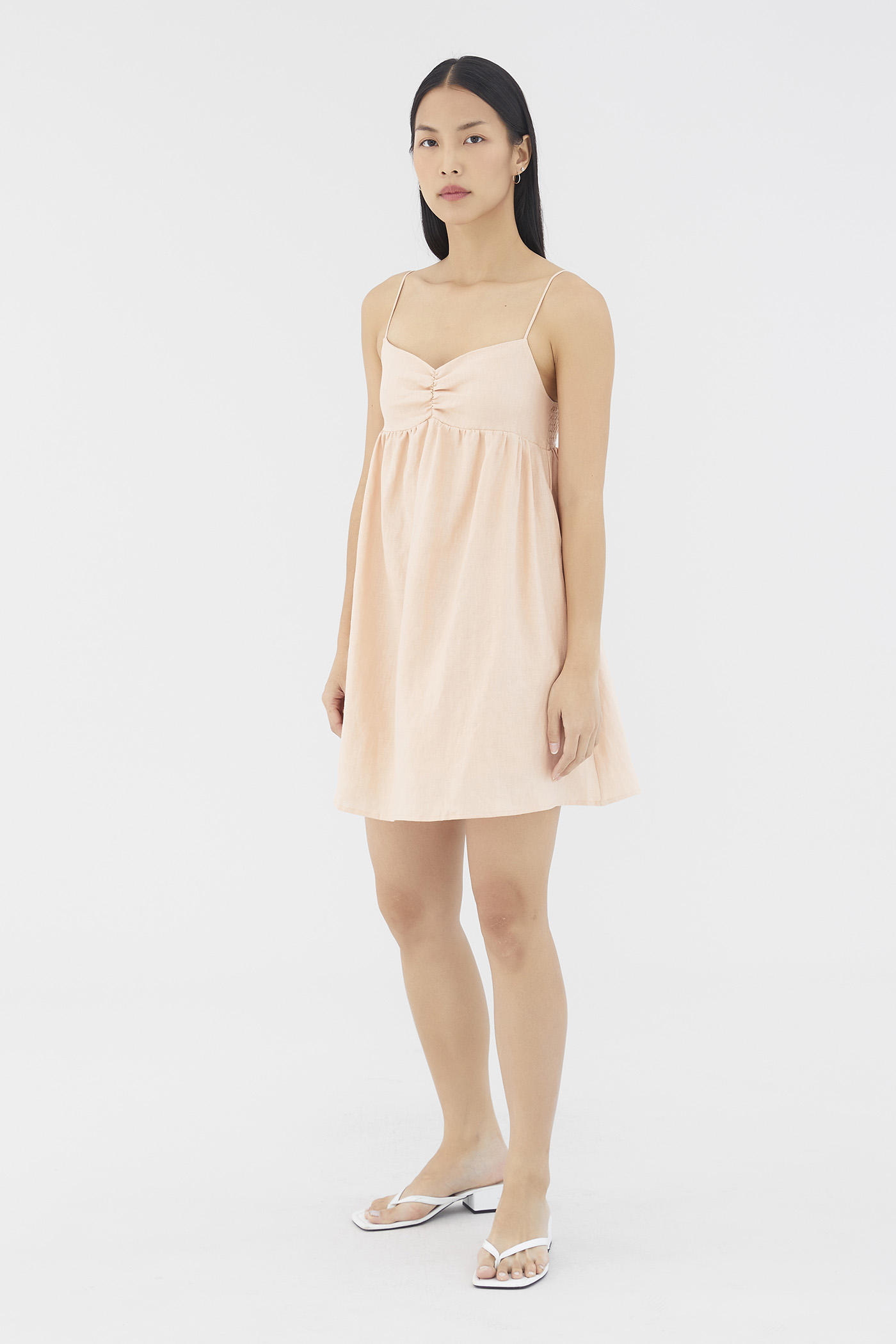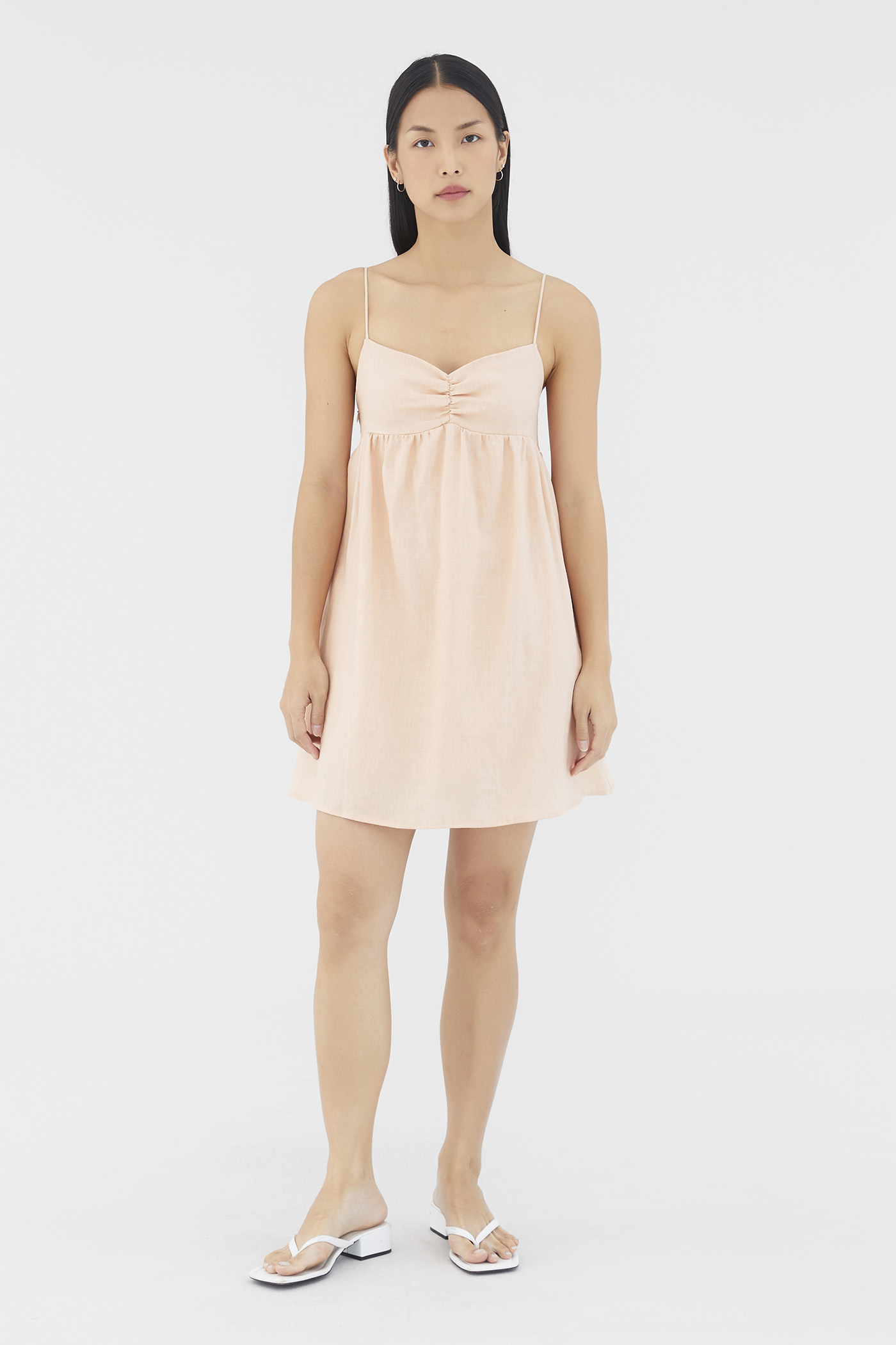 Warm weather approved. Cut from airy and lightweight 100% linen, this sleeveless mini dress features a dipped neckline, a ruched bust, slim non-adjustable shoulder straps, a smocked back and a side zip closure. Worn in an empire-waist silhouette that fits slimmer at the bust before flaring out in a relaxed skirt.