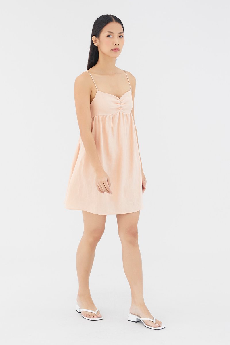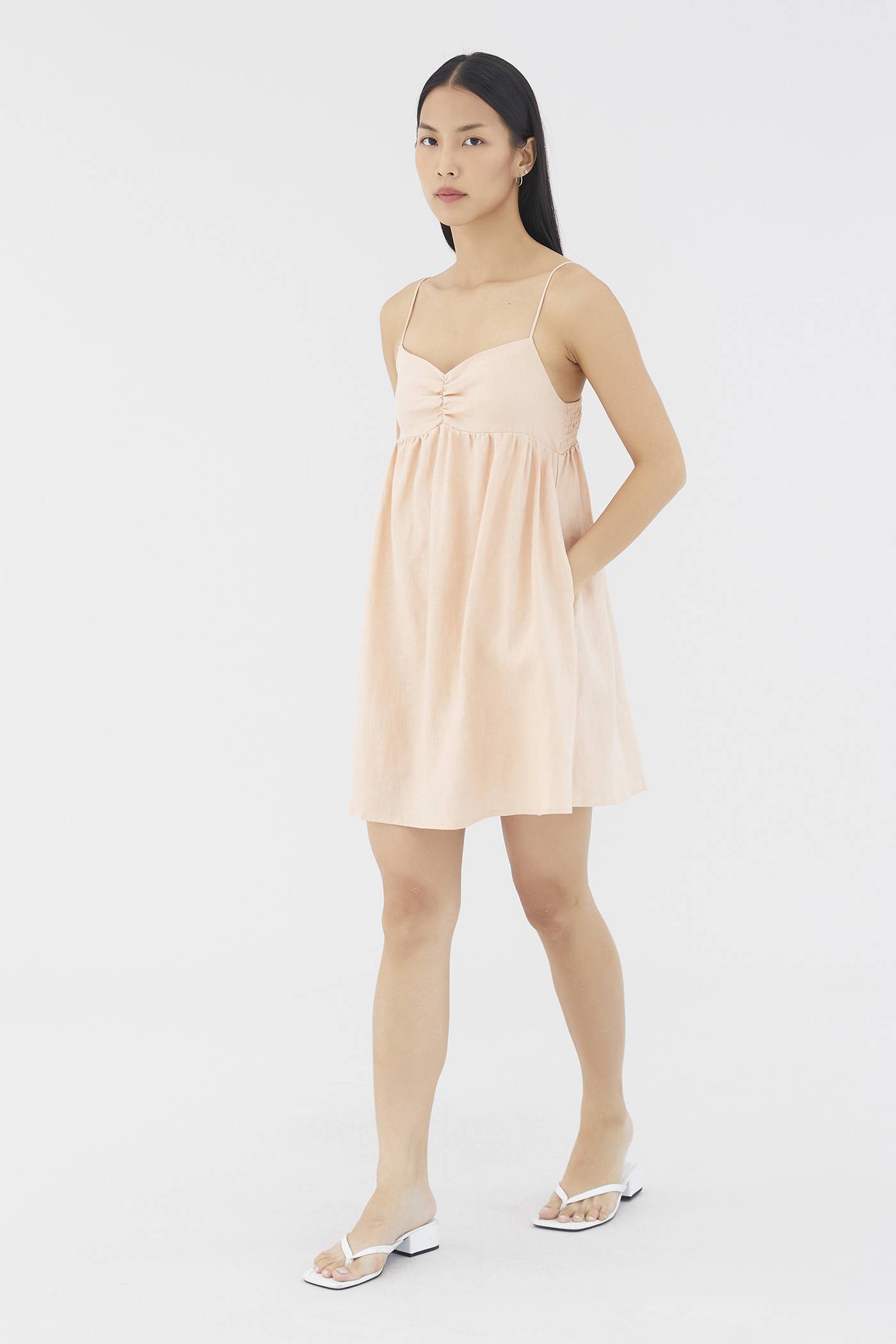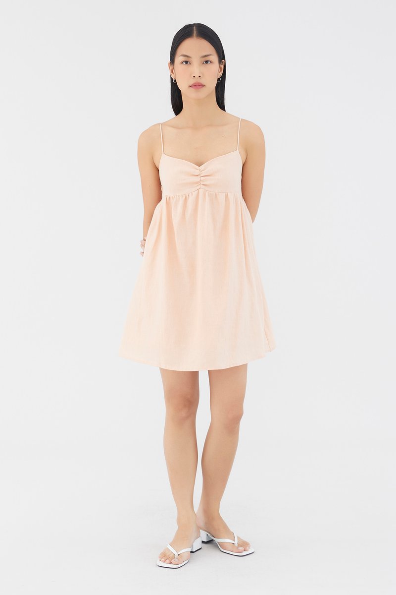 Warm weather approved. Cut from airy and lightweight 100% linen, this sleeveless mini dress features a dipped neckline, a ruched bust, slim non-adjustable shoulder straps, a smocked back and a side zip closure. Worn in an empire-waist silhouette that fits slimmer at the bust before flaring out in a relaxed skirt.