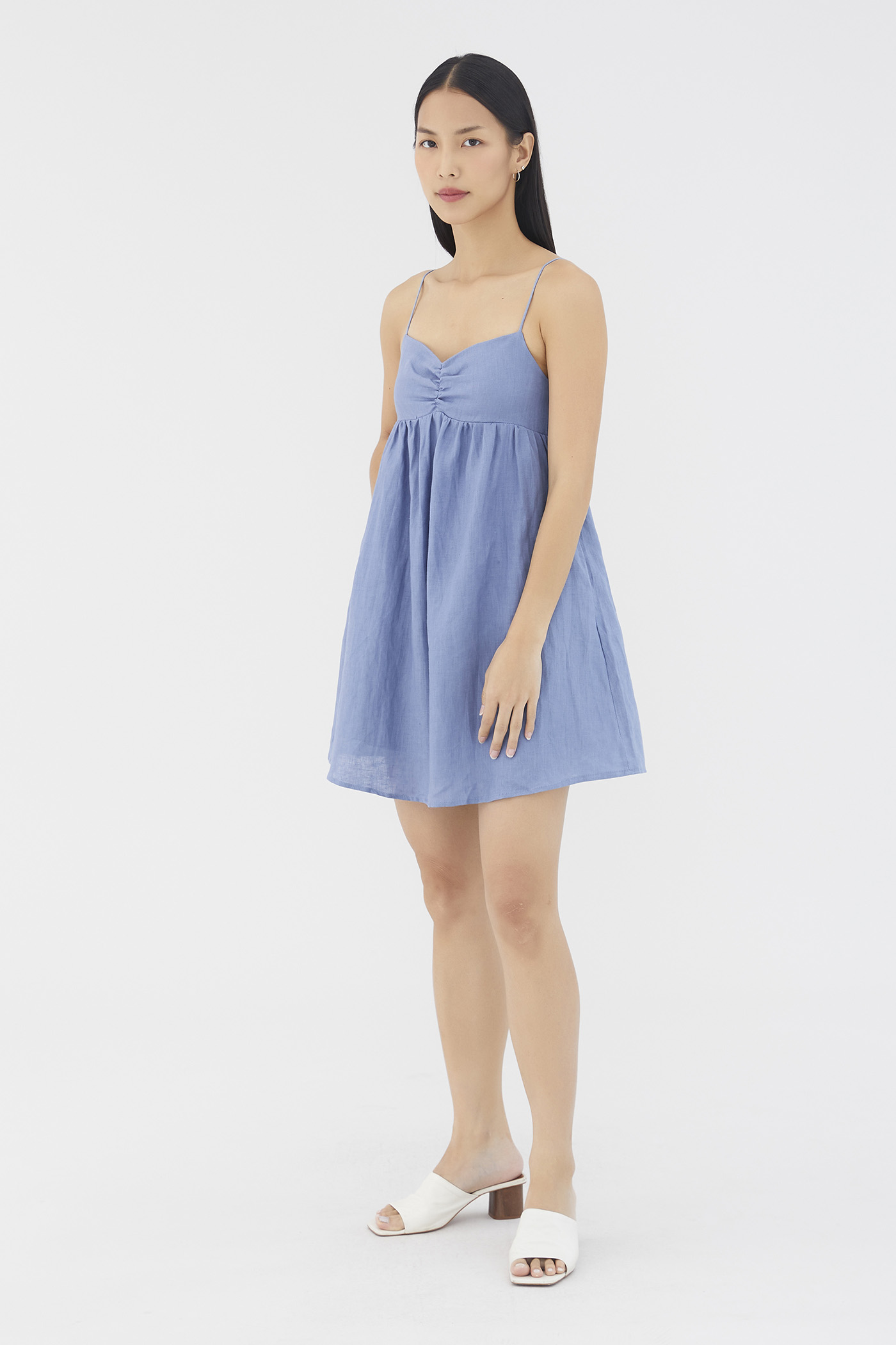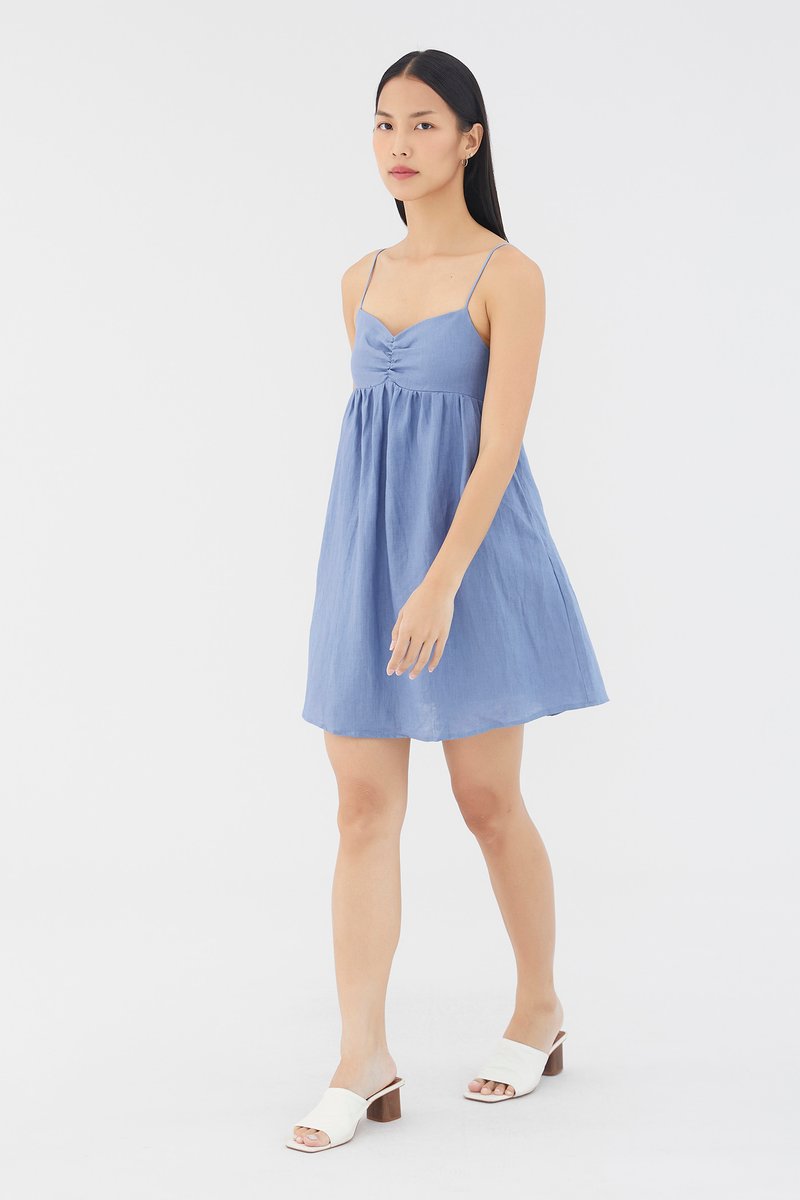 Warm weather approved. Cut from airy and lightweight 100% linen, this sleeveless mini dress features a dipped neckline, a ruched bust, slim non-adjustable shoulder straps, a smocked back and a side zip closure. Worn in an empire-waist silhouette that fits slimmer at the bust before flaring out in a relaxed skirt.